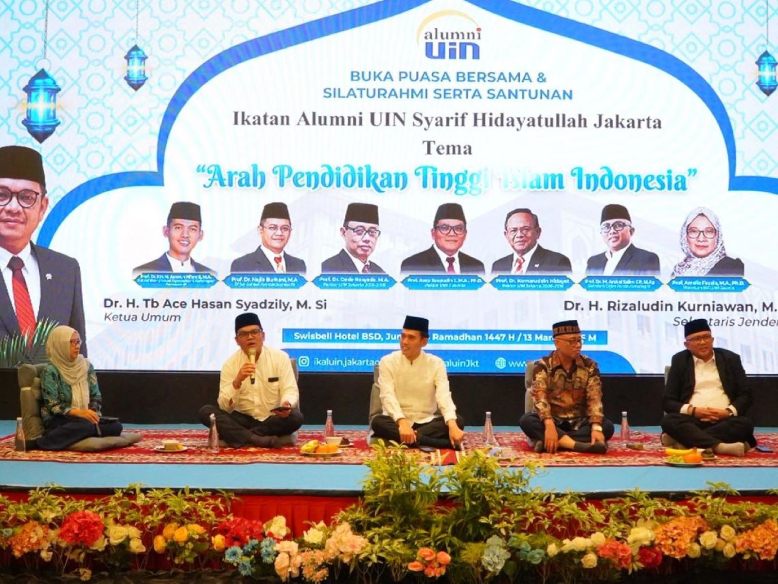 حضر هذا الحدث الودي عدد من الإداريين وشخصيات الخريجين وقادة الجامعة، وكان من بينهم الرئيس العام لرابطة خريجي جامعة سريف هداية الله جاكرتا الإسلامية الحكومية، الدكتور هـ. ت. ب. أيس حسن سيدزيلي، الأمين العام لـ IKALUIN، والدكتور ح. رضا الدين كورنياوان، الحاصل على درجة الماجستير، أمين المديرية العامة للتعليم الإسلامي بوزارة الشؤون الدينية، والبروفيسور أرسل سليم، الحاصل على درجتي الماجستير والدكتوراه، المدير العام للعلوم والتكنولوجيا بوزارة التعليم والتكنولوجيا، والبروفيسور الدكتور أحمد نجيب برهاني، الحاصل على درجة الماجستير، ورئيس مجلس الفتوى المركزي لمجلس العلماء الإندونيسي (MUI)، البروفيسور الدكتور ح. م. أسرورون نيام شوله، الحاصل على درجة الماجستير، ورئيس جامعة جاكرتا الإسلامية الحكومية للفترة 2014-2019، البروفيسور الدكتور ديدي روسيادا، الحاصل على درجة الماجستير. خلال الفعالية، أوضح البروفيسور أسيب أن تطوير جامعة جاكرتا الإسلامية الحكومية يركز حاليًا على ثلاثة جوانب رئيسية: تعزيز سمعتها العلمية، وتسريع التحول المؤسسي، واكتساب اعتراف دولي. لتعزيز سمعتها العلمية، أكد رئيس الجامعة، آسيب جهار، على أهمية ترسيخ الثقافة الأكاديمية في الحرم الجامعي. ووفقًا له، فإن الثقافة الأكاديمية القوية هي الأساس لظهور أعمال علمية عالية الجودة، والابتكار، والتقاليد الفكرية في جامعة جاكرتا الإسلامية الحكومية. وقال: "إن السمعة العلمية المرموقة تتطلب ثقافة أكاديمية داعمة. وهذا ما نواصل تعزيزه في جامعة جاكرتا الإسلامية الحكومية". وفيما يتعلق بالتحول المؤسسي، أوضح رئيس الجامعة، آسيب جهار، أن مسيرة جامعة جاكرتا الإسلامية الحكومية هي عملية تغيير مستمرة. بدأ التحول مع أكاديمية الدراسات الدينية (ADIA)، ثم أصبحت الجامعة الإسلامية الإسلامية في جاكرتا (IAIN)، وتطورت في نهاية المطاف إلى جامعة ذات وضع رسمي. علاوة على ذلك، وفيما يتعلق بالحوكمة المؤسسية، تواصل جامعة جاكرتا الإسلامية الحكومية (UIN Jakarta) تطوير وضعها المؤسسي من وحدة عمل (Satker)، ثم وكالة خدمة عامة (BLU)، وهي تسعى حاليًا لتصبح جامعة دينية حكومية ذات كيان قانوني (PTKN-BH). وأوضح قائلاً: "هذا التغيير هو عملية تحول مستمرة لتعزيز حوكمة المؤسسة واستقلاليتها وتنافسيتها". وأخيرًا، وبالتركيز على الاعتراف الدولي، أكد رئيس الجامعة أن الاعتراف العالمي ضرورة حتمية لمؤسسات التعليم العالي اليوم. وأضاف أن جامعة جاكرتا الإسلامية الحكومية (UIN Jakarta) تواصل تشجيع مختلف البرامج الدراسية على الحصول على الاعتماد الدولي وتحسين موقعها في مختلف تصنيفات الجامعات.