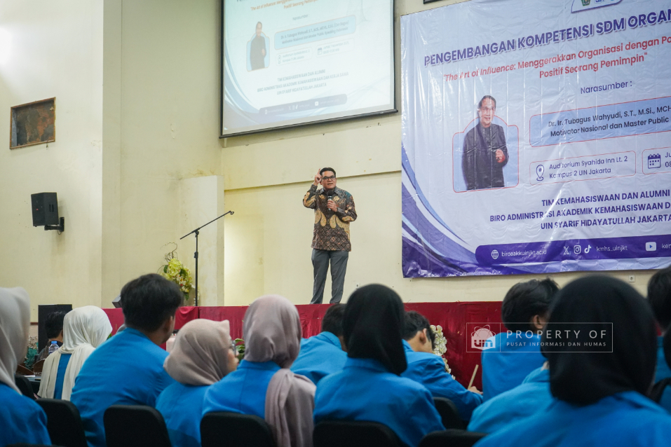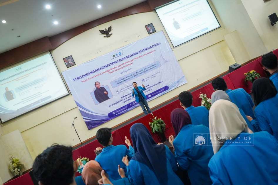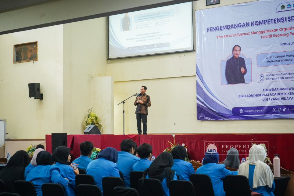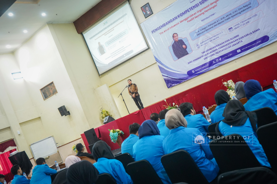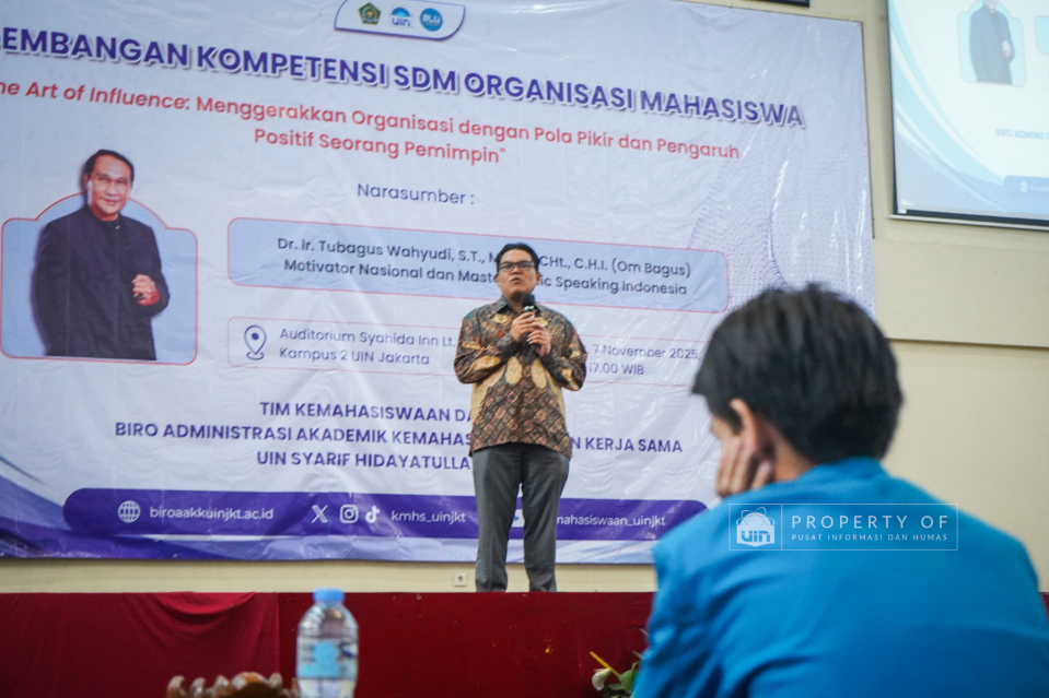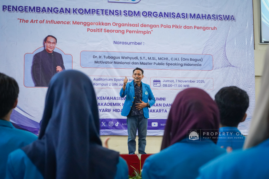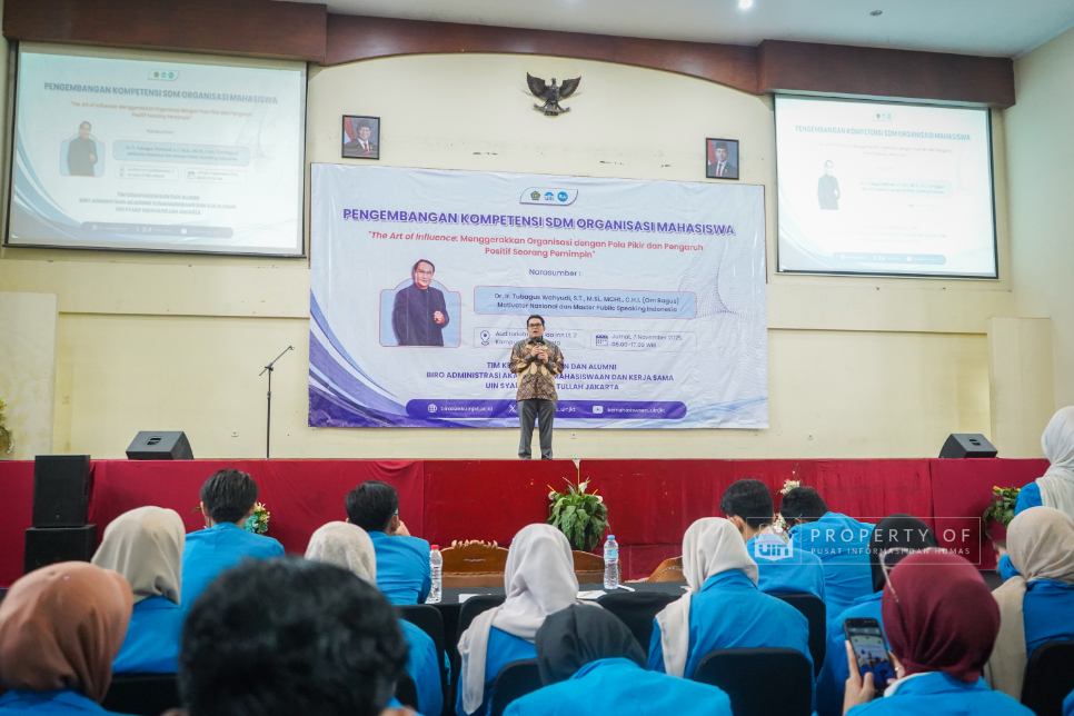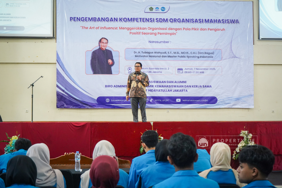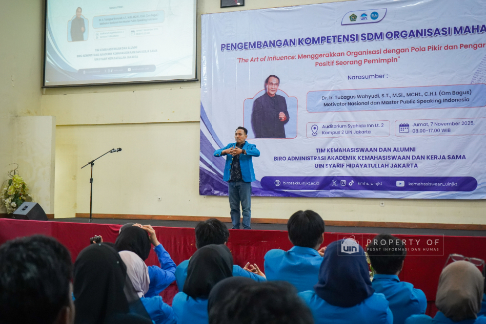Tim Kemahasiswaan UIN Syarif Hidayatullah Jakarta menyelenggarakan Pengembangan Kompetensi SDM Organisasi Mahasiswa (Ormawa) di Teater Syahida INN pada Jumat (7/11/2025). Mengusung tema ‘The Art of Influencer’, kegiatan ini menghadirkan motivator nasional, Dr. Ir. Tubagus Wahyudi, untuk meningkatkan kualitas kepemimpinan mahasiswa UKM dan Ormawa melalui empat materi utama, termasuk Pola Pikir Pemimpin dan Komunikasi Efektif. Rektor UIN Jakarta dalam sambutannya menekankan bahwa komitmen adalah pilar utama bagi mahasiswa dalam berorganisasi, "tanpa ada komitmen, jangan harap sesuatu itu akan ada perubahan". Wakil Rektor Bidang Kemahasiswaan, Prof. Ali Munhanif, menambahkan bahwa acara ini bertujuan mengembangkan gagasan, inovasi, serta kemampuan berinteraksi para pemimpin mahasisw (Fotografer: Muhammad Ghifari Rahman/ Teks: Nabila Azzahra Syawal/Pusat Informasi dan Humas UIN Jakarta)