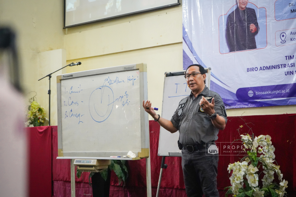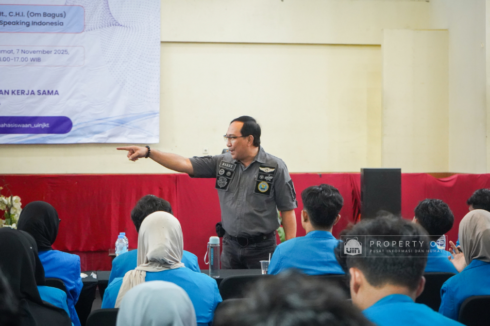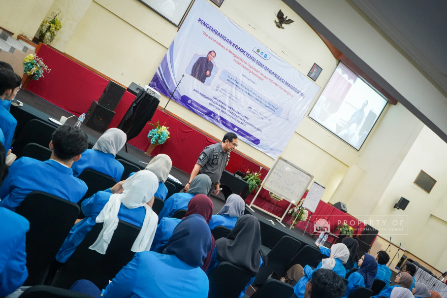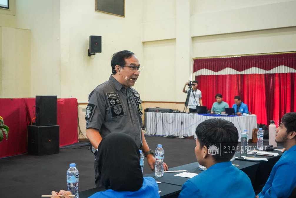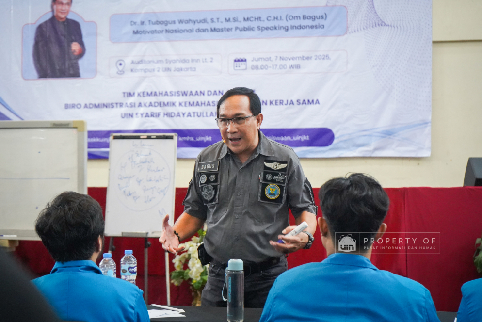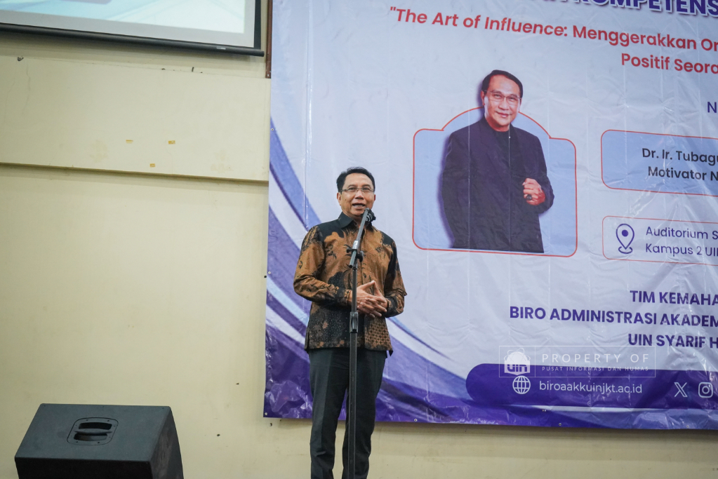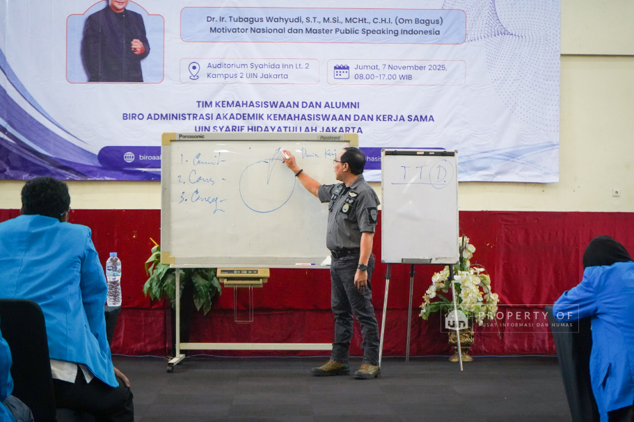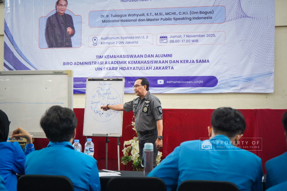 Tim Kemahasiswaan UIN Syarif Hidayatullah Jakarta menyelenggarakan Pengembangan Kompetensi SDM Organisasi Mahasiswa (Ormawa) di Teater Syahida INN pada Jumat (7/11/2025). Mengusung tema ‘The Art of Influencer’, kegiatan ini menghadirkan motivator nasional, Dr. Ir. Tubagus Wahyudi, untuk meningkatkan kualitas kepemimpinan mahasiswa UKM dan Ormawa melalui empat materi utama, termasuk Pola Pikir Pemimpin dan Komunikasi Efektif. Rektor UIN Jakarta dalam sambutannya menekankan bahwa komitmen adalah pilar utama bagi mahasiswa dalam berorganisasi, "tanpa ada komitmen, jangan harap sesuatu itu akan ada perubahan". Wakil Rektor Bidang Kemahasiswaan, Prof. Ali Munhanif, menambahkan bahwa acara ini bertujuan mengembangkan gagasan, inovasi, serta kemampuan berinteraksi para pemimpin mahasisw (Fotografer: Muhammad Ghifari Rahman/ Teks: Nabila Azzahra Syawal/Pusat Informasi dan Humas UIN Jakarta)
