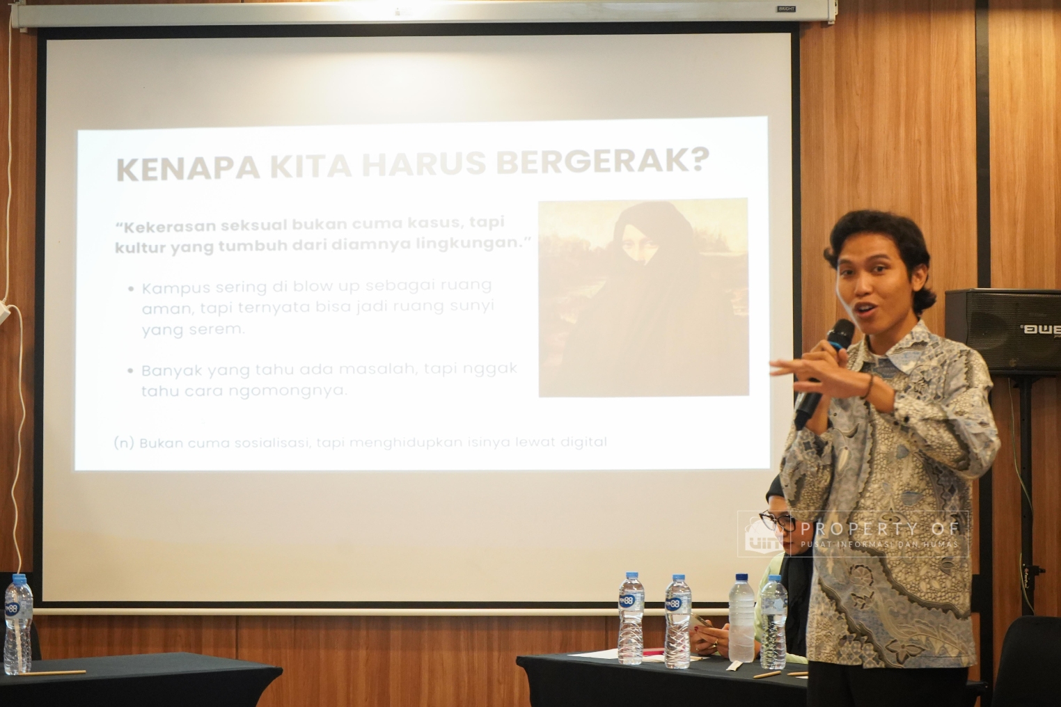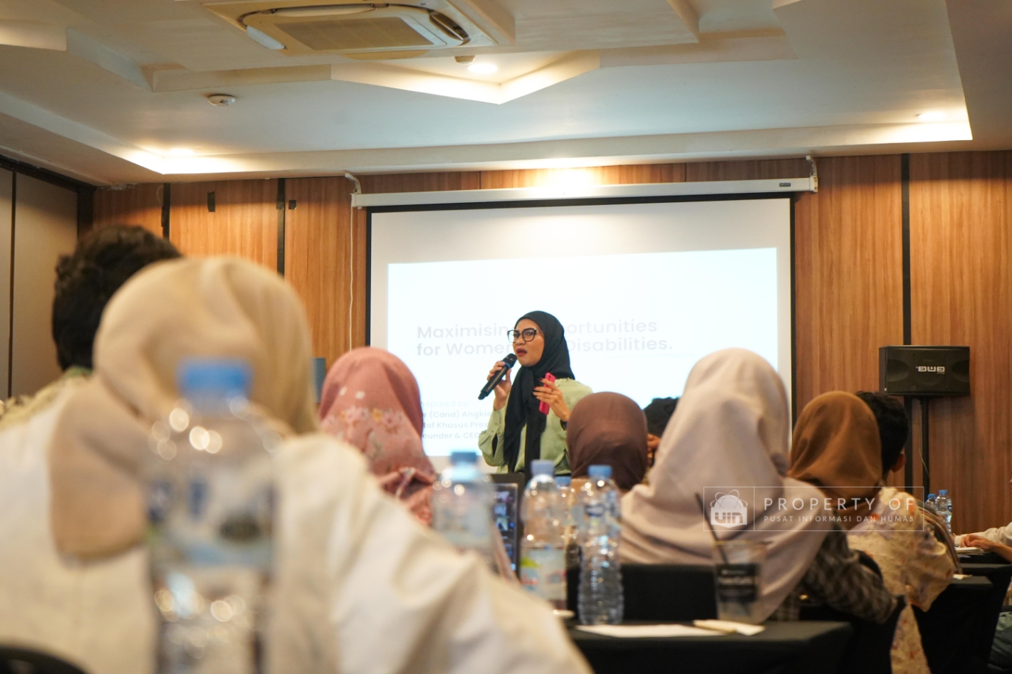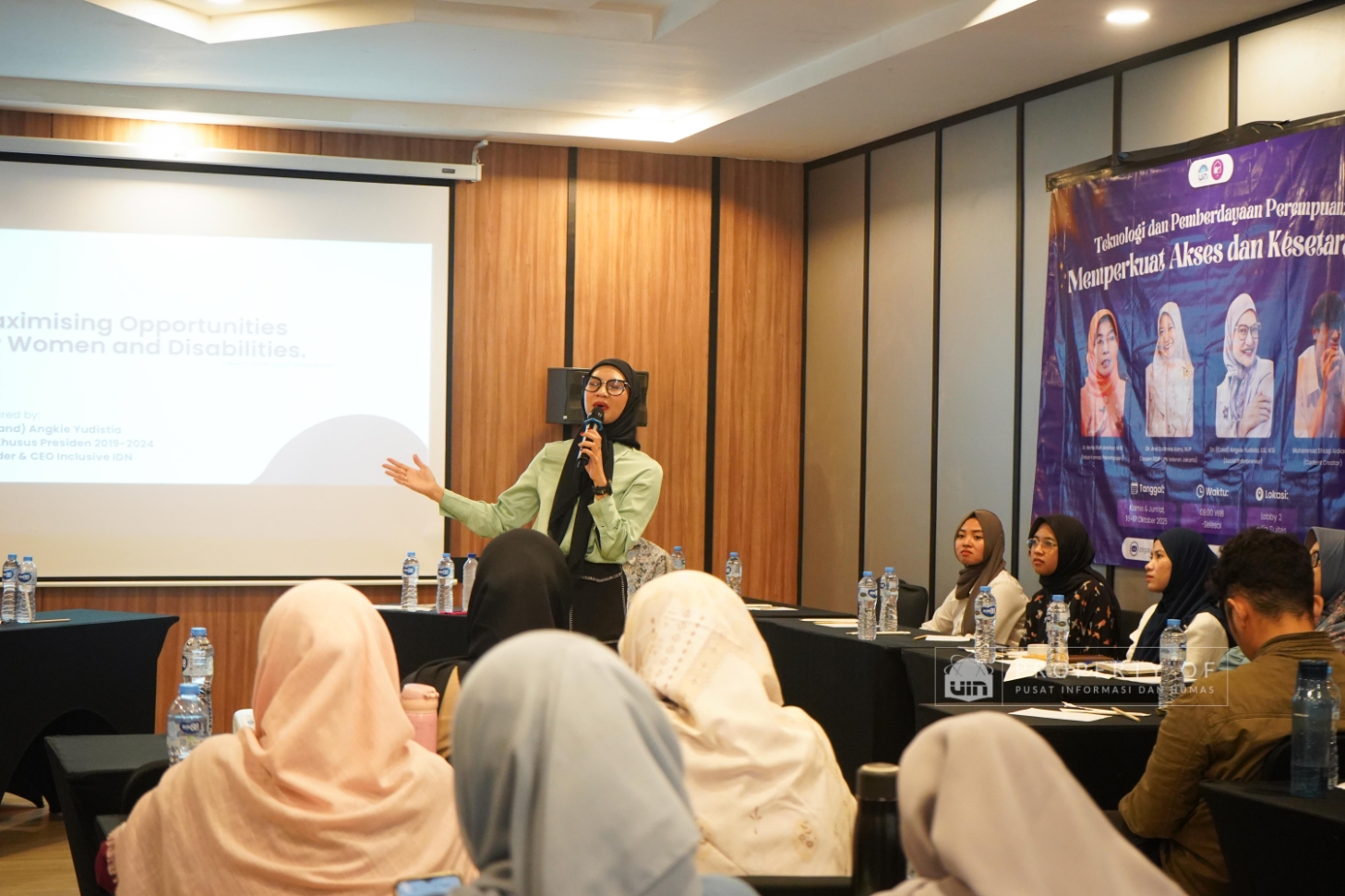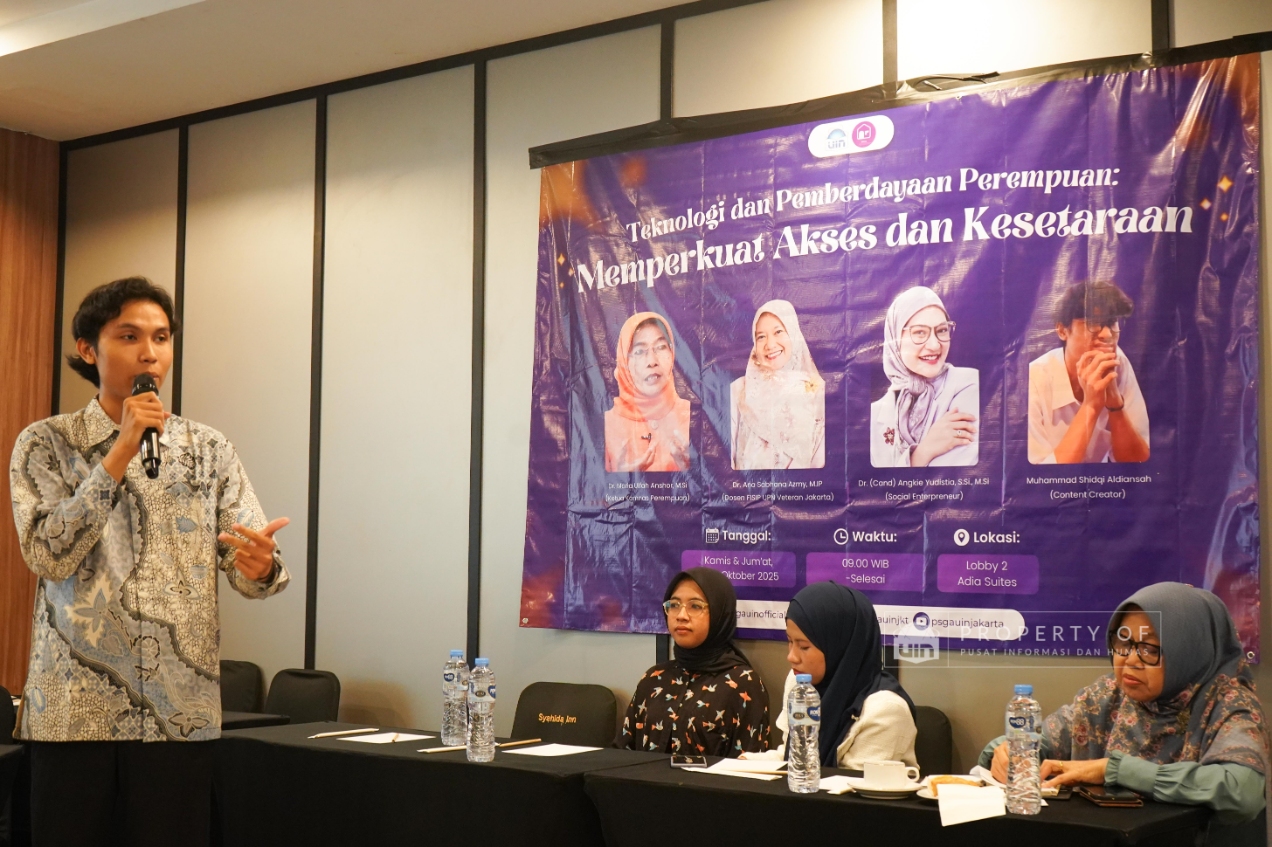 Melanjutkan kegiatannya, Pusat Studi Gender dan Anak (PSGA) UIN Jakarta menggelar Focus Group Discussion (FGD) hari kedua dengan tema “Teknologi dan Pemberdayaan Perempuan” di Adia Convention Center pada Jumat (17/10/2025). Acara ini menghadirkan narasumber Dr. (Chand) Angkie Yudistia, yang menyoroti peran teknologi untuk menciptakan ruang inklusif bagi perempuan dan penyandang disabilitas, serta berharap UIN Jakarta menjadi kampus yang semakin inklusif. Narasumber lainnya, content creator Muhammad Shidqi Aldiansyah, mendorong mahasiswa untuk memanfaatkan media sosial sebagai alat kampanye kesetaraan gender dan pencegahan kekerasan seksual dengan menerjemahkan teori akademis ke dalam bahasa yang mudah dipahami publik. (Fotografer: Aqilah Qurratulaini/ Teks: Nabila Azzahra Syawal/ Pusat Informasi dan Humas UIN Jakarta)