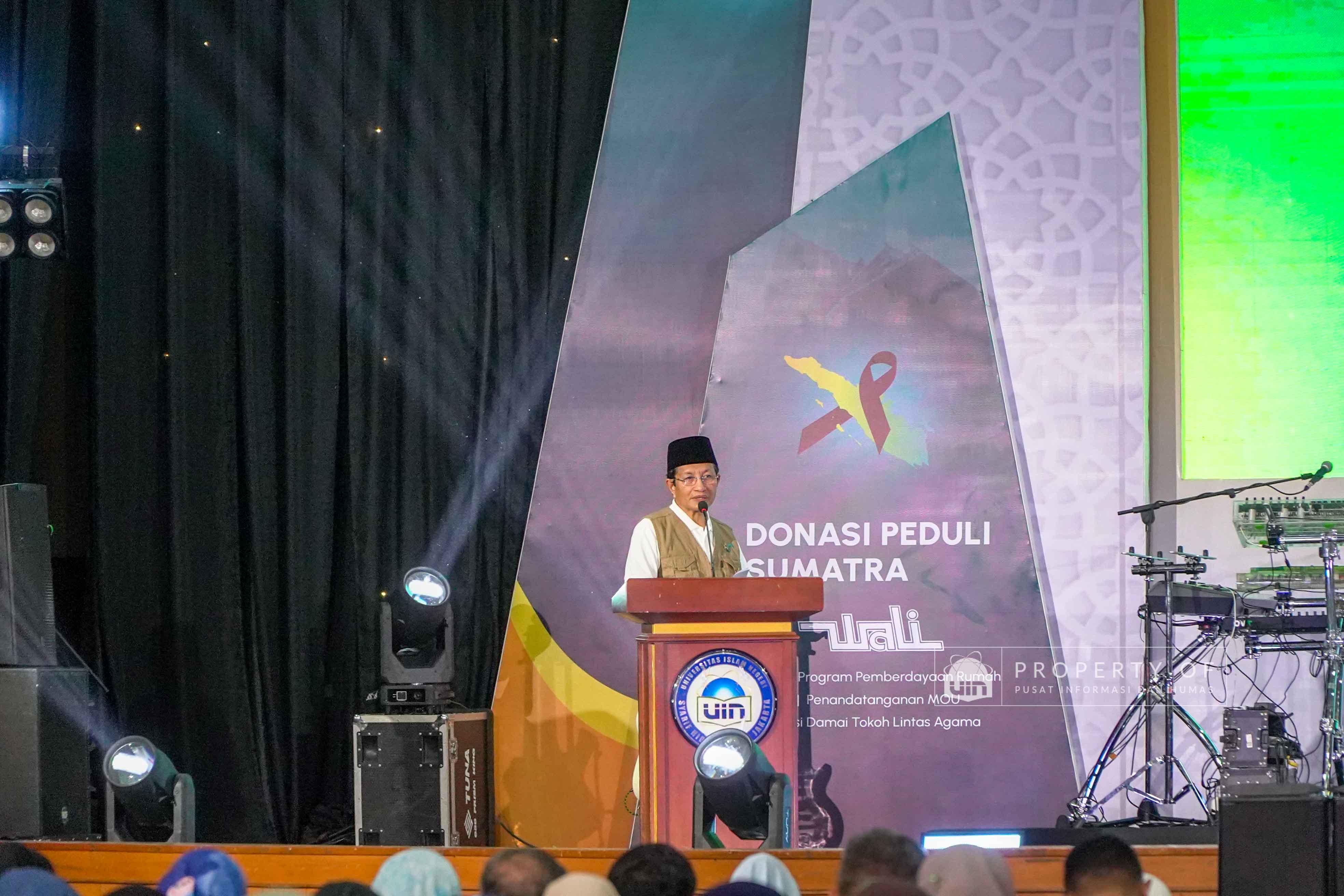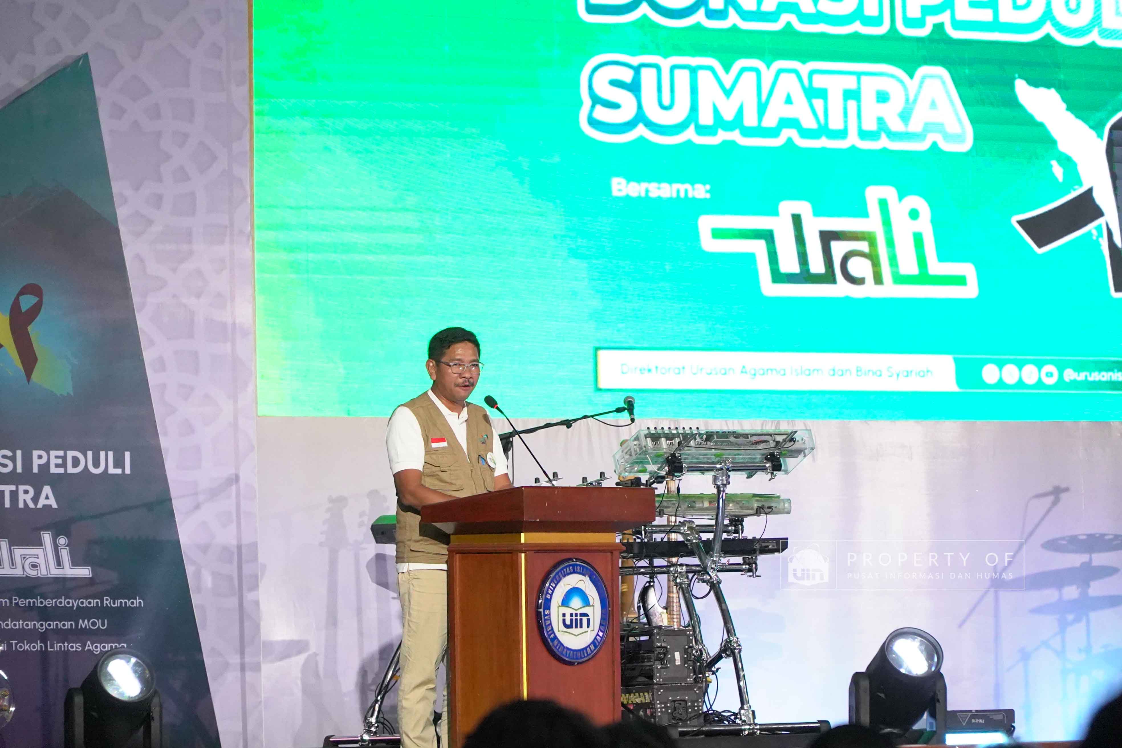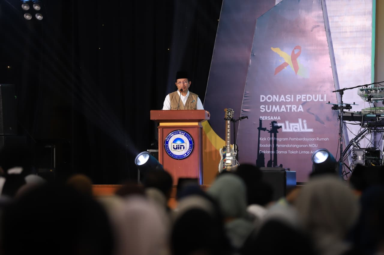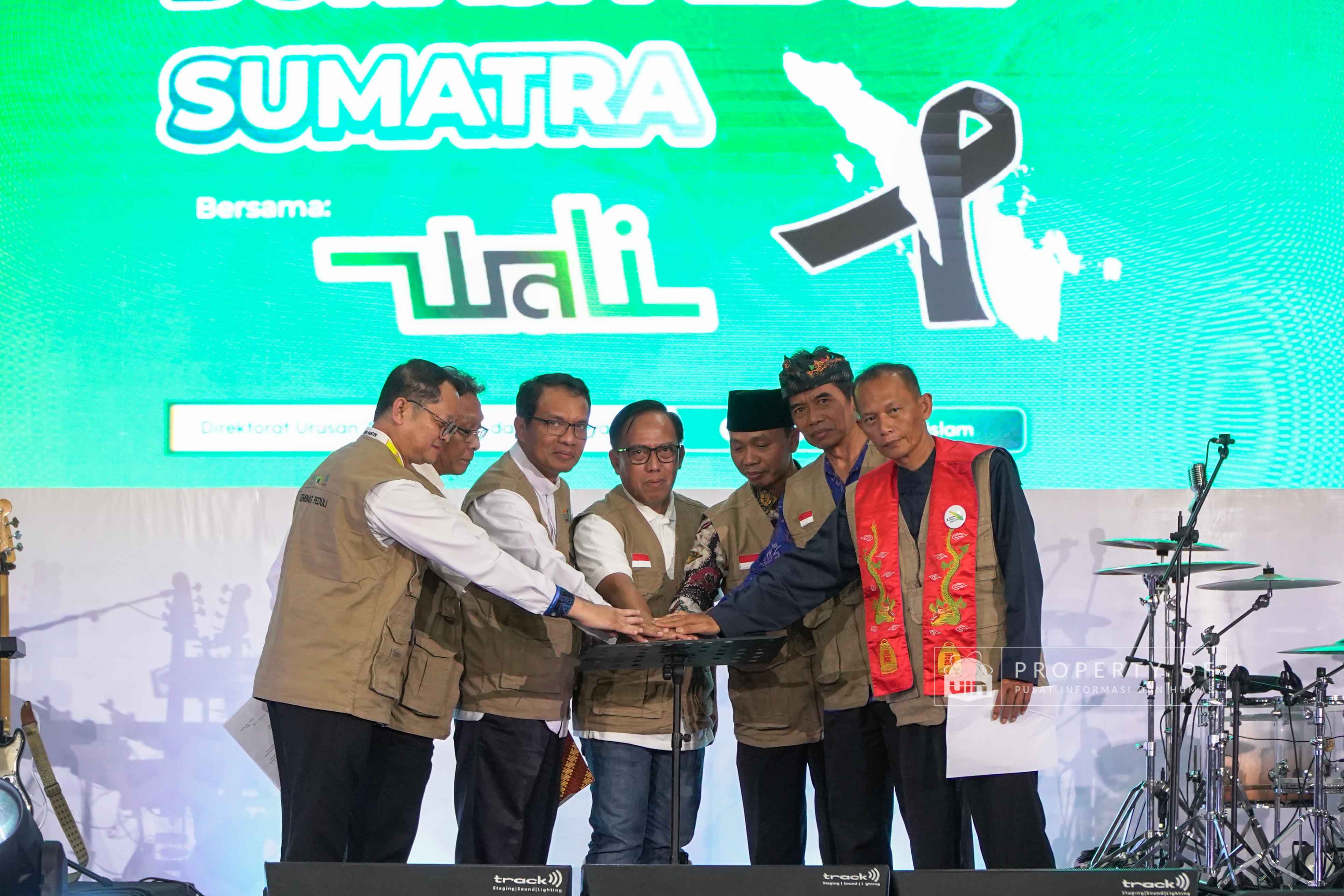Kementerian Agama menggelar kegiatan Donasi Peduli Sumatra di Auditorium Harun Nasution UIN Syarif Hidayatullah Jakarta pada Jumat (12/12/2025), sebuah gerakan kemanusiaan untuk memperkuat solidaritas bagi masyarakat di Sumatra. Acara yang terbuka untuk umum ini turut menghadirkan Grup Musik Wali, serta menghadirkan rangkaian kegiatan seperti Kick Off Program Pemberdayaan Rumah Ibadah, penandatanganan MoU, dan deklarasi peduli kemanusiaan tokoh lintas agama. (Fotografer: Rajif Ramadhan/Teks: Tiara Septiana Dewi/Pusat Informasi dan Humas UIN Jakarta)