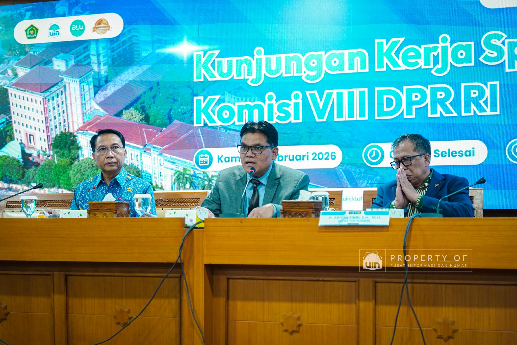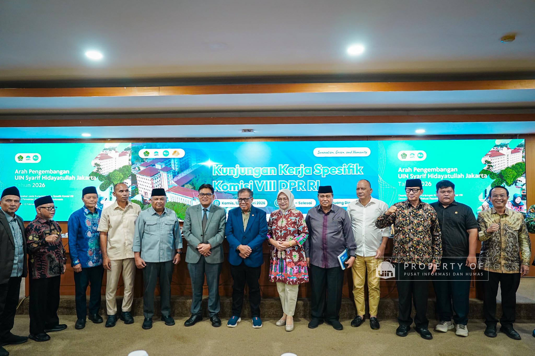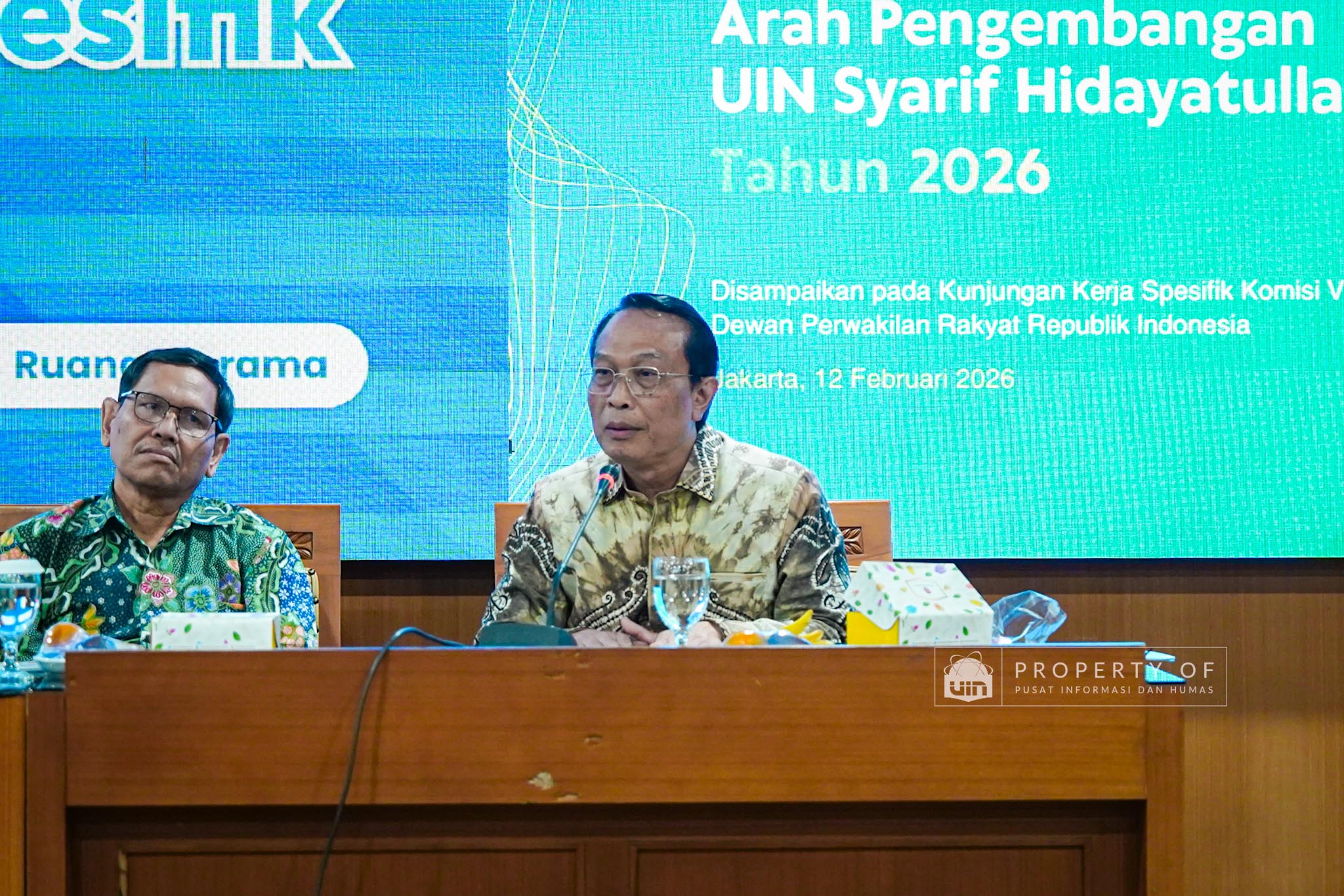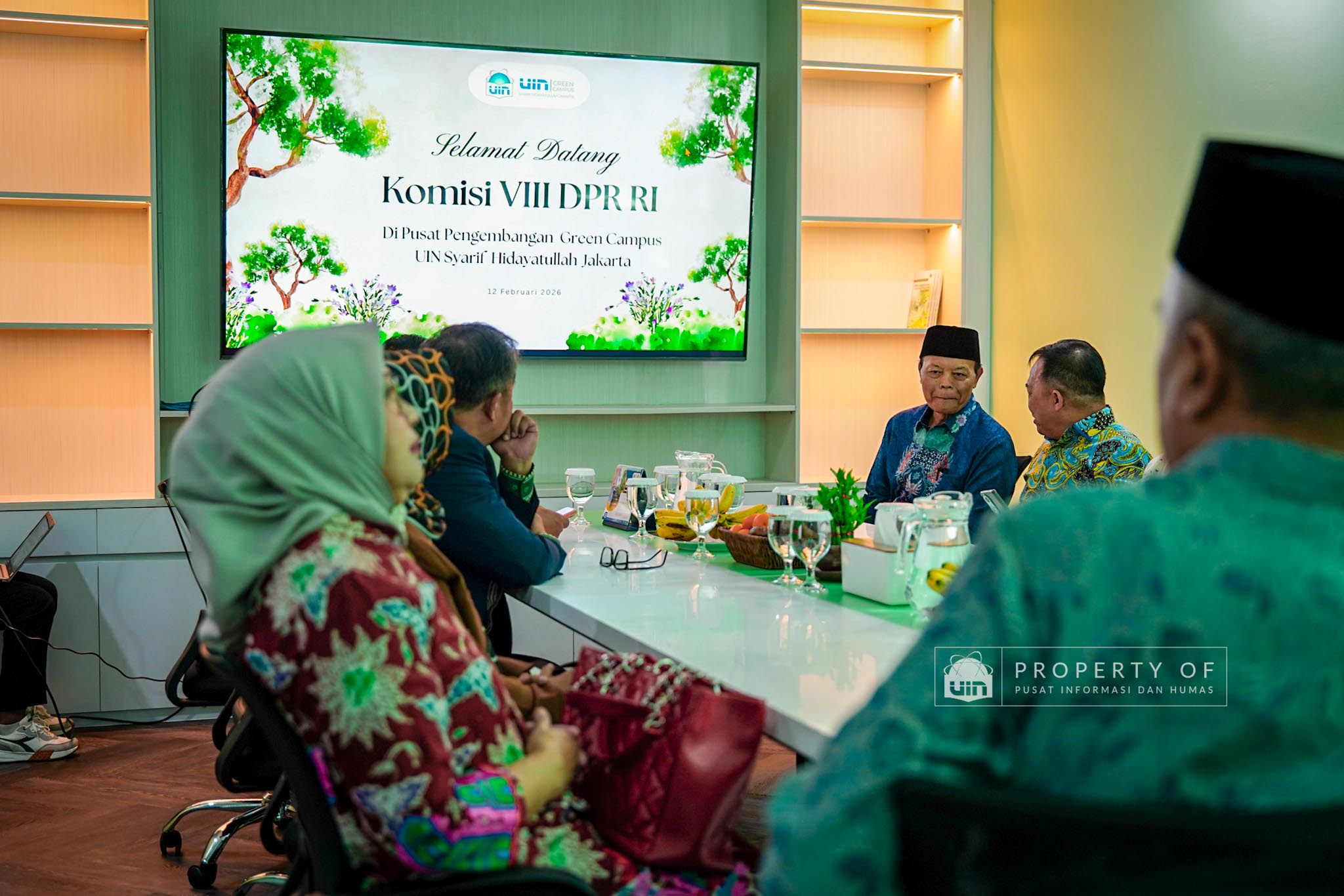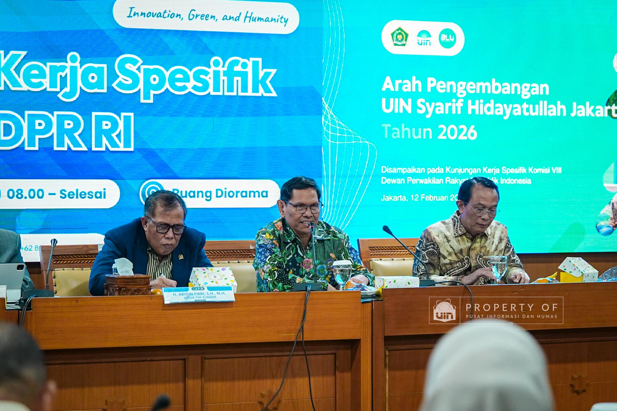 UIN Syarif Hidayatullah Jakarta menerima Kunjungan Kerja Spesifik Komisi VIII DPR RI untuk meninjau kesiapan dan pengembangan pendidikan tinggi keagamaan, di Ruang Diorama, Kamis (12/02/2026). Rektor UIN Jakarta memaparkan roadmap 2025-2029 yang menekankan digitalisasi, transformasi menuju PTN-BH, serta konsep Green Campus. (Fotografer: Azka Raysa Pratama/Teks: Tiara Septiana Dewi/Pusat Informasi dan Humas UIN Jakarta)