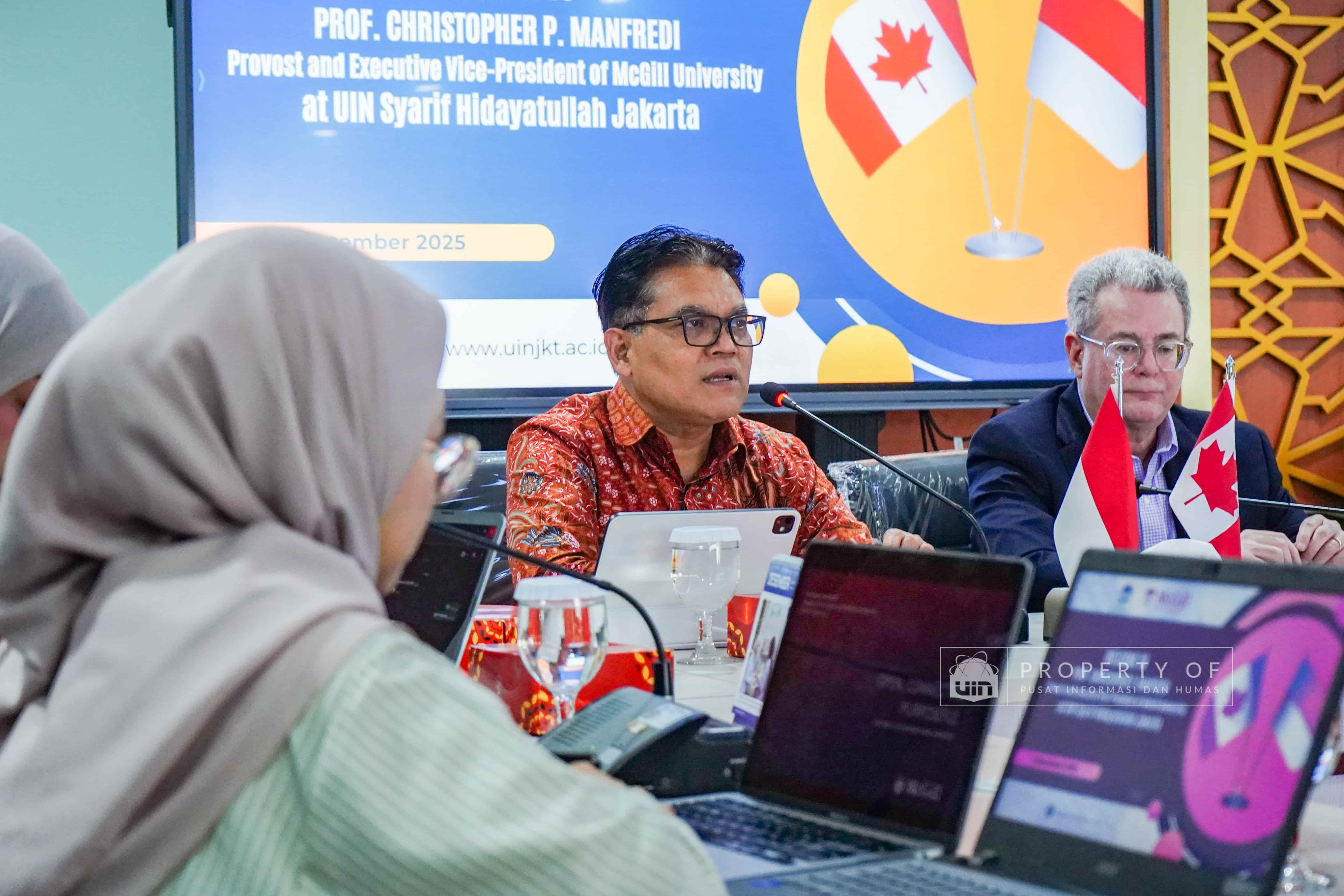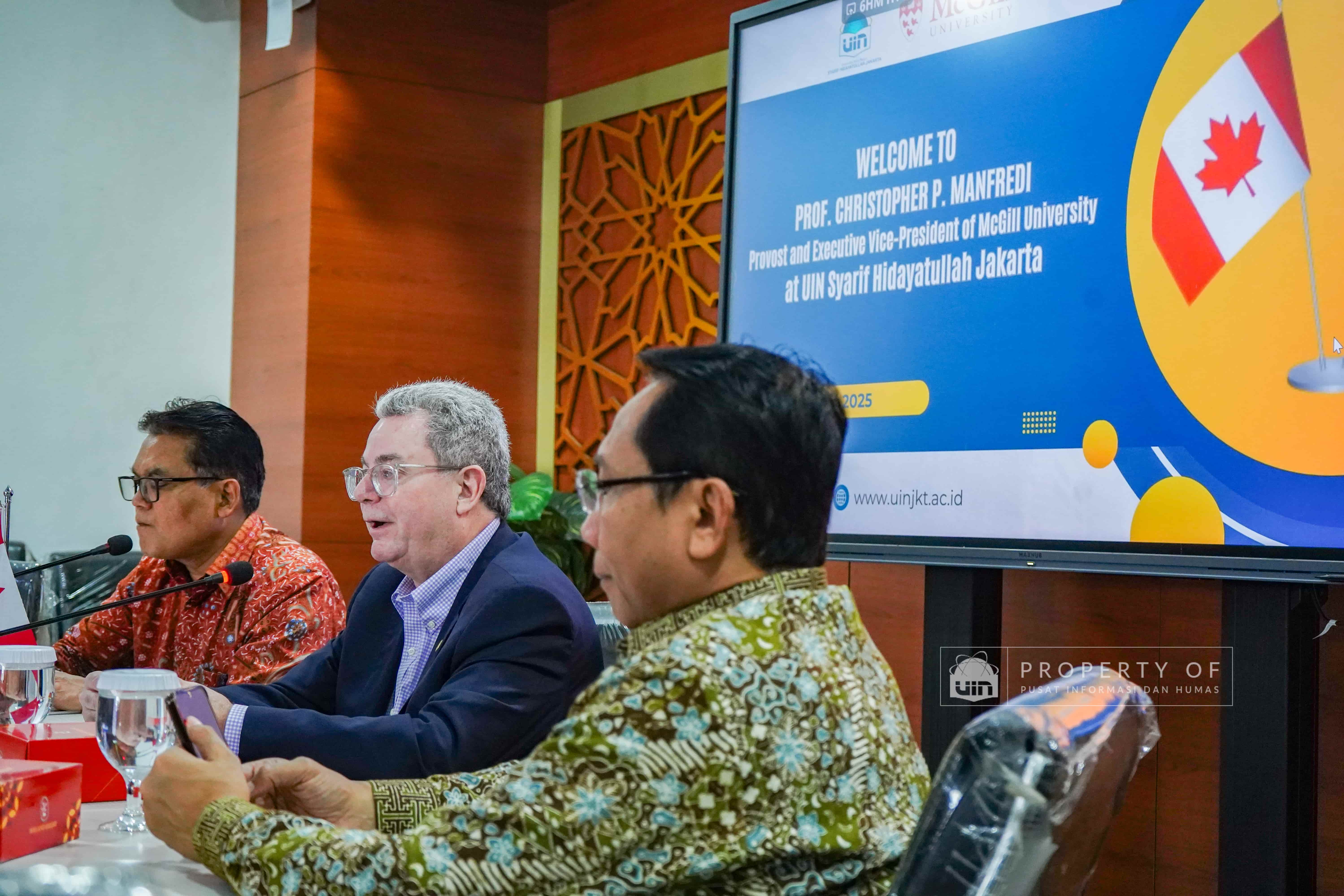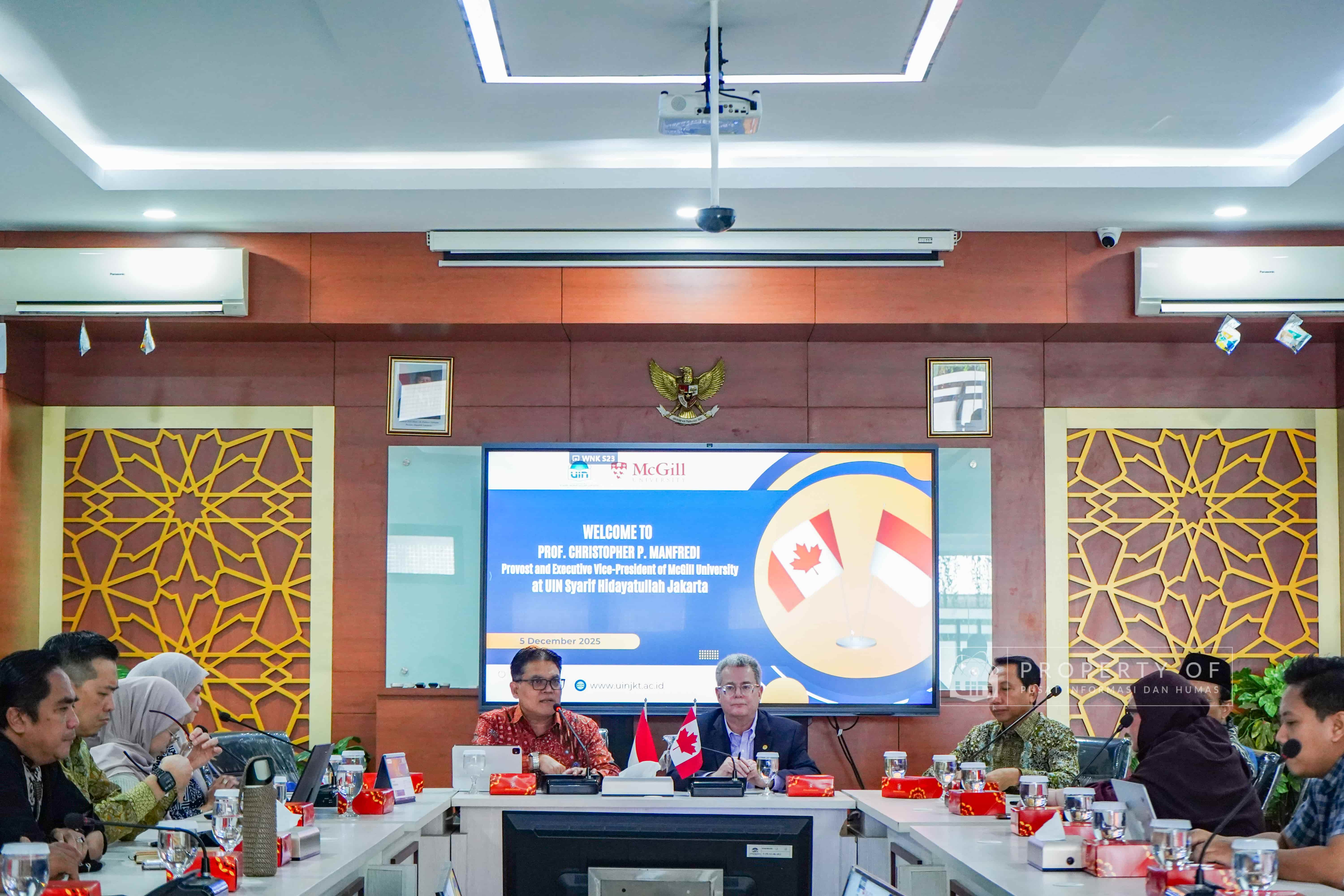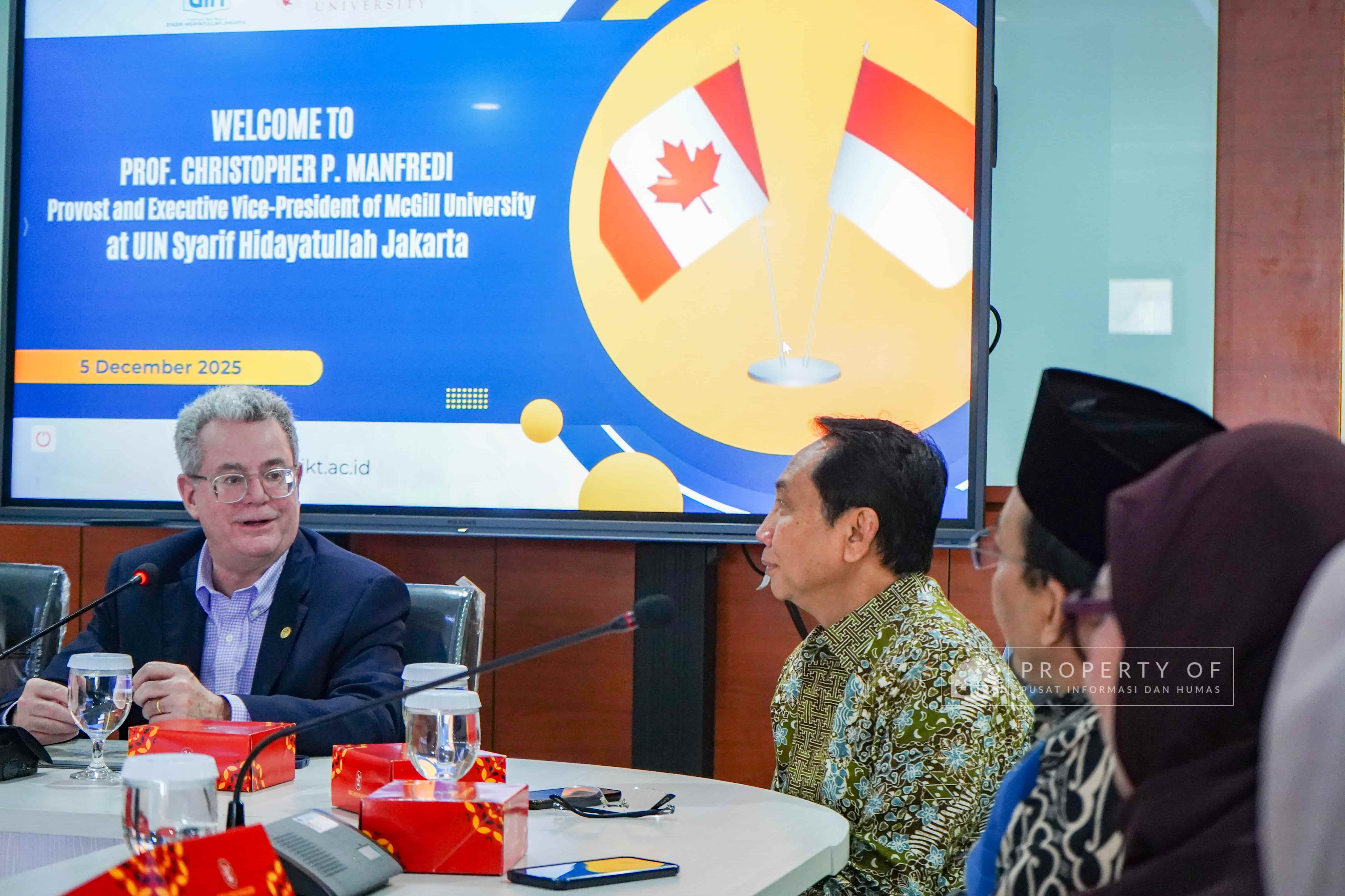 UIN Syarif Hidayatullah Jakarta sambut kunjungan resmi Provost and Executive Vice-President dari McGill University, Prof. Christopher P. Manfredi, Jumat (5/12/2025). Kunjungan ini diadakan untuk menjalin kerjasama UIN Jakarta pada tingkat internasional dalam hal pengembangan program akademik yang komprehensif. Acara ini dihadiri oleh Rektor UIN Jakarta, Prof. Asep Saepudin Jahar, M.A., Ph.D., dalam sambutannya mengatakan adanya kunjungan ini dilaksanakan untuk memperluas peluang kolaborasi dengan Universitas McGill, Kanada, khususnya di bidang akademik. (Fotografer: Fajri Raisa dan Tiara Abdhie/Teks: Fajri Nafisa/Pusat Informasi dan Humas UIN Jakarta)