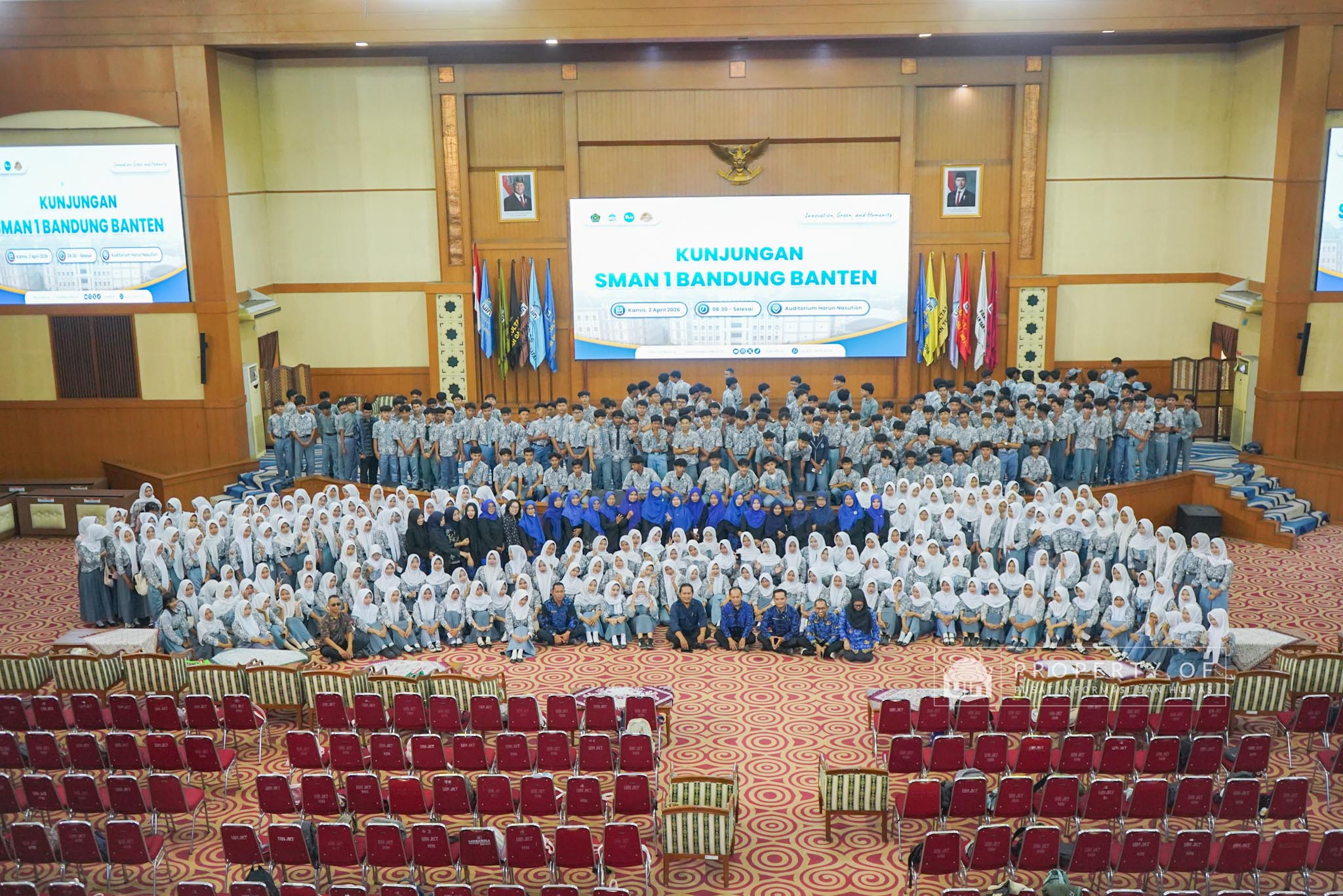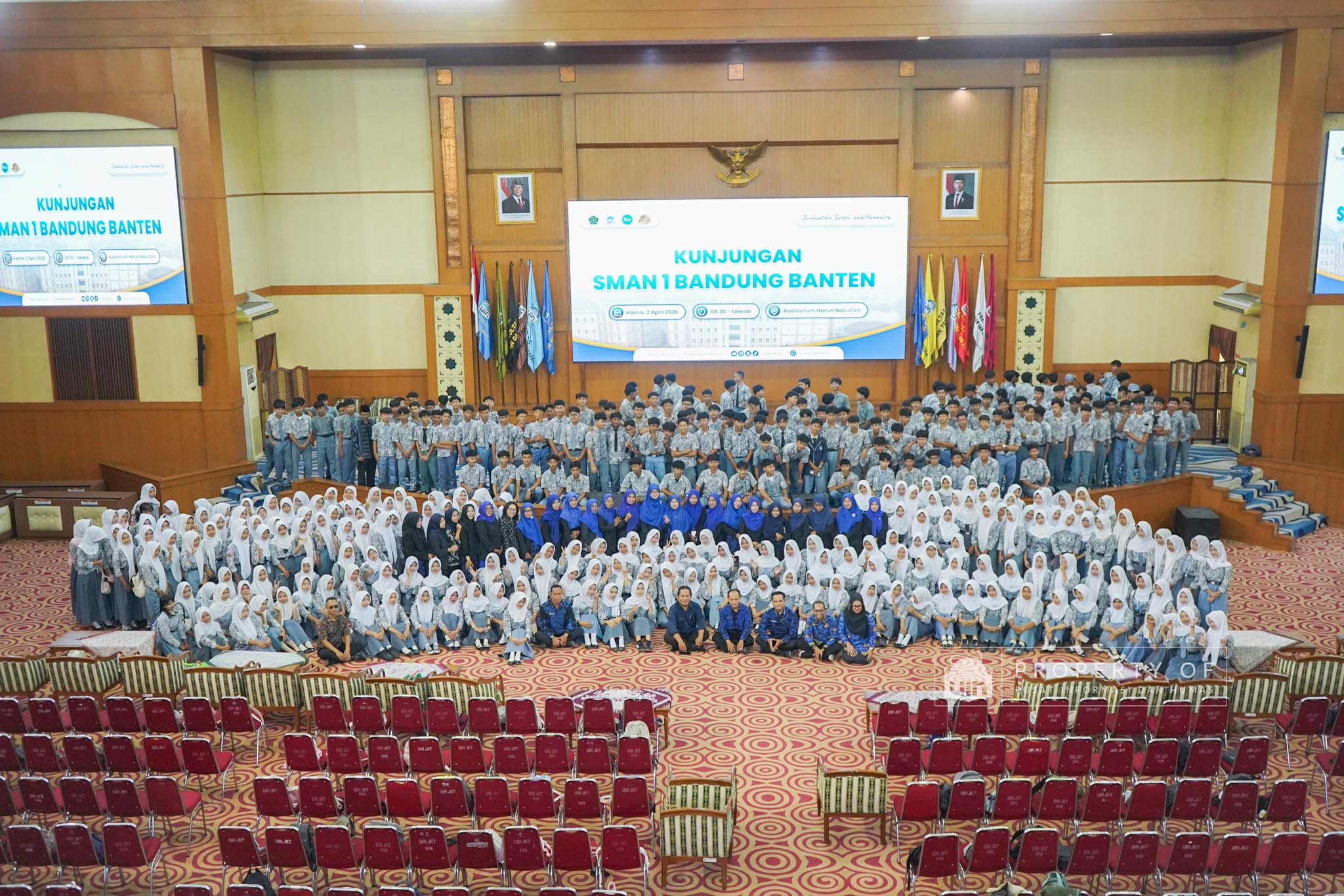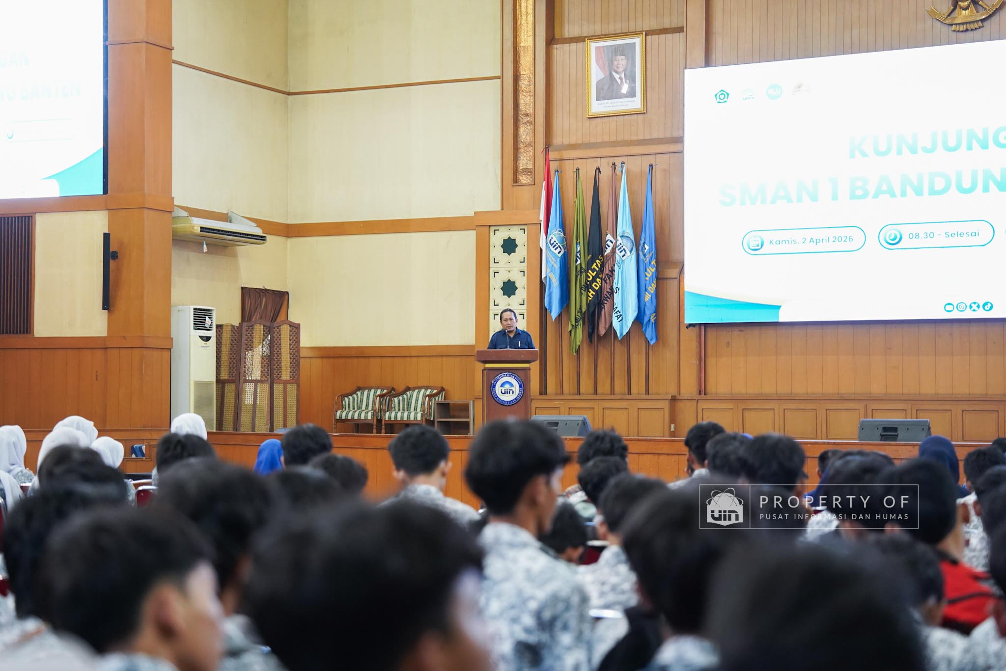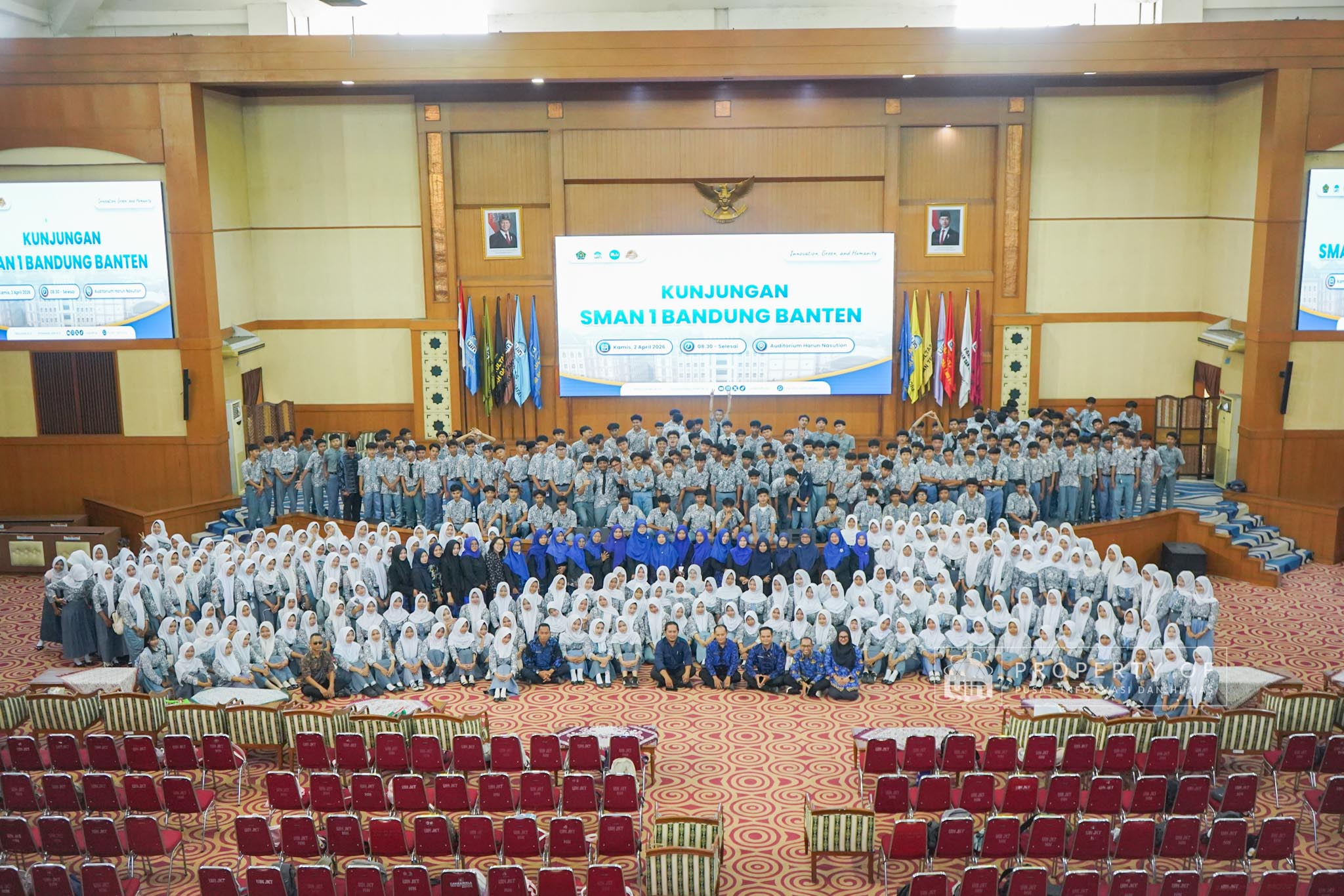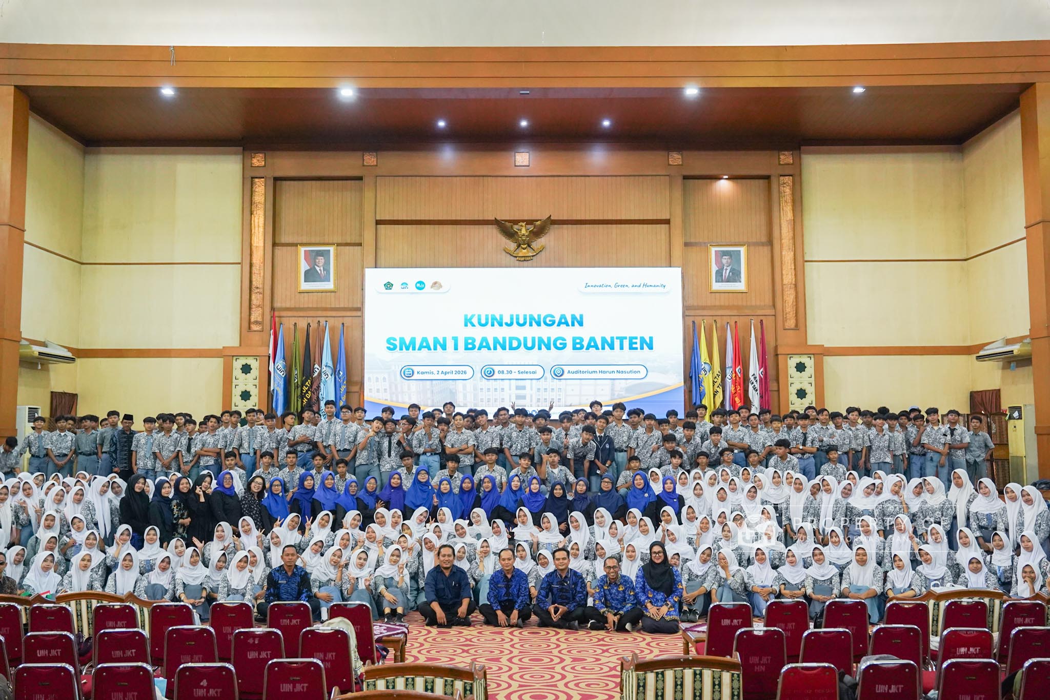 UIN Syarif Hidayatullah Jakarta menerima kunjungan 306 siswa kelas XI beserta guru pendamping dari SMAN 1 Bandung, Kabupaten Serang, Banten, yang berlangsung di Auditorium Harun Nasution UIN Jakarta, Kamis (02/04/2026). Kegiatan ini bertujuan memberikan gambaran mengenai profil program studi, fasilitas kampus, serta mekanisme penerimaan mahasiswa baru, melalui pemaparan dari Tim Pusat Informasi dan Humas UIN Jakarta. (Fotografer: Azka Raysa Pratama dan Rajif Ramadhan/Teks: Tiara Septiana Dewi/Pusat Informasi dan Humas UIN Jakarta)