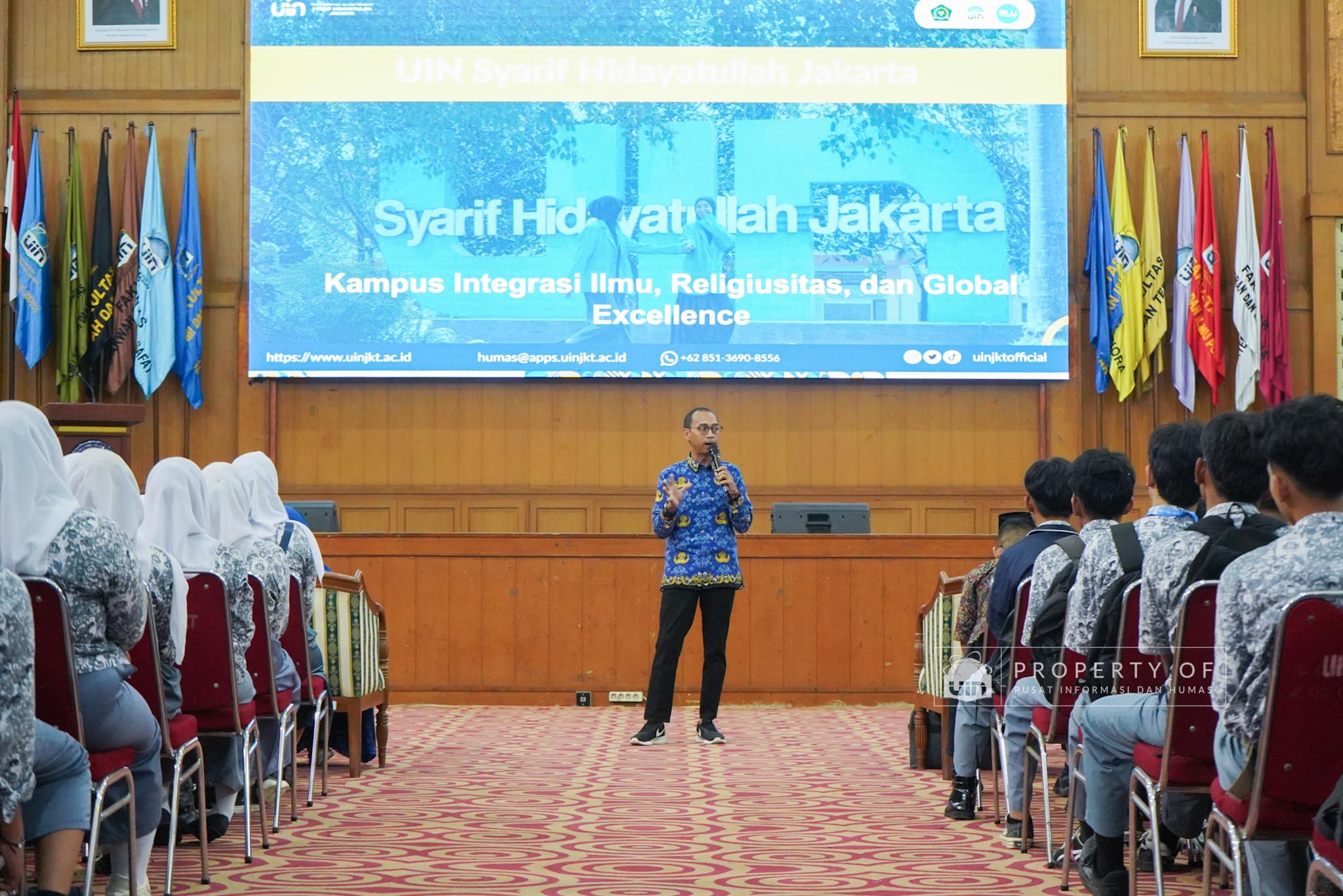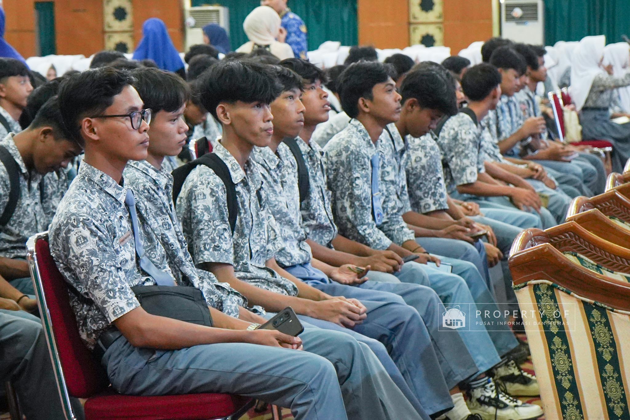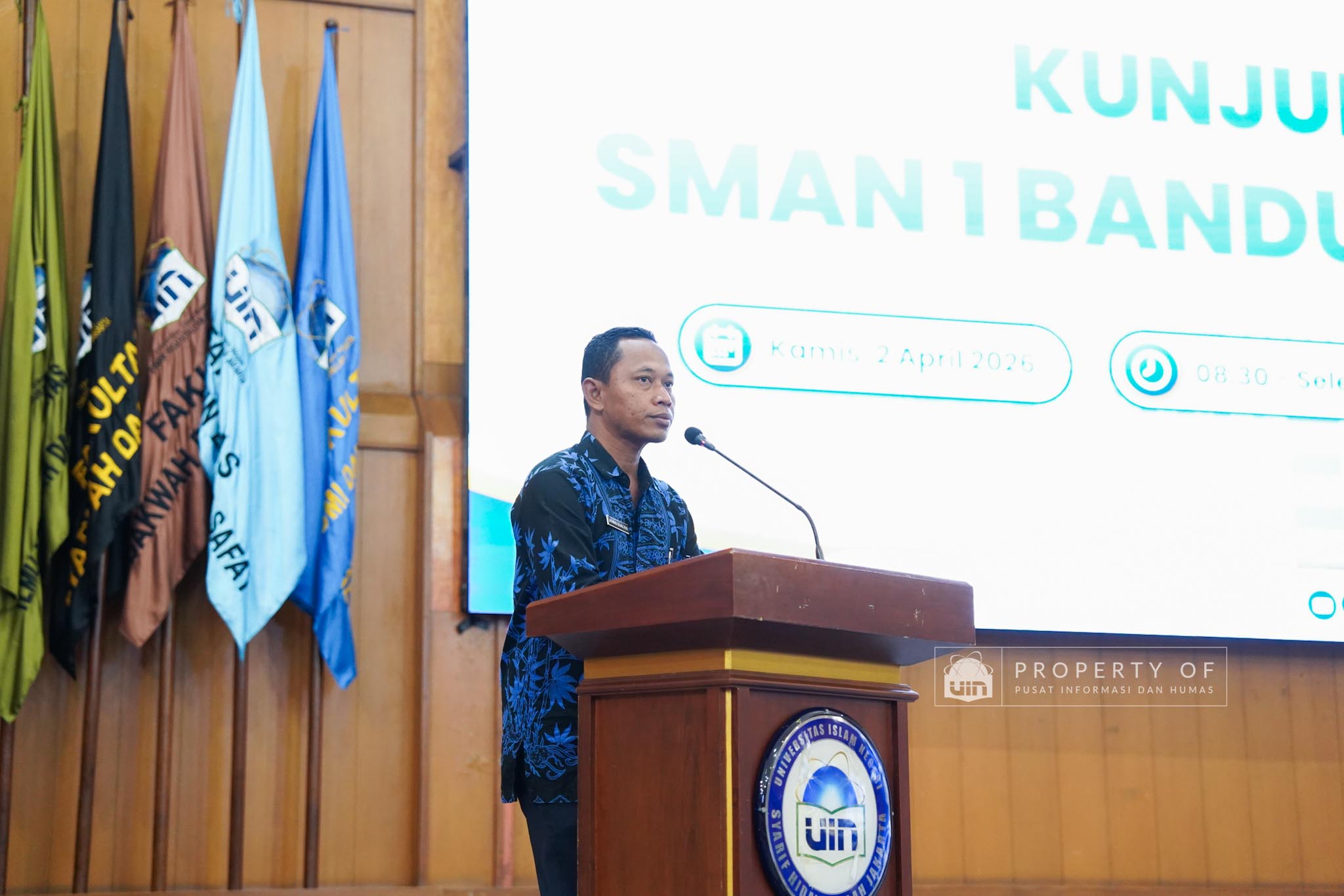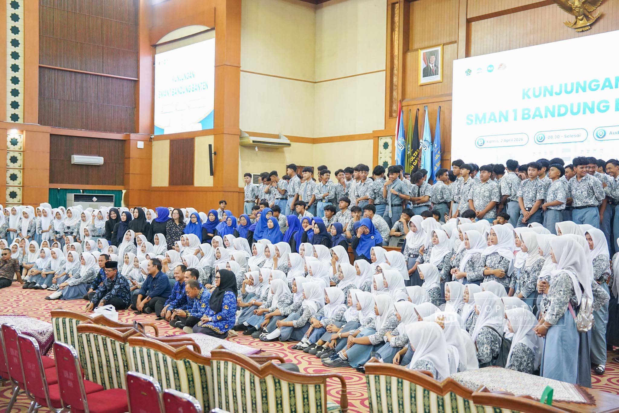 UIN Syarif Hidayatullah Jakarta menerima kunjungan 306 siswa kelas XI beserta guru pendamping dari SMAN 1 Bandung, Kabupaten Serang, Banten, yang berlangsung di Auditorium Harun Nasution UIN Jakarta, Kamis (02/04/2026). Kegiatan ini bertujuan memberikan gambaran mengenai profil program studi, fasilitas kampus, serta mekanisme penerimaan mahasiswa baru, melalui pemaparan dari Tim Pusat Informasi dan Humas UIN Jakarta. (Fotografer: Azka Raysa Pratama dan Rajif Ramadhan/Teks: Tiara Septiana Dewi/Pusat Informasi dan Humas UIN Jakarta)