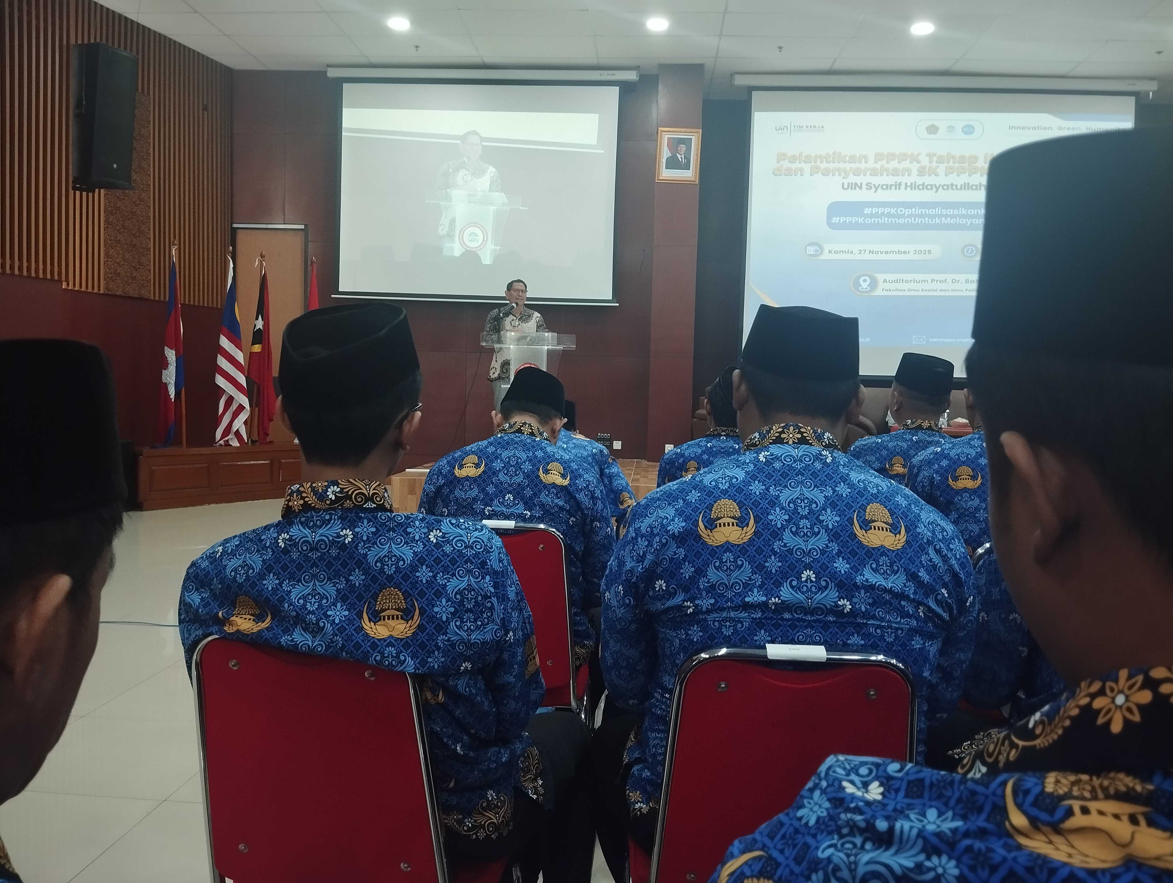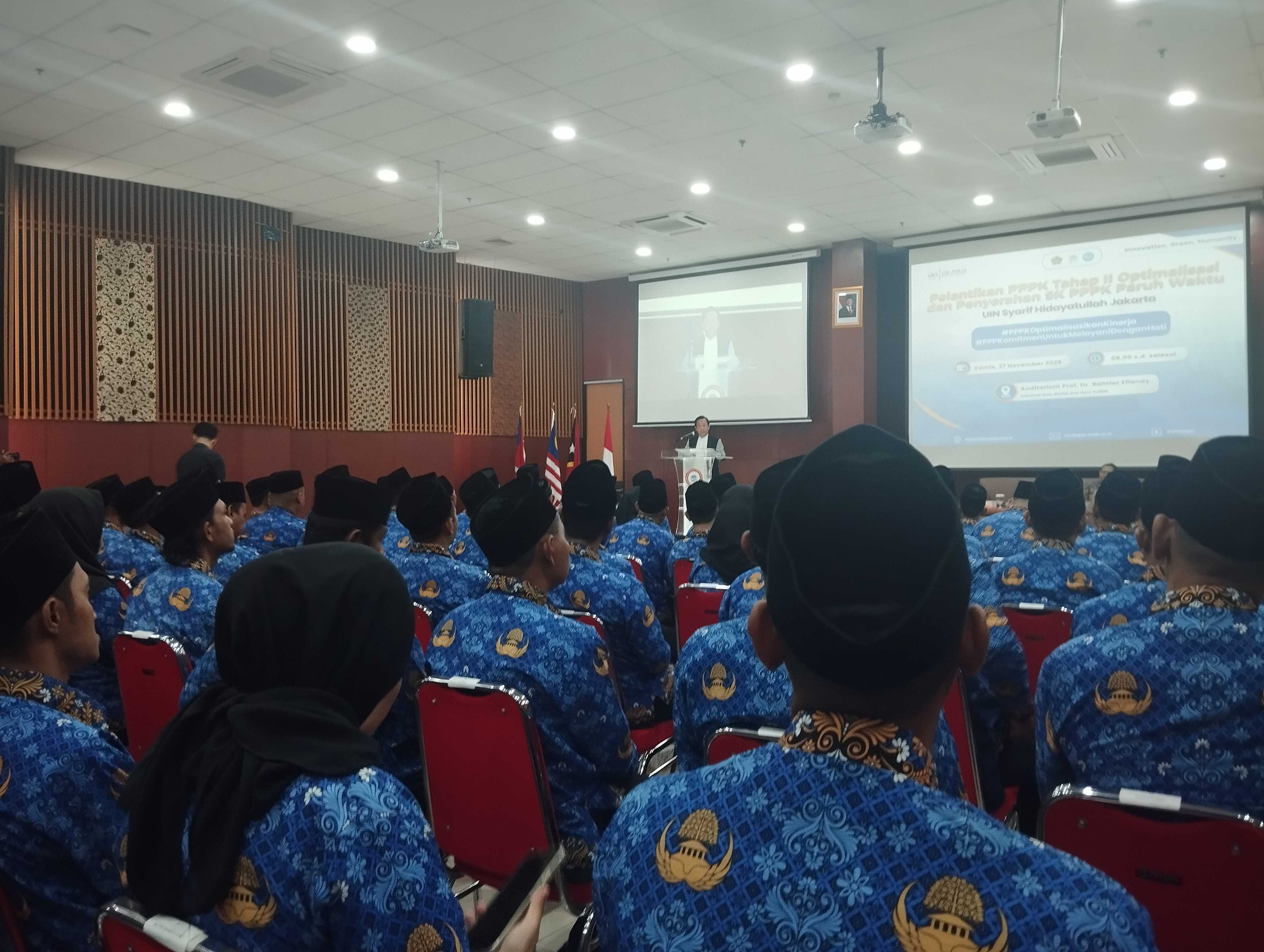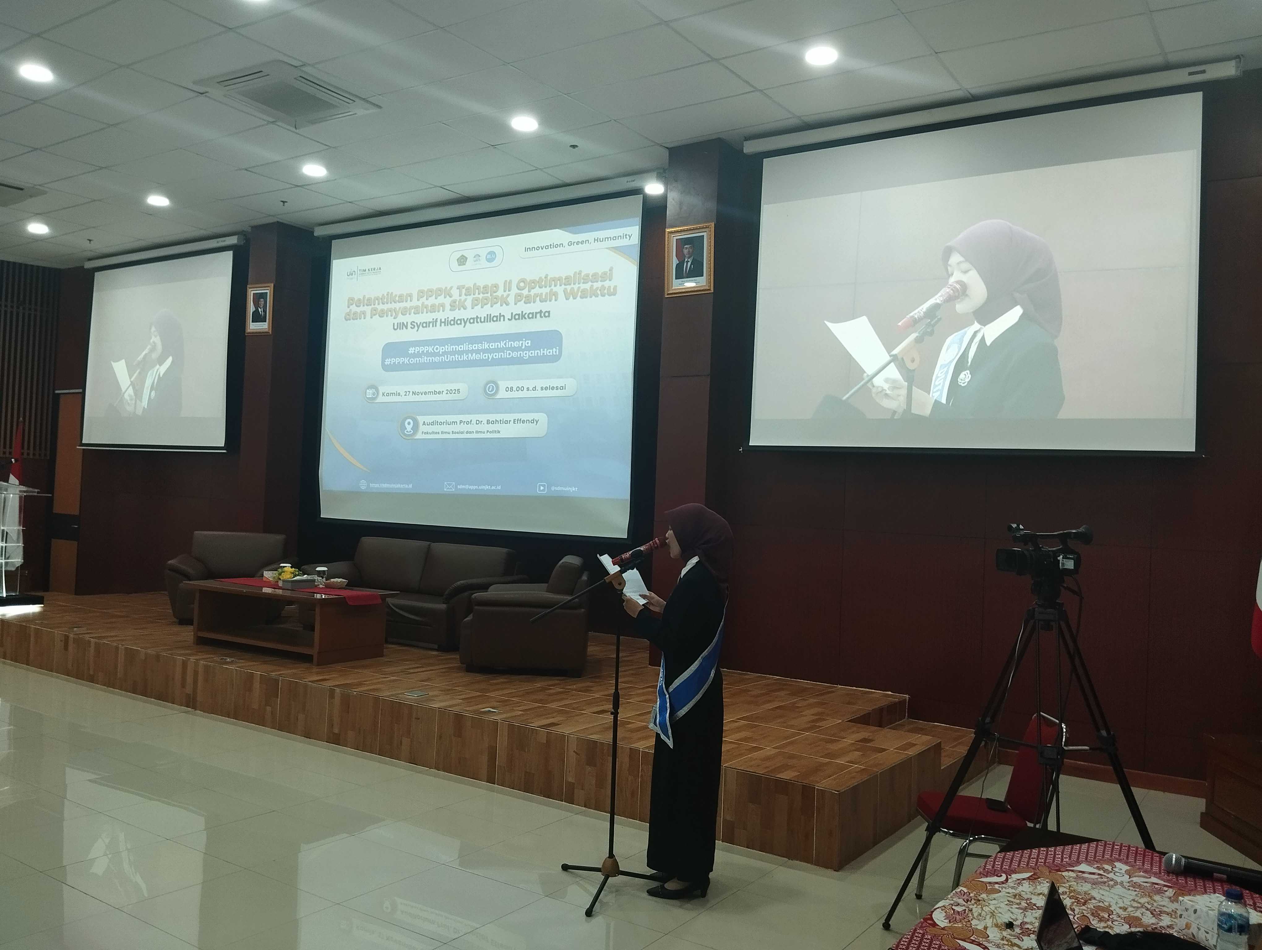 UIN Syarif Hidayatullah Jakarta gelar Pelantikan PPPK Tahap II dan Penyerahan SK PPPK Paruh Waktu di Auditorium Prof. Dr. Bachtiar Effendy pada Kamis (27/11/2025). Sehubung dengan Keputusan Menteri Agama (KMA), 105 PPPK Paruh Waktu dan 83 PPPK Optimalisasi sukses dilantik pada acara ini yang diselenggarakan oleh Kemenag RI. (Fotografer: Muhamad Arifin Ilham/Teks: Muhamad Arifin Ilham/Pusat Informasi dan Humas UIN Jakarta)