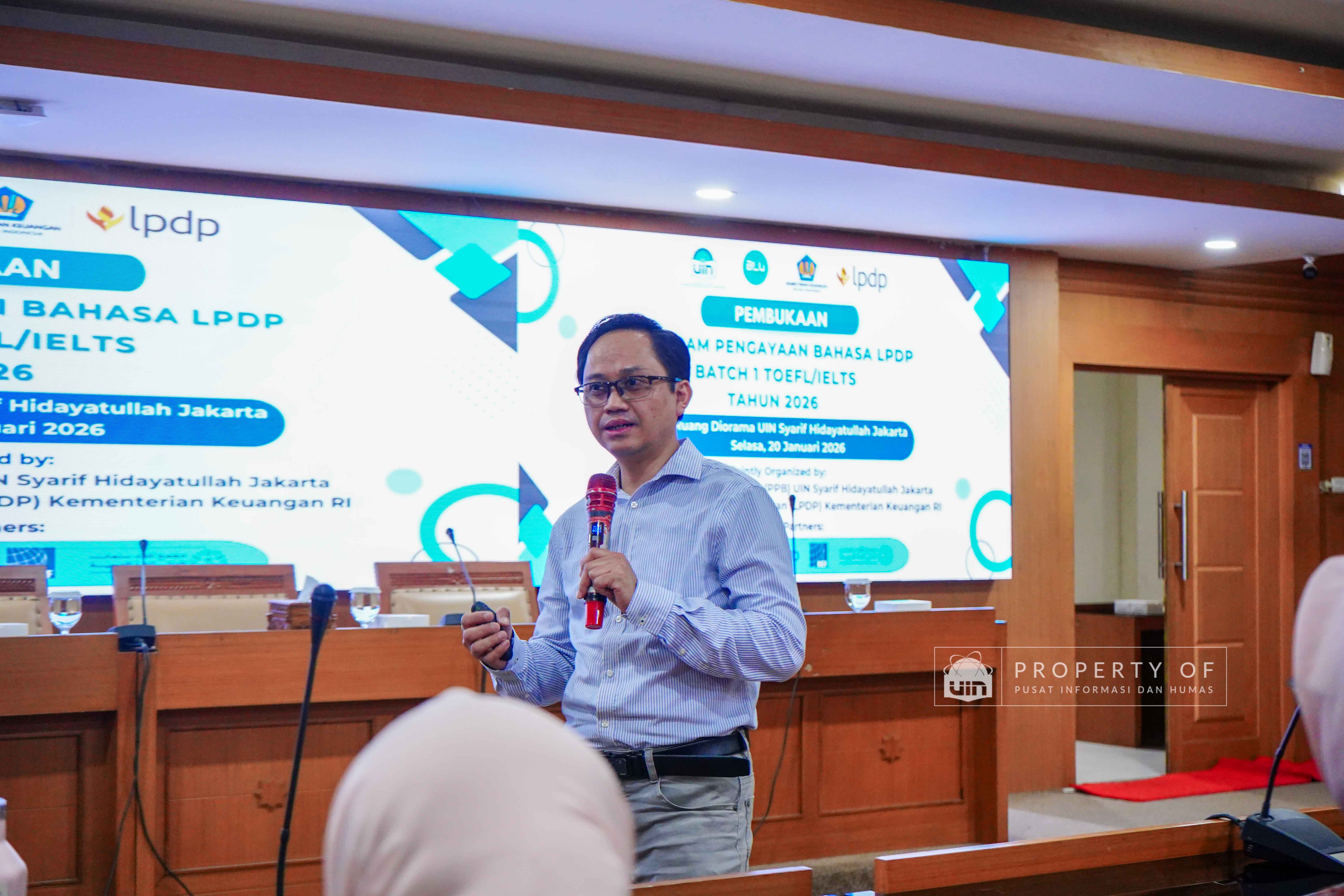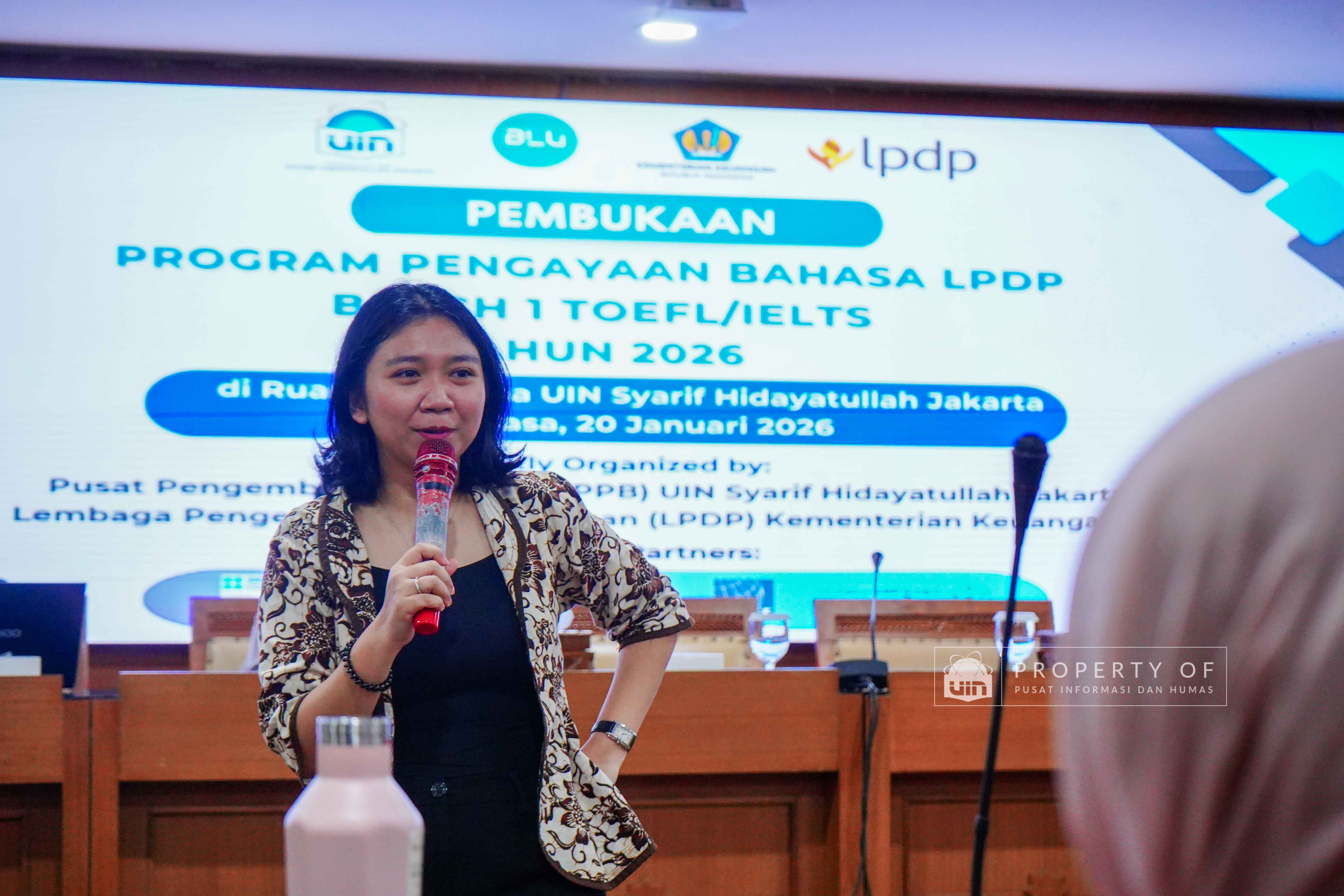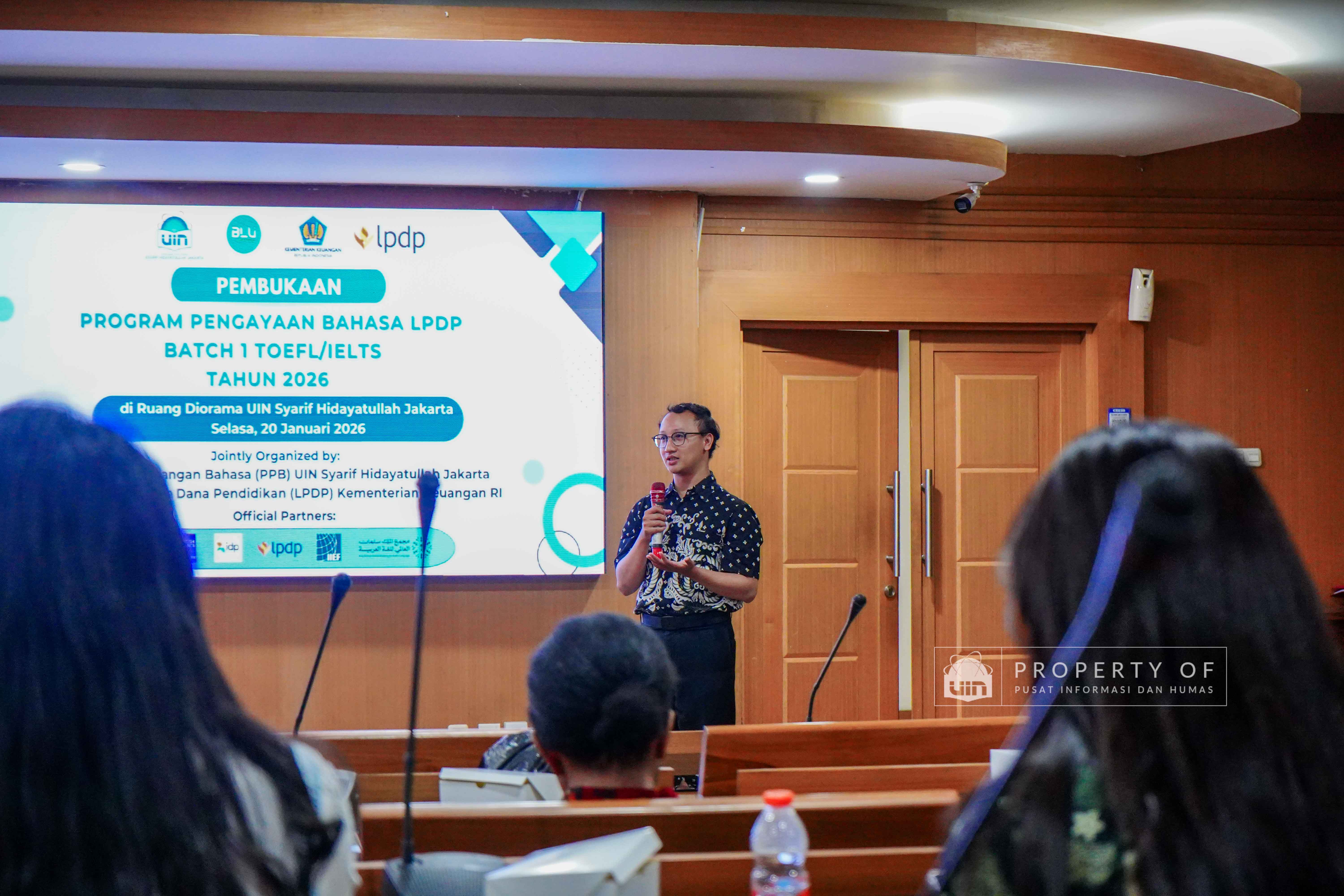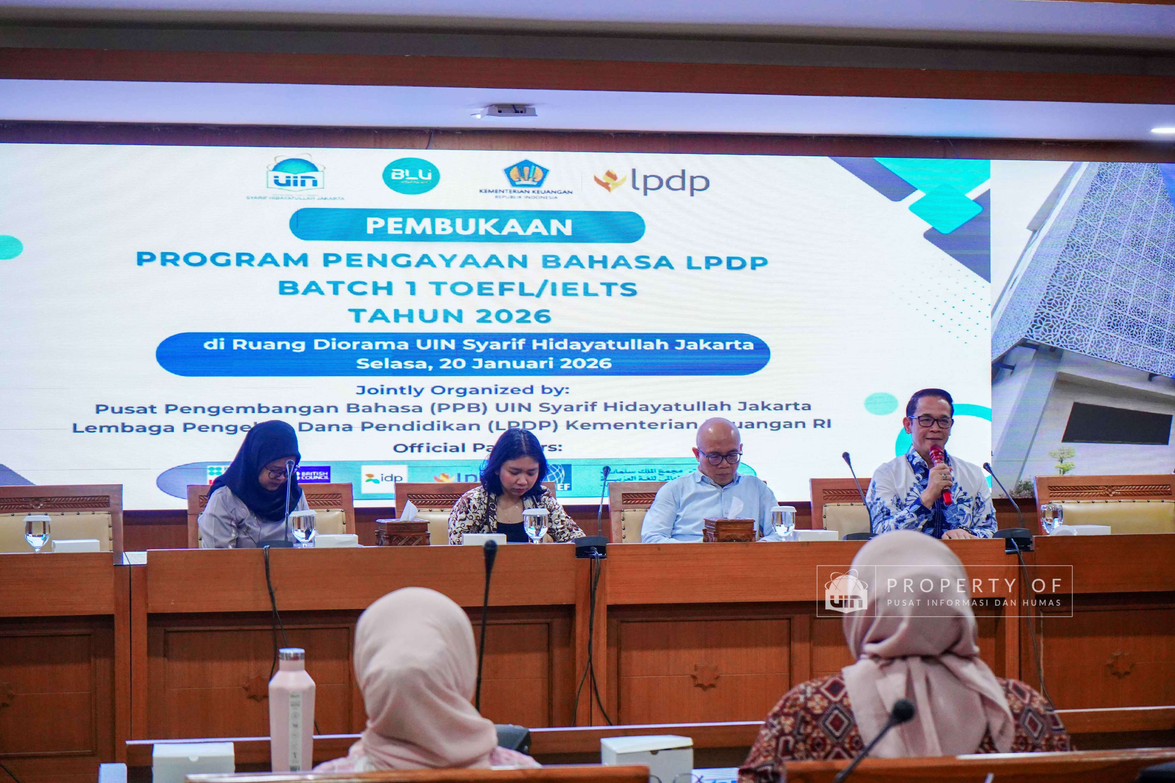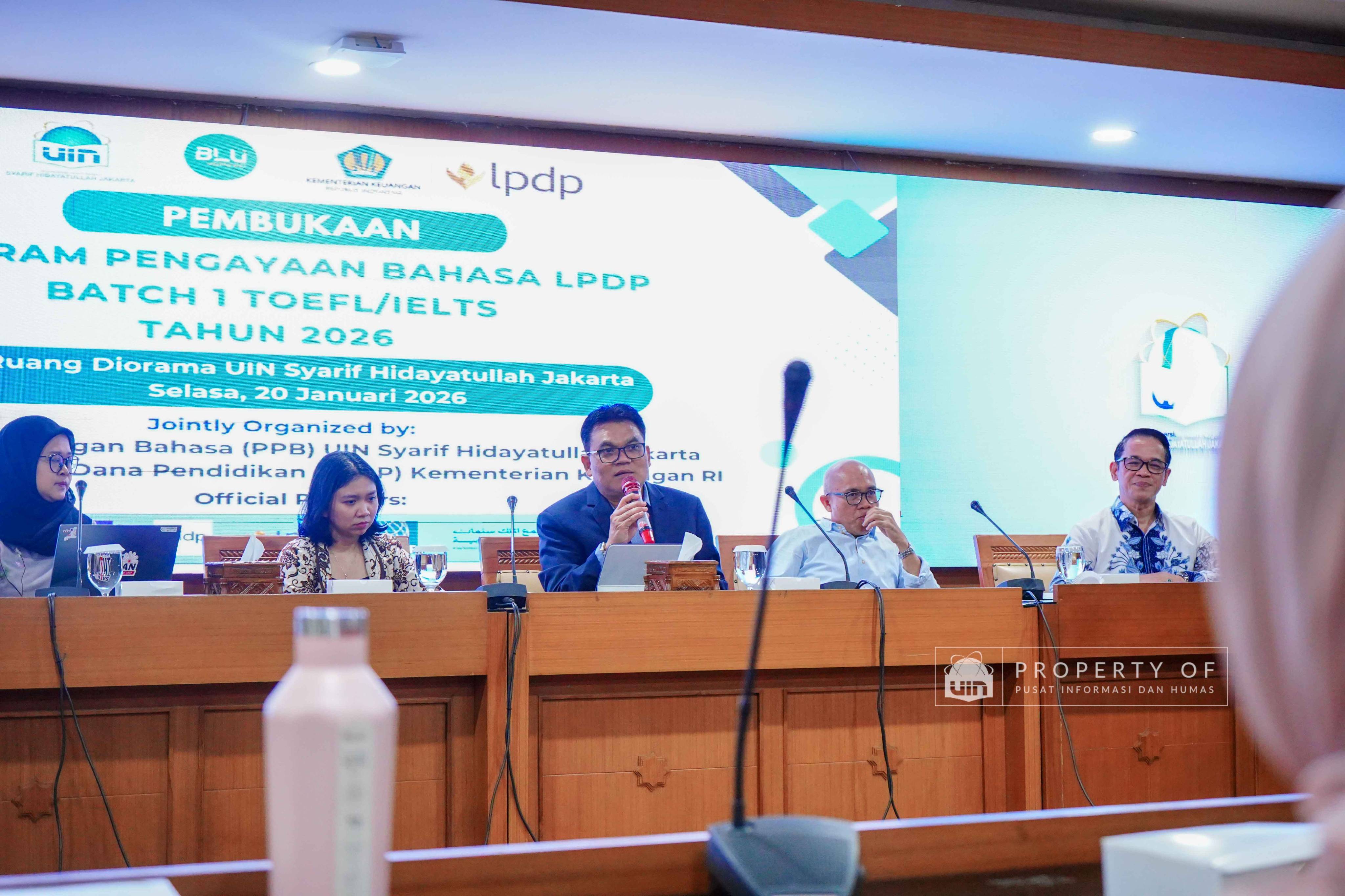 UIN Syarif Hidayatullah Jakarta membuka Program Pengayaan Bahasa LPDP Batch 1 Tahun 2026 hasil kerja sama dengan Lembaga Pengelola Dana Pendidikan (LPDP) yang berlangsung di Ruang Diorama Auditorium Harun Nasution UIN Jakarta, Selasa (20/1/2026). Program ini ditujukan bagi calon penerima beasiswa LPDP untuk meningkatkan kemampuan bahasa sebagai persiapan studi lanjut. (Fotografer: Rajif Ramadhan/Teks: Tiara Septiana Dewi/Pusat Informasi dan Humas UIN Jakarta)