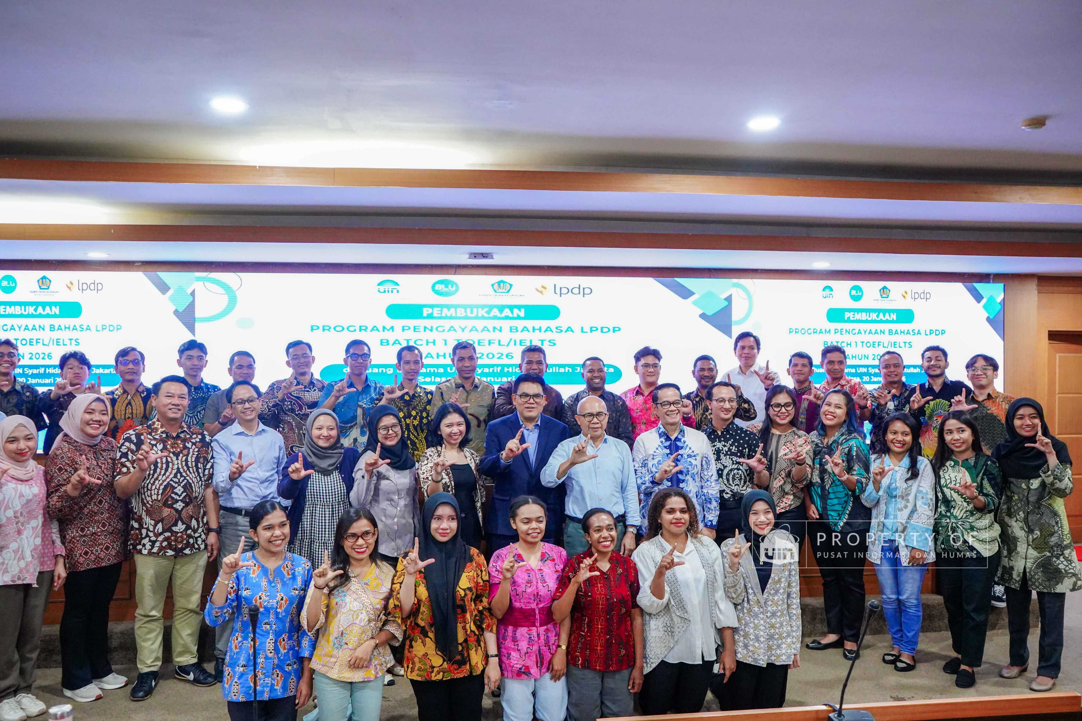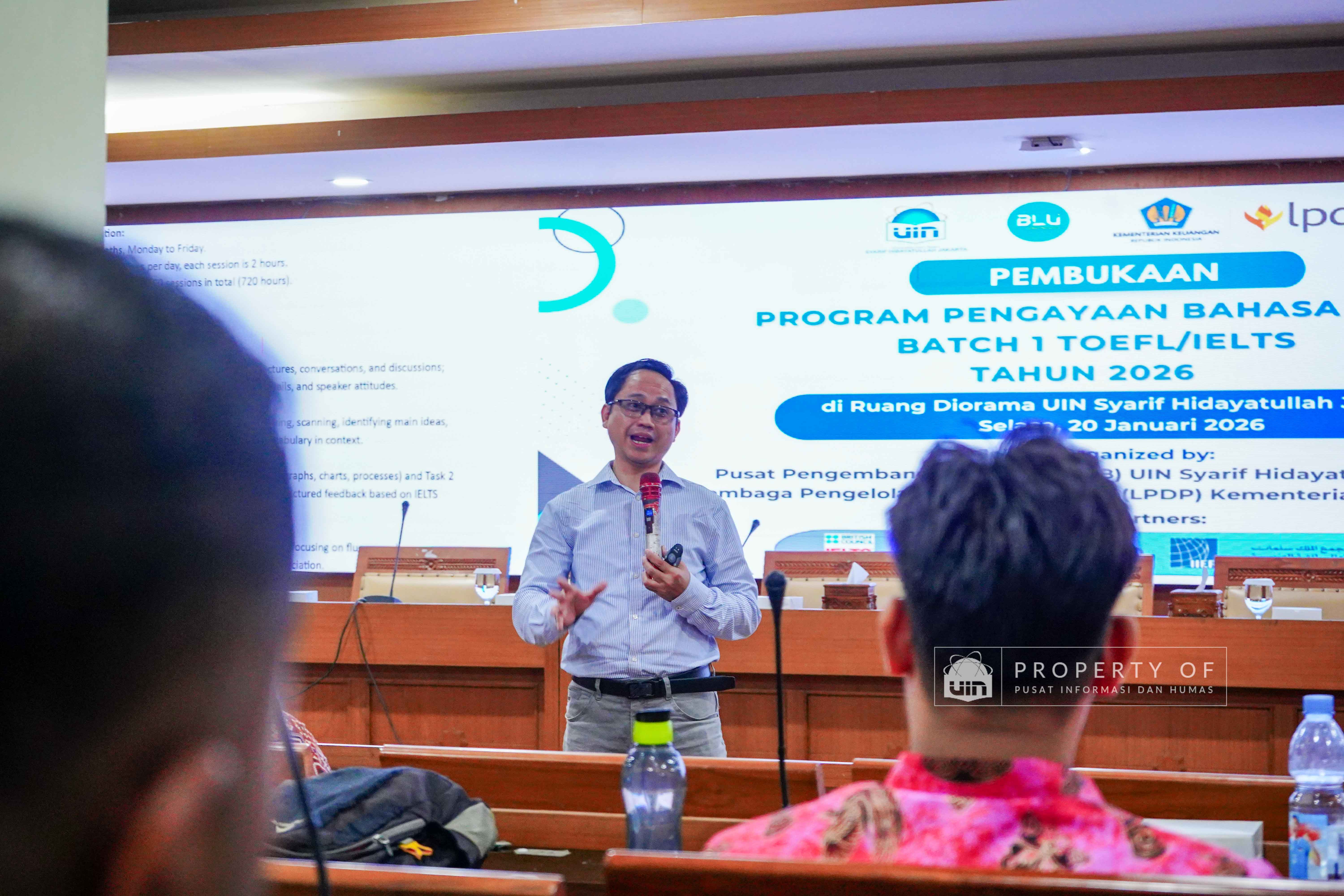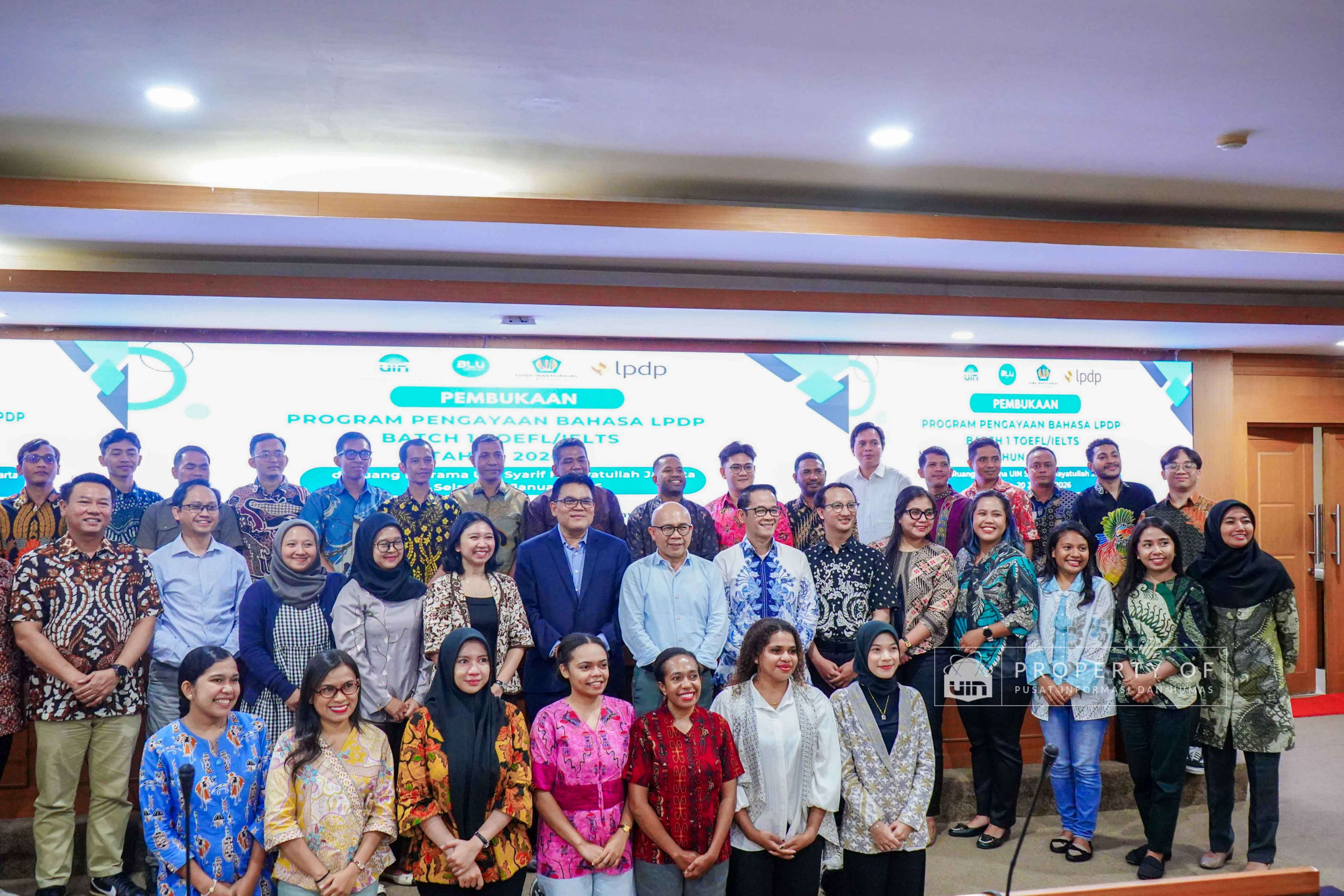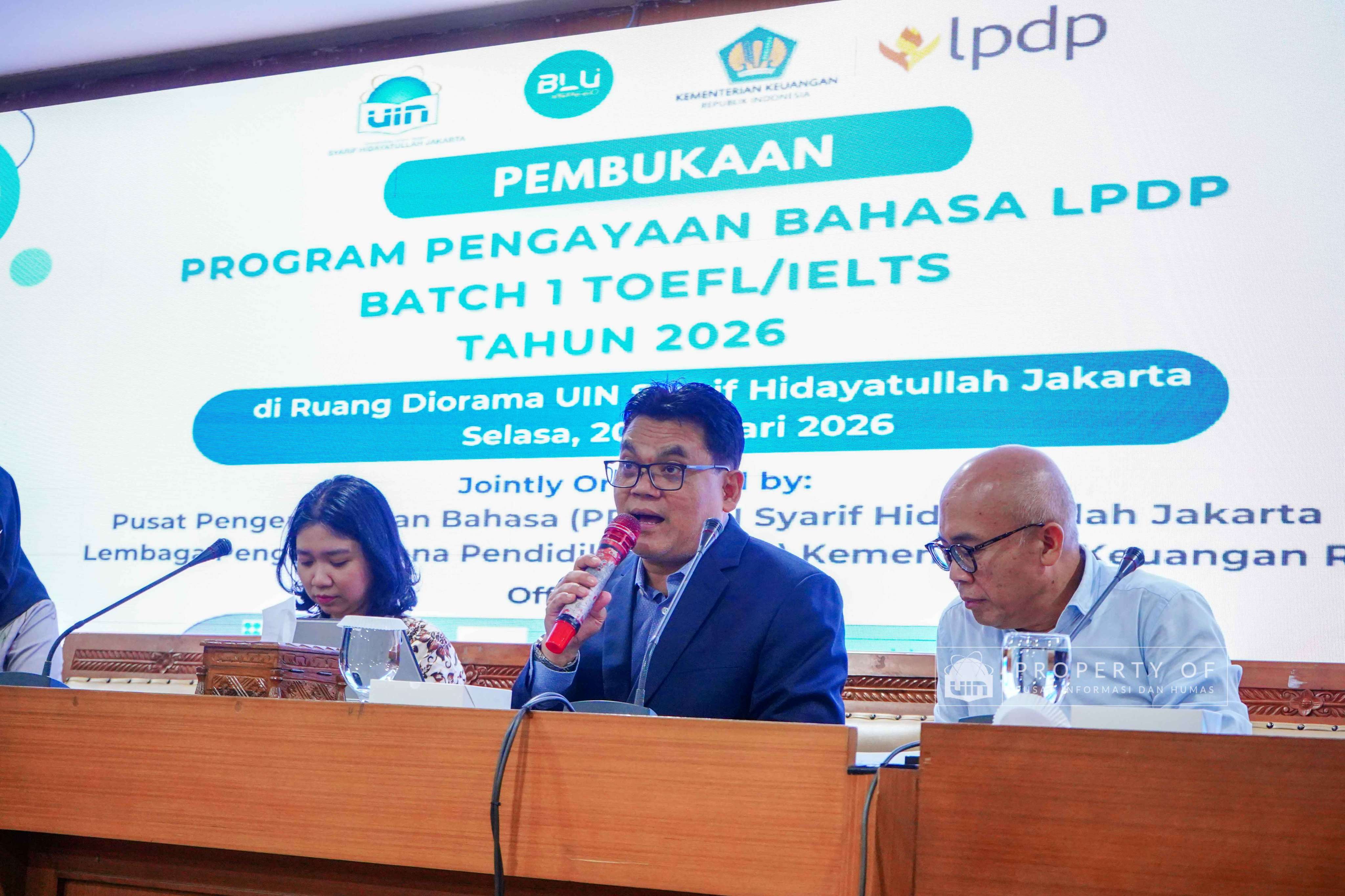 UIN Syarif Hidayatullah Jakarta membuka Program Pengayaan Bahasa LPDP Batch 1 Tahun 2026 hasil kerja sama dengan Lembaga Pengelola Dana Pendidikan (LPDP) yang berlangsung di Ruang Diorama Auditorium Harun Nasution UIN Jakarta, Selasa (20/1/2026). Program ini ditujukan bagi calon penerima beasiswa LPDP untuk meningkatkan kemampuan bahasa sebagai persiapan studi lanjut. (Fotografer: Rajif Ramadhan/Teks: Tiara Septiana Dewi/Pusat Informasi dan Humas UIN Jakarta)