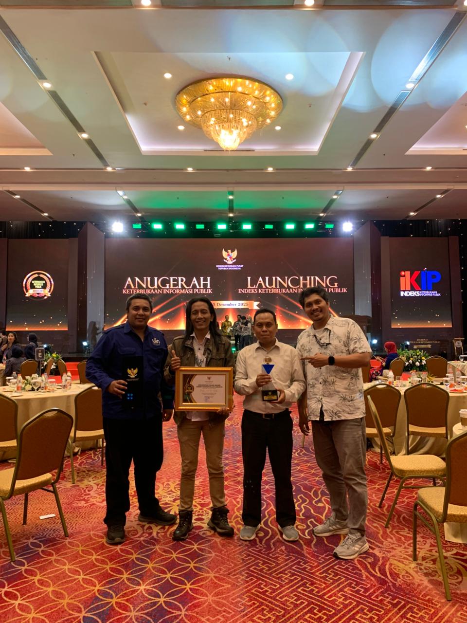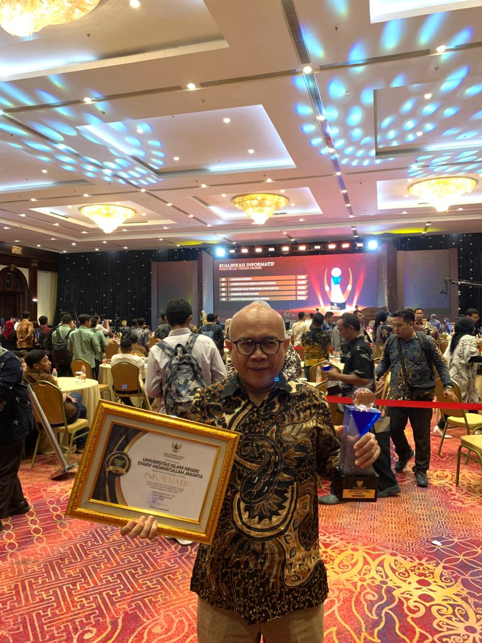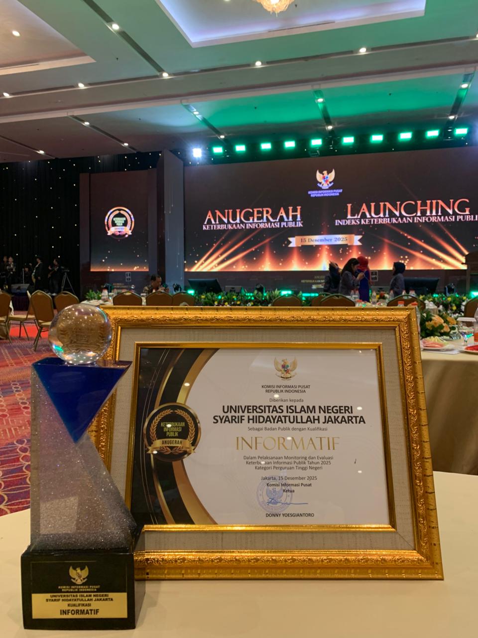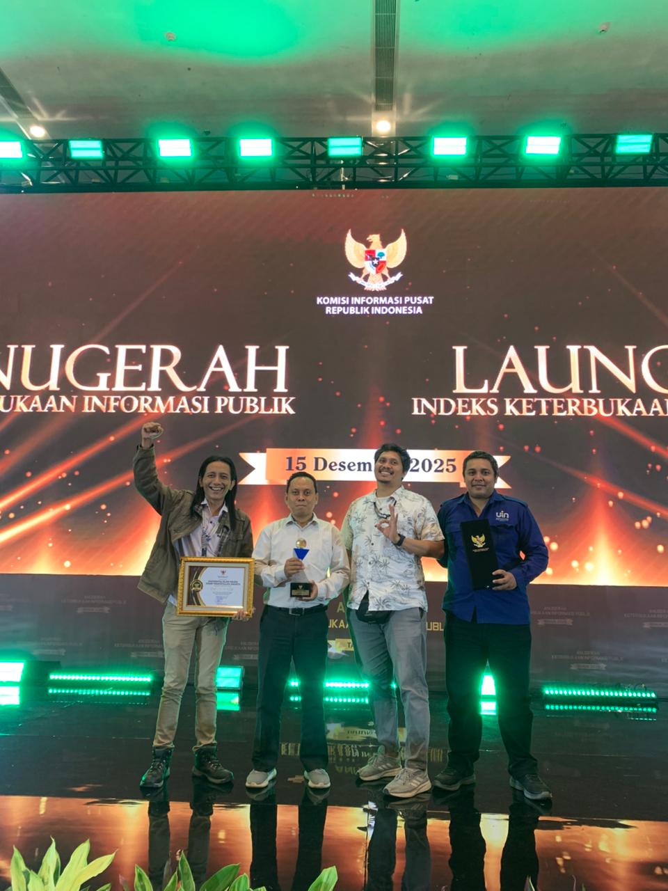 Pusat Informasi dan Humas (PIH) UIN Syarif Hidayatullah Jakarta terima penghargaan "Badan Publik dengan Kualifikasi Informatif dari Komisi Informasi Pusat (KIP) dalam Kriteria Monitoring dan Evaluasi Keterbukaan Informasi Publik tahun 2025 Kategori Perguruan Tinggi." Penganugerahan ini diserahkan pada Senin (15/12/2025) di Hotel Bidakara dalam acara Anugerah Keterbukaan Informasi Publik 2025. (Fotografer: Ridho Rizki Balebat/Teks: Tiara Septiana Dewi/Pusat Informasi dan Humas UIN Jakarta)