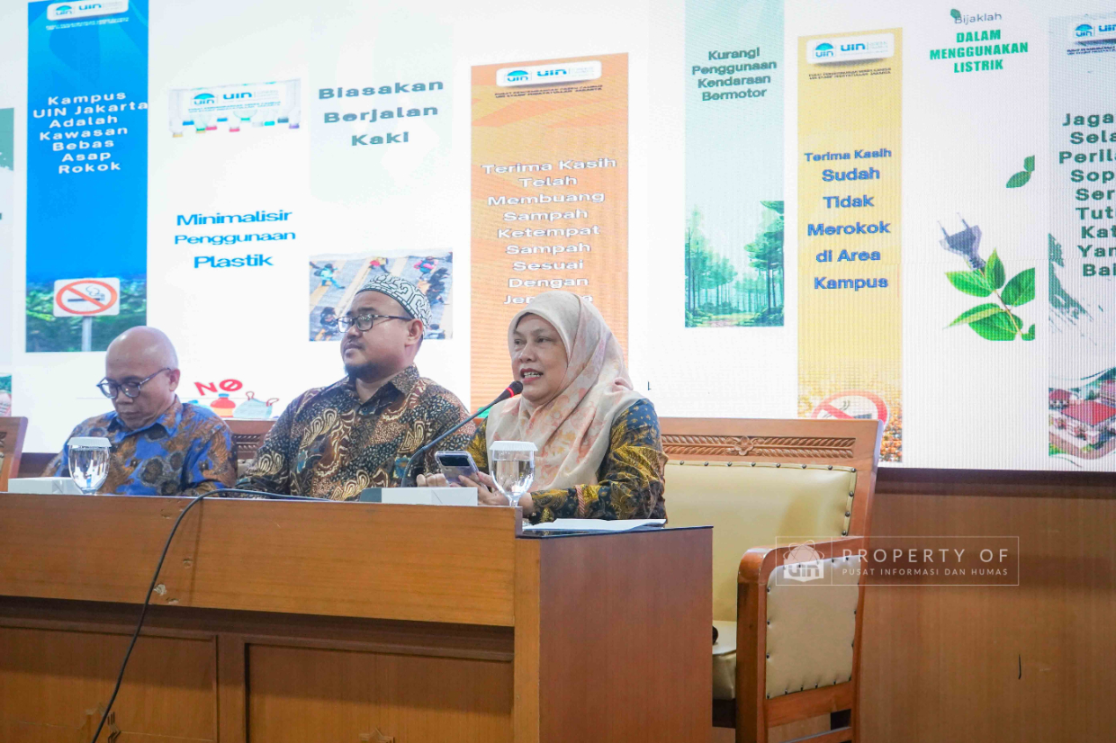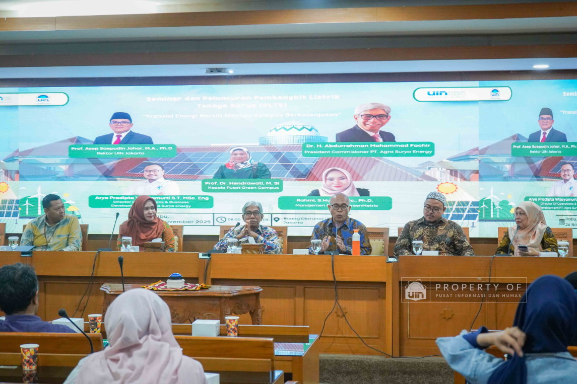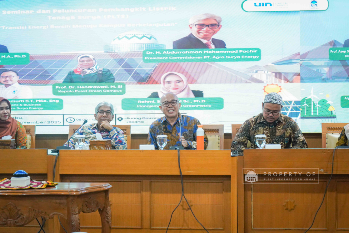Pusat Pengembangan Green Campus UIN Syarif Hidayatullah Jakarta menyelenggarakan Seminar dan Peluncuran Pembangkit Listrik Tenaga Surya (PLTS) dengan tema “Transisi Energi Bersih Menuju Kampus Berkelanjutan” di Ruang Diorama pada Rabu (26/11/2025). Rektor UIN Jakarta, Prof. Asep Saepudin Jahar, menegaskan bahwa agenda Green Campus harus diwujudkan dalam tindakan nyata, bukan sekadar slogan. Saat ini, PLTS telah diimplementasikan di Gedung Fakultas Ilmu Tarbiyah dan Keguruan (FITK) serta Fakultas Sains dan Teknologi (FST). (Fotografer: Tiara Abdhie/ Teks: Nabila Azzahra Syawal/Pusat Informasi dan Humas UIN Jakarta)