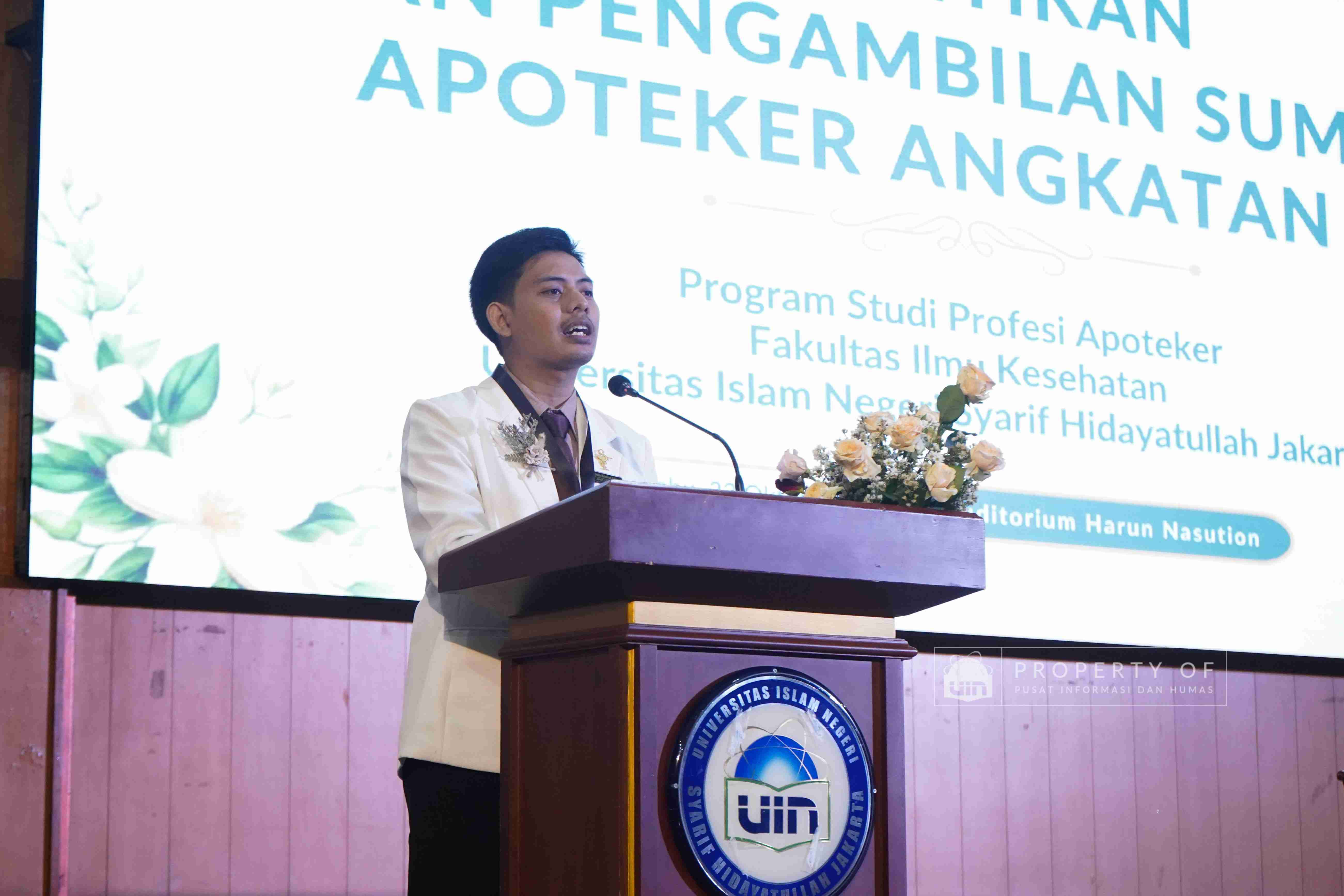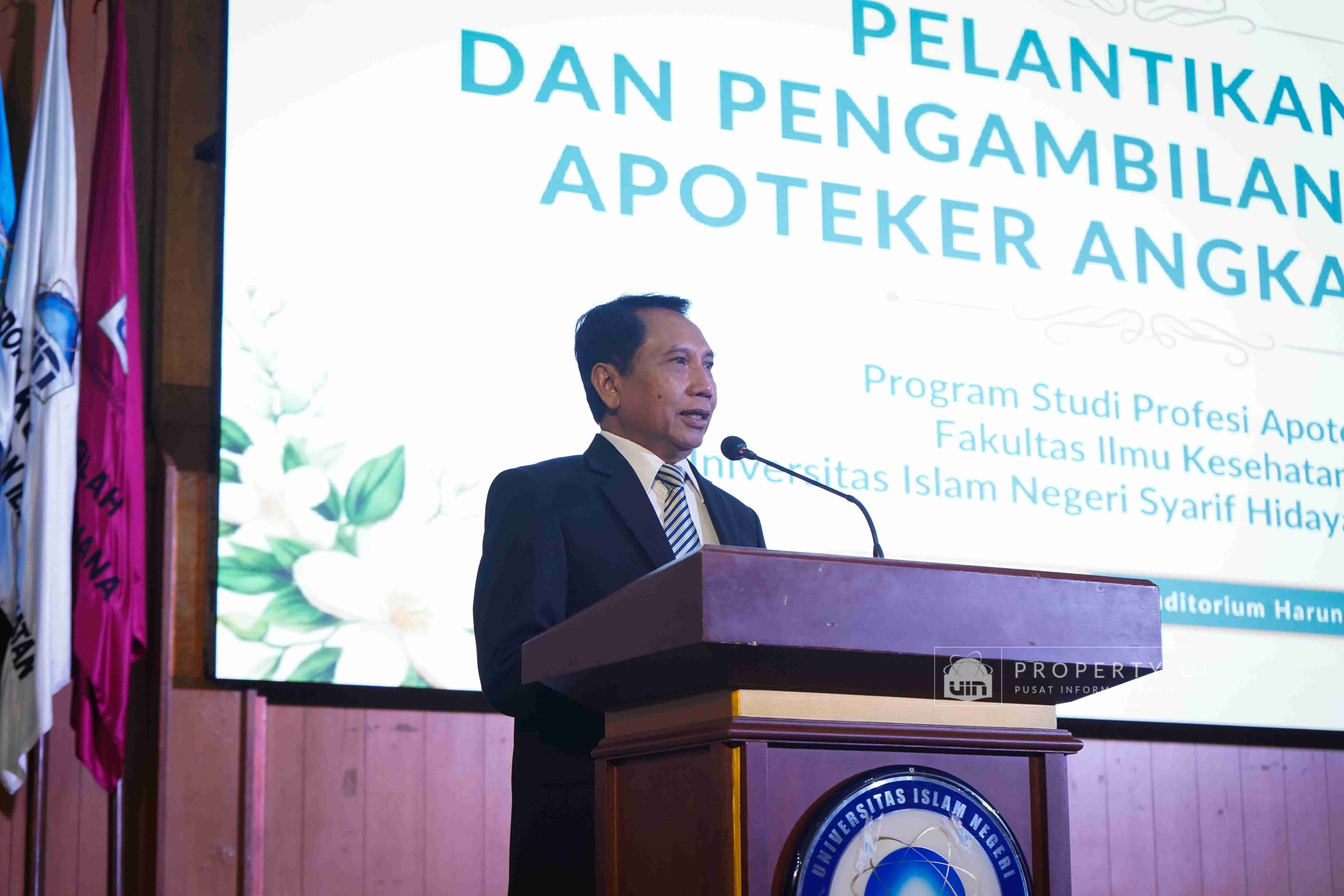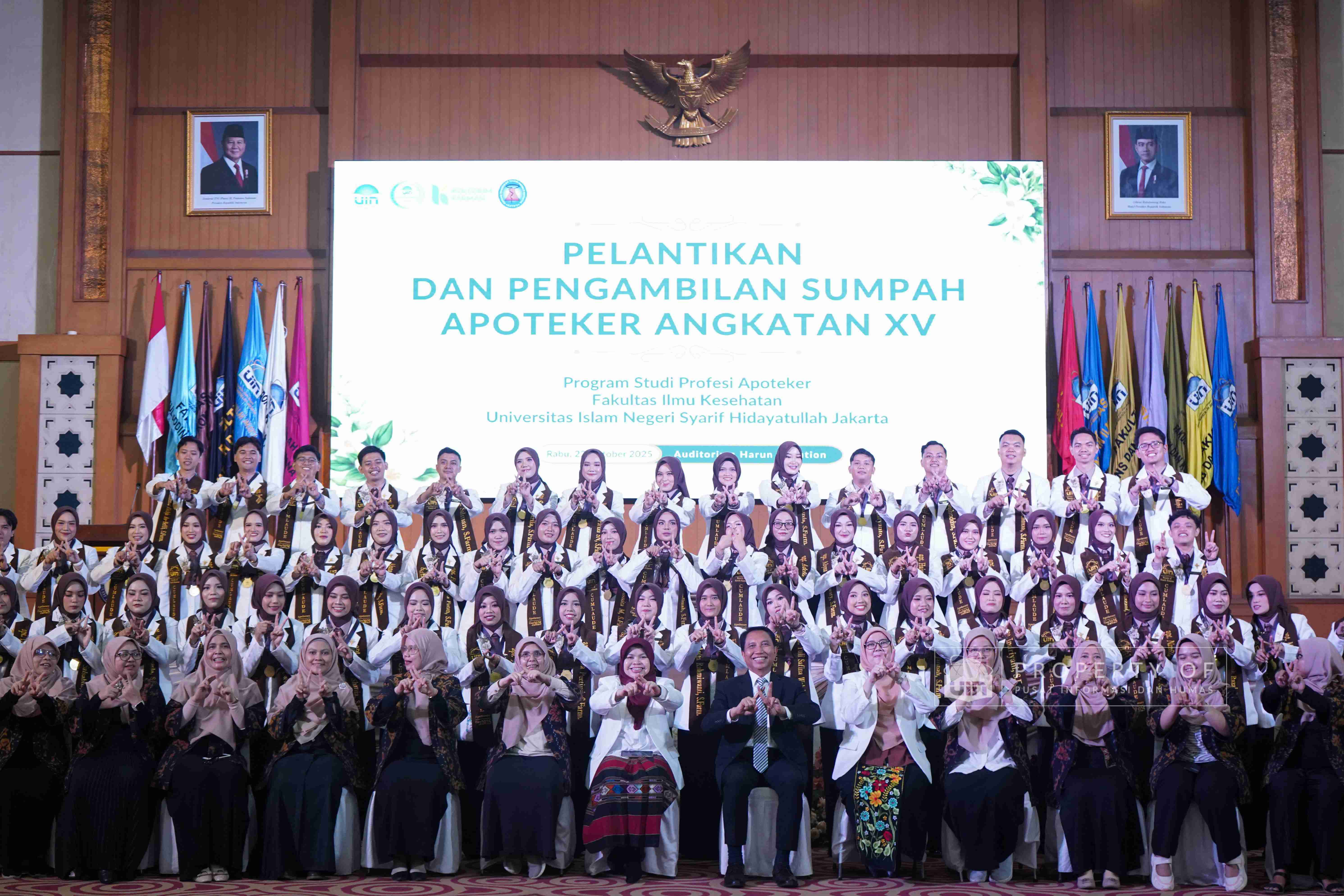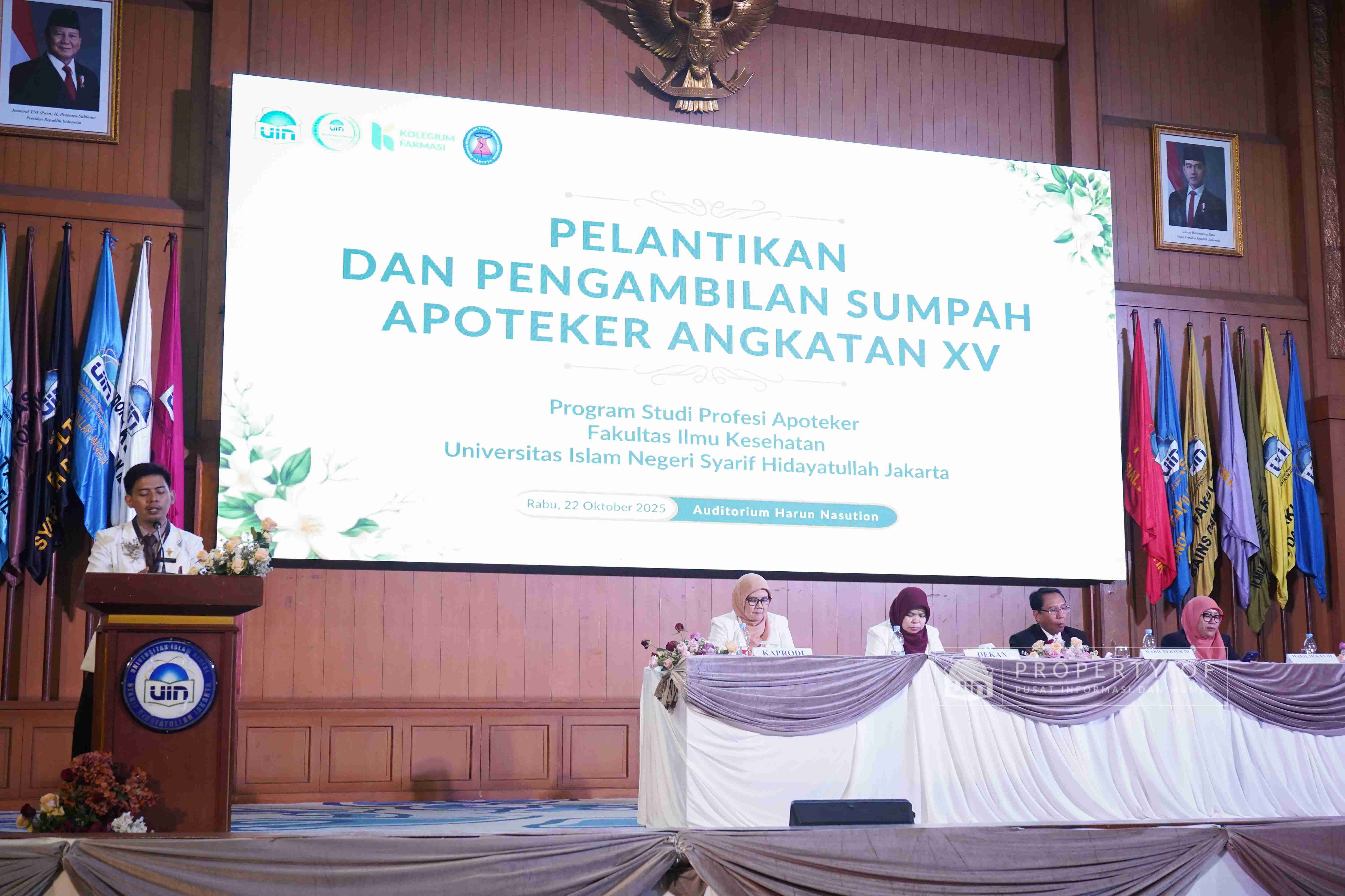 Program studi profesi apoteker Fakultas Ilmu Kesehatan UIN Jakarta gelar Pelantikan dan pengambilan Sumpah Apoteker angkatan ke -15 yang diselenggarakan di Auditorium dr. Dr. MK. Tadjudin pada Rabu (22/10/2025). Mewakili Rektor UIN Jakarta, Wakil Rektor Bidang Kemahasiswaan UIN Jakarta, Prof. Dr. Ali Munhanif, M.A., Ph.D, mengungkapkan selamat kepada para sarjana apoteker yang sudah melakukan Sumpah Apoteker. (Fotografer: Aqilah Qurratulaini/Teks: Muhamad Arifin Ilham/Pusat Informasi dan Humas UIN Jakarta)