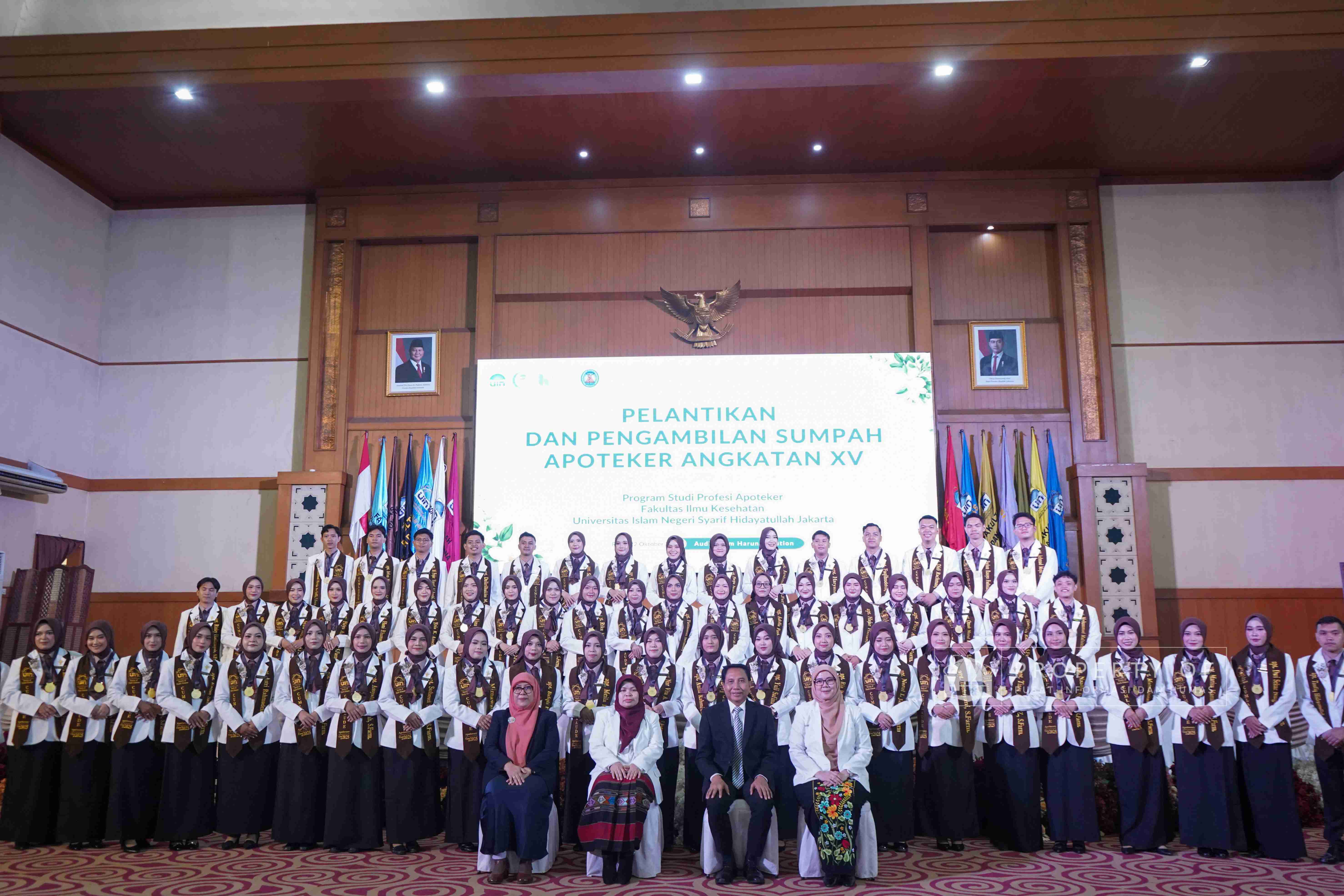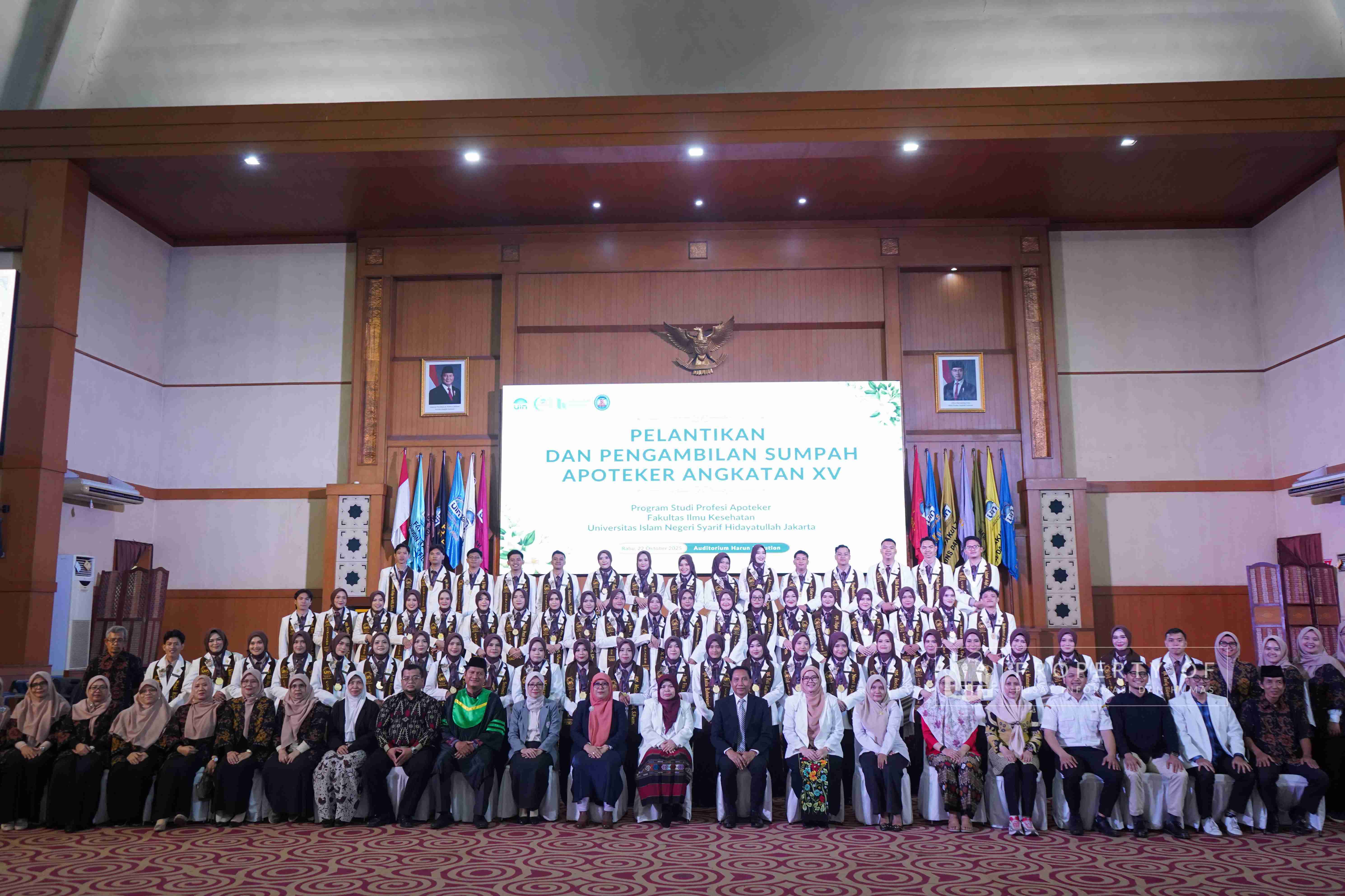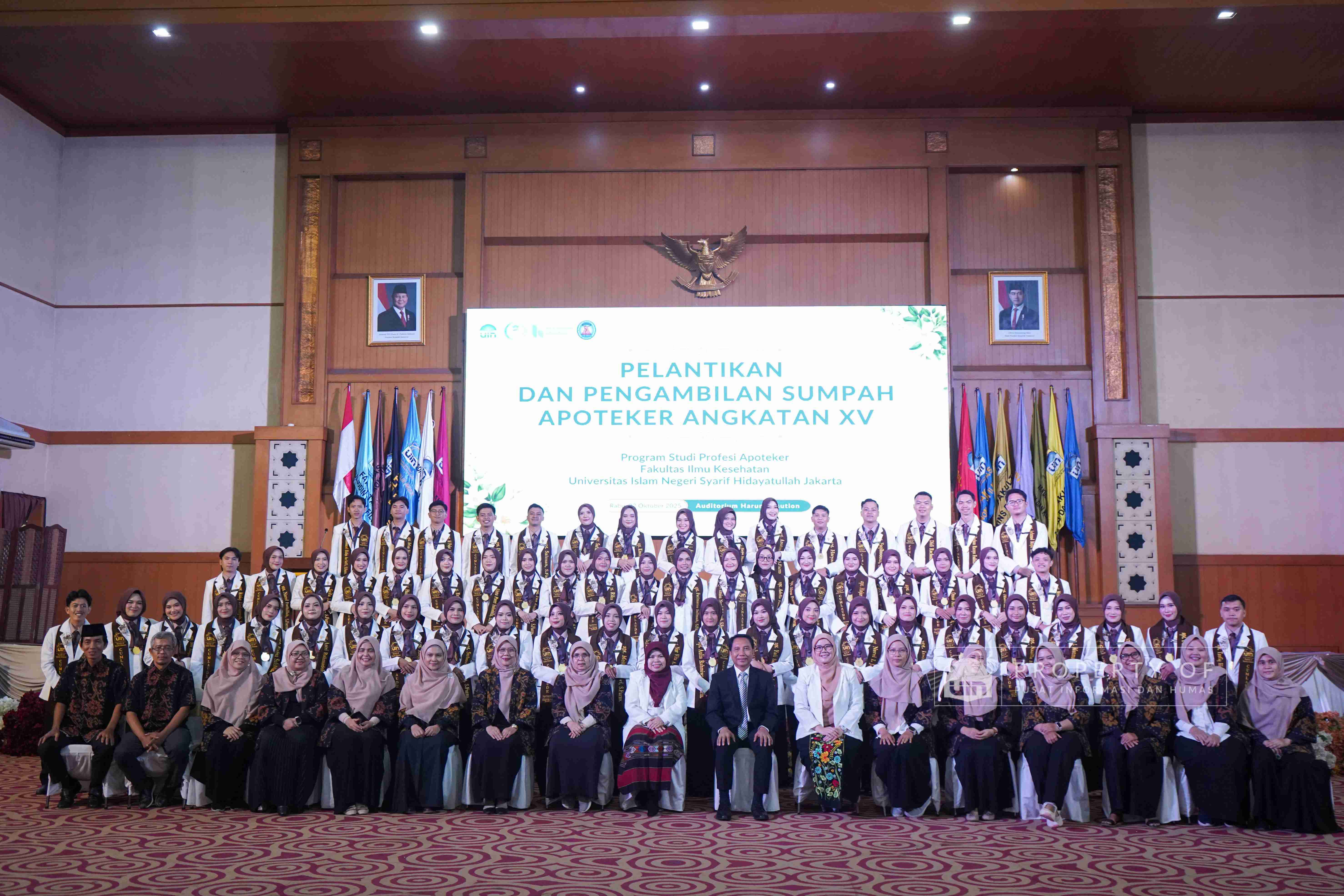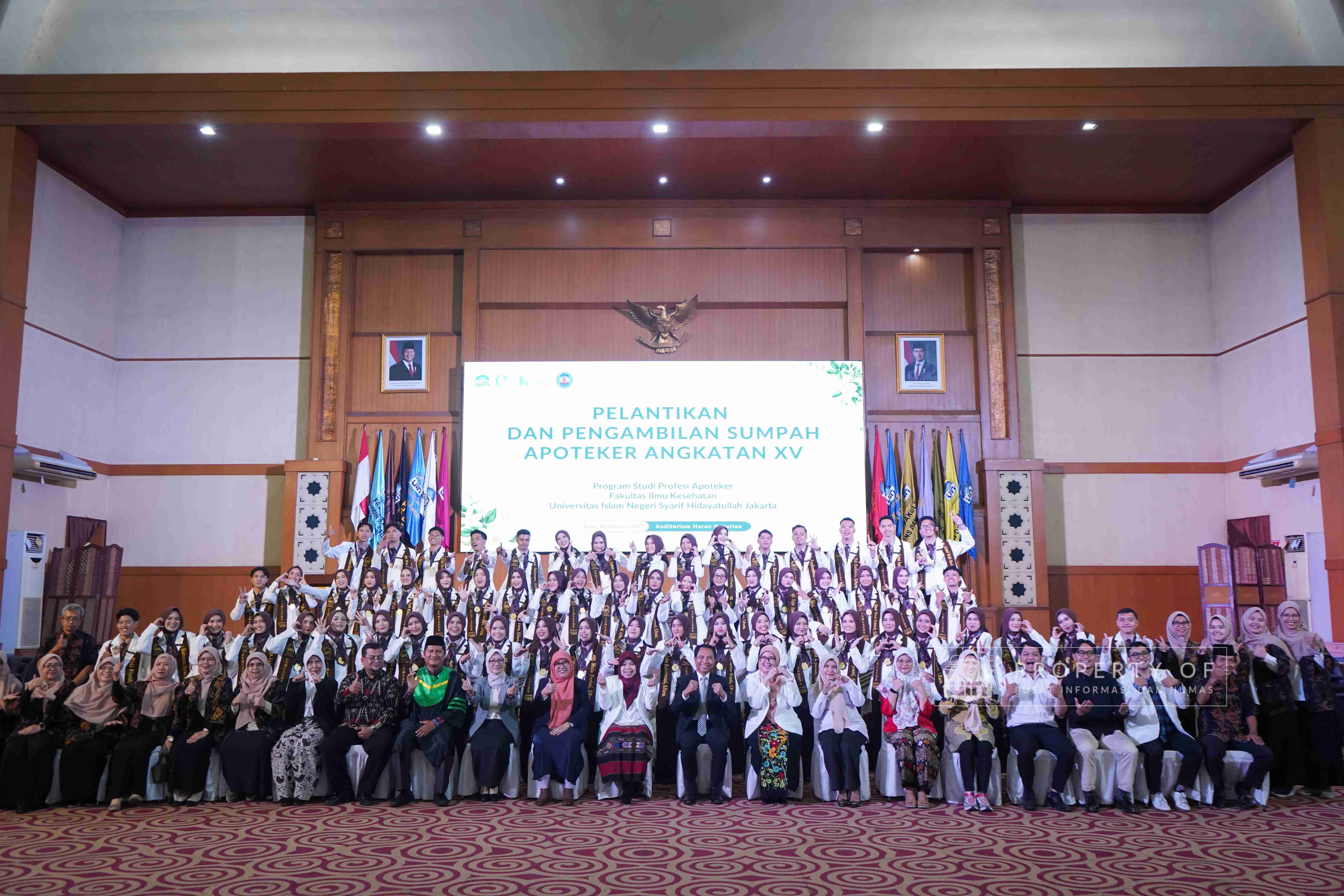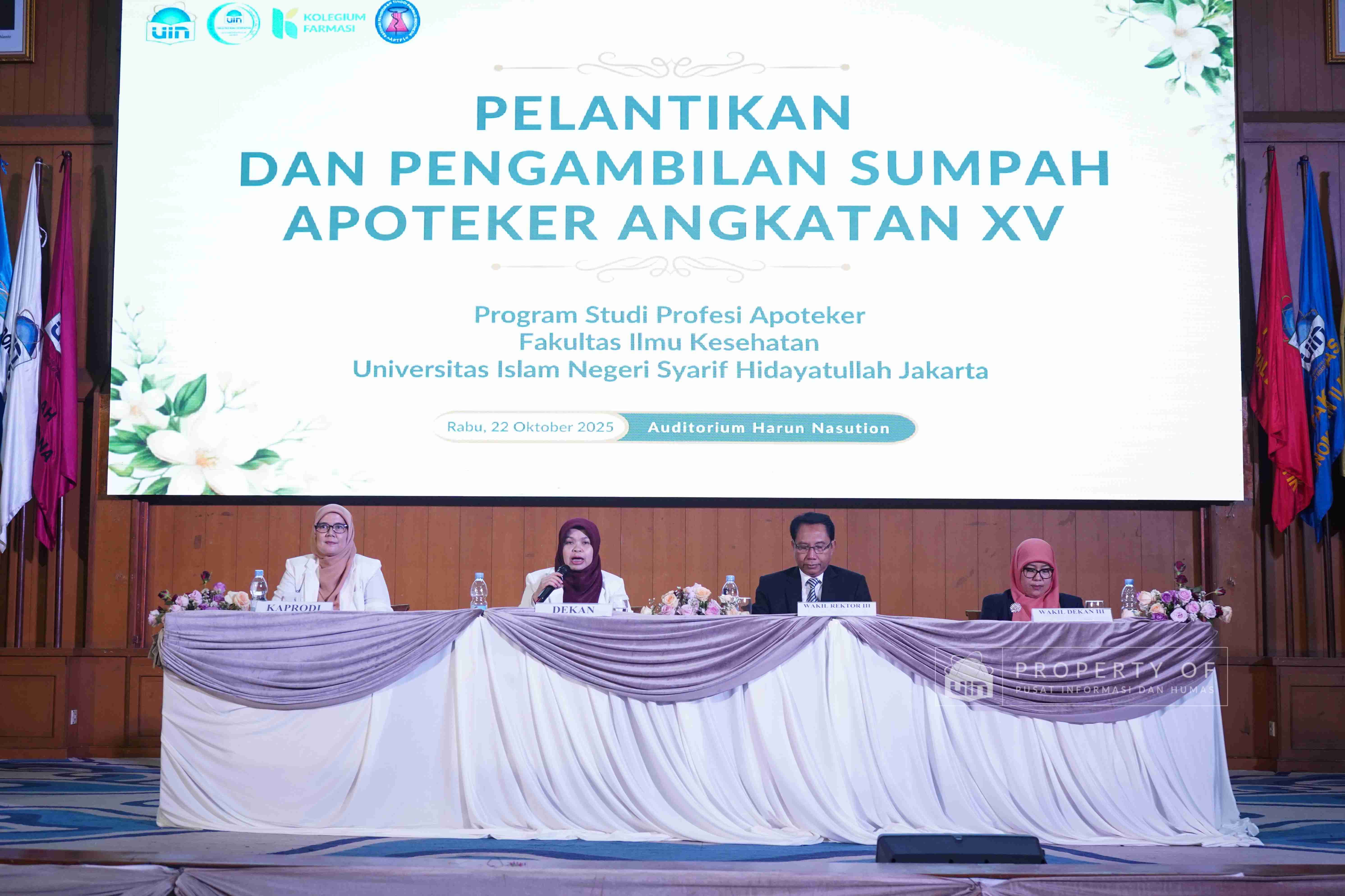 Program studi profesi apoteker Fakultas Ilmu Kesehatan UIN Jakarta gelar Pelantikan dan pengambilan Sumpah Apoteker angkatan ke -15 yang diselenggarakan di Auditorium dr. Dr. MK. Tadjudin pada Rabu (22/10/2025). Mewakili Rektor UIN Jakarta, Wakil Rektor Bidang Kemahasiswaan UIN Jakarta, Prof. Dr. Ali Munhanif, M.A., Ph.D, mengungkapkan selamat kepada para sarjana apoteker yang sudah melakukan Sumpah Apoteker. (Fotografer: Aqilah Qurratulaini/Teks: Muhamad Arifin Ilham/Pusat Informasi dan Humas UIN Jakarta)