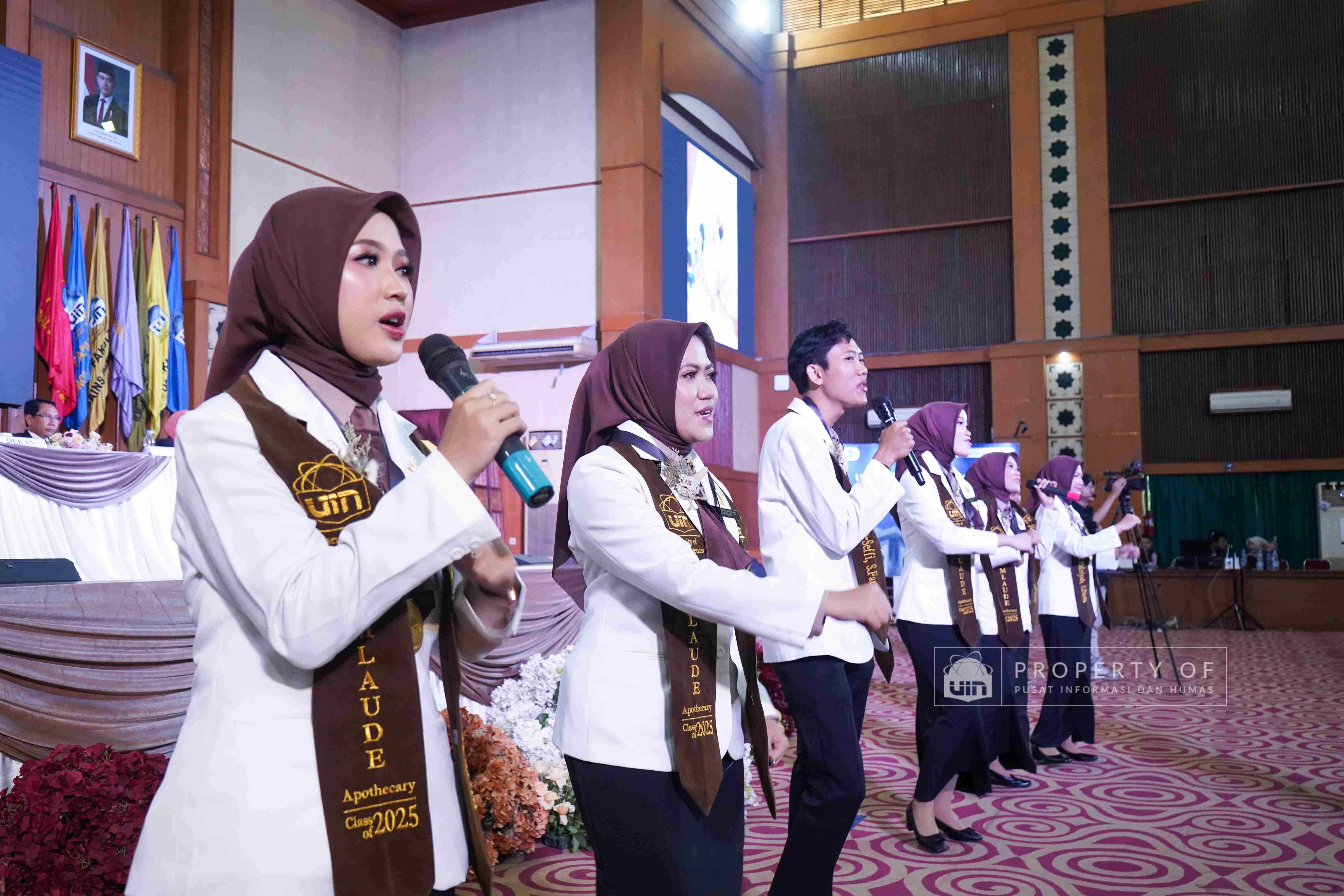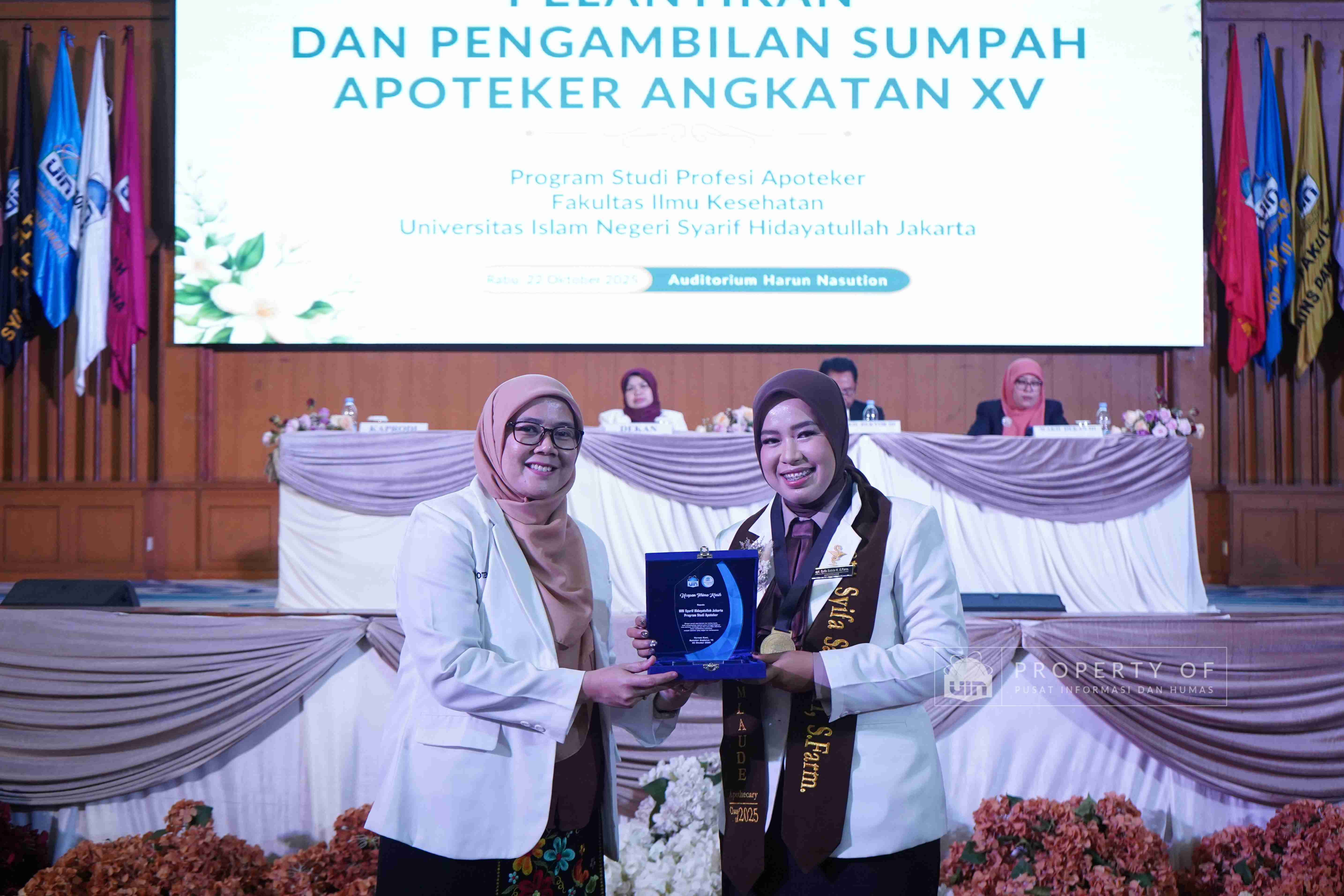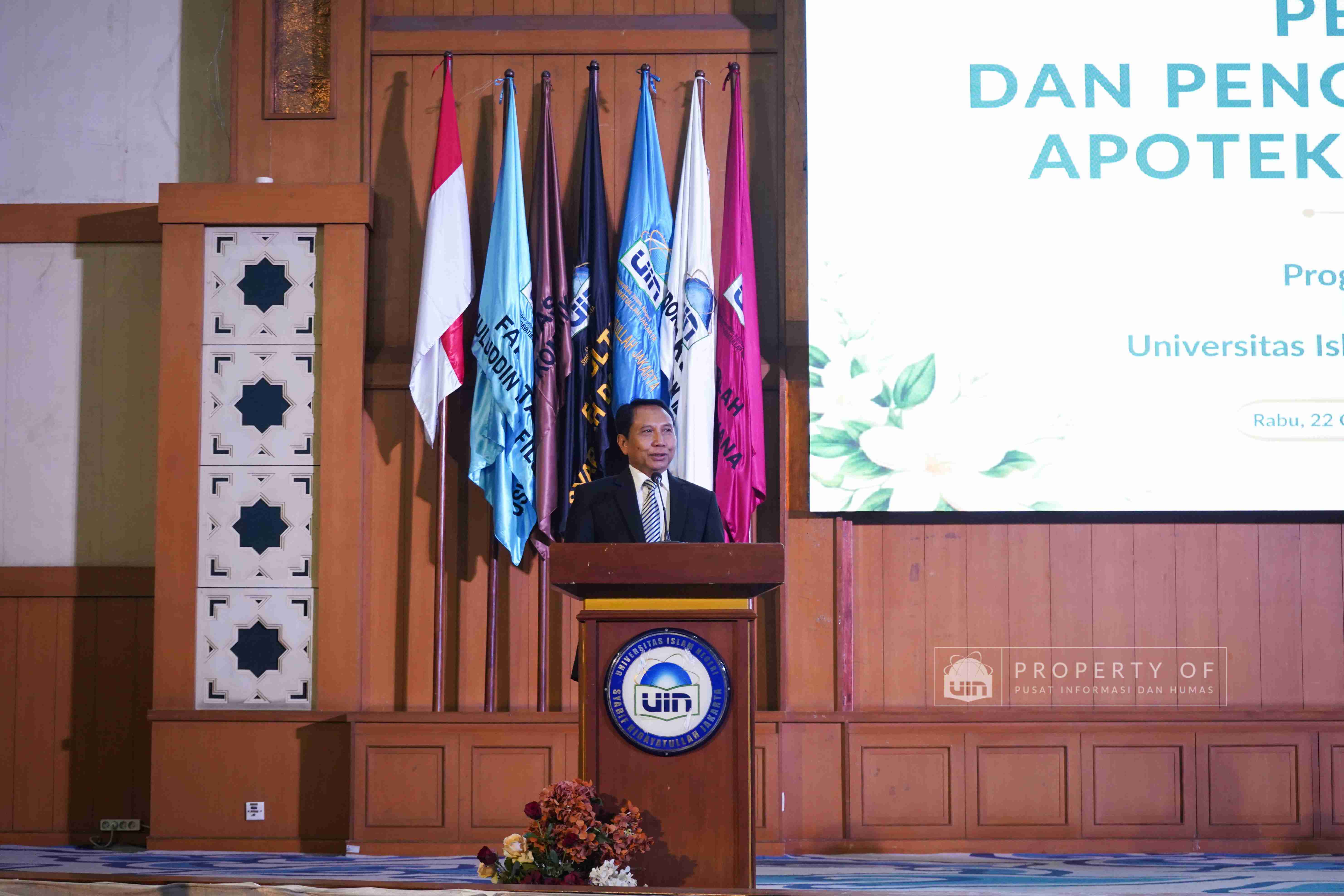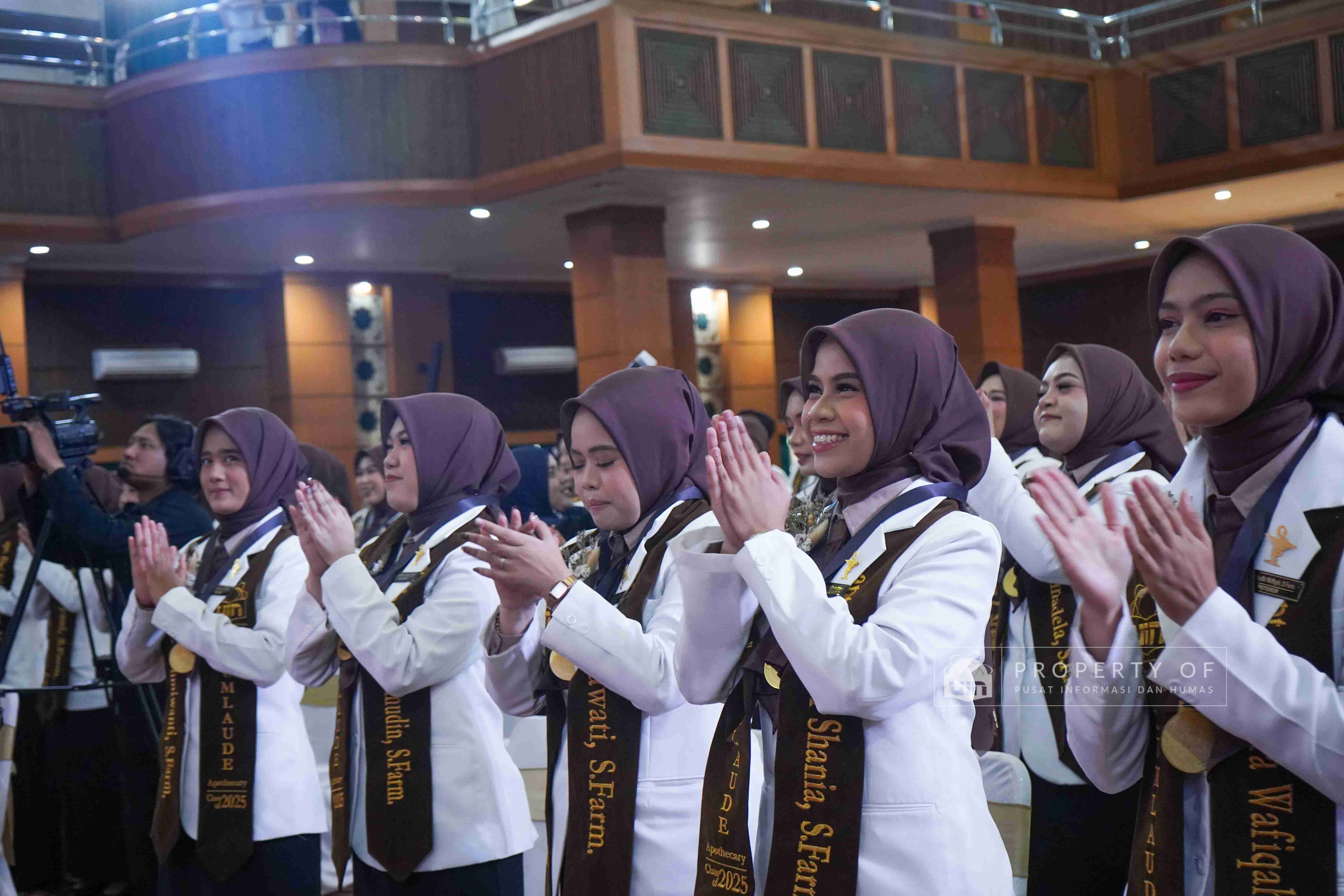 Program studi profesi apoteker Fakultas Ilmu Kesehatan UIN Jakarta gelar Pelantikan dan pengambilan Sumpah Apoteker angkatan ke -15 yang diselenggarakan di Auditorium dr. Dr. MK. Tadjudin pada Rabu (22/10/2025). Mewakili Rektor UIN Jakarta, Wakil Rektor Bidang Kemahasiswaan UIN Jakarta, Prof. Dr. Ali Munhanif, M.A., Ph.D, mengungkapkan selamat kepada para sarjana apoteker yang sudah melakukan Sumpah Apoteker. (Fotografer: Aqilah Qurratulaini/Teks: Muhamad Arifin Ilham/Pusat Informasi dan Humas UIN Jakarta)