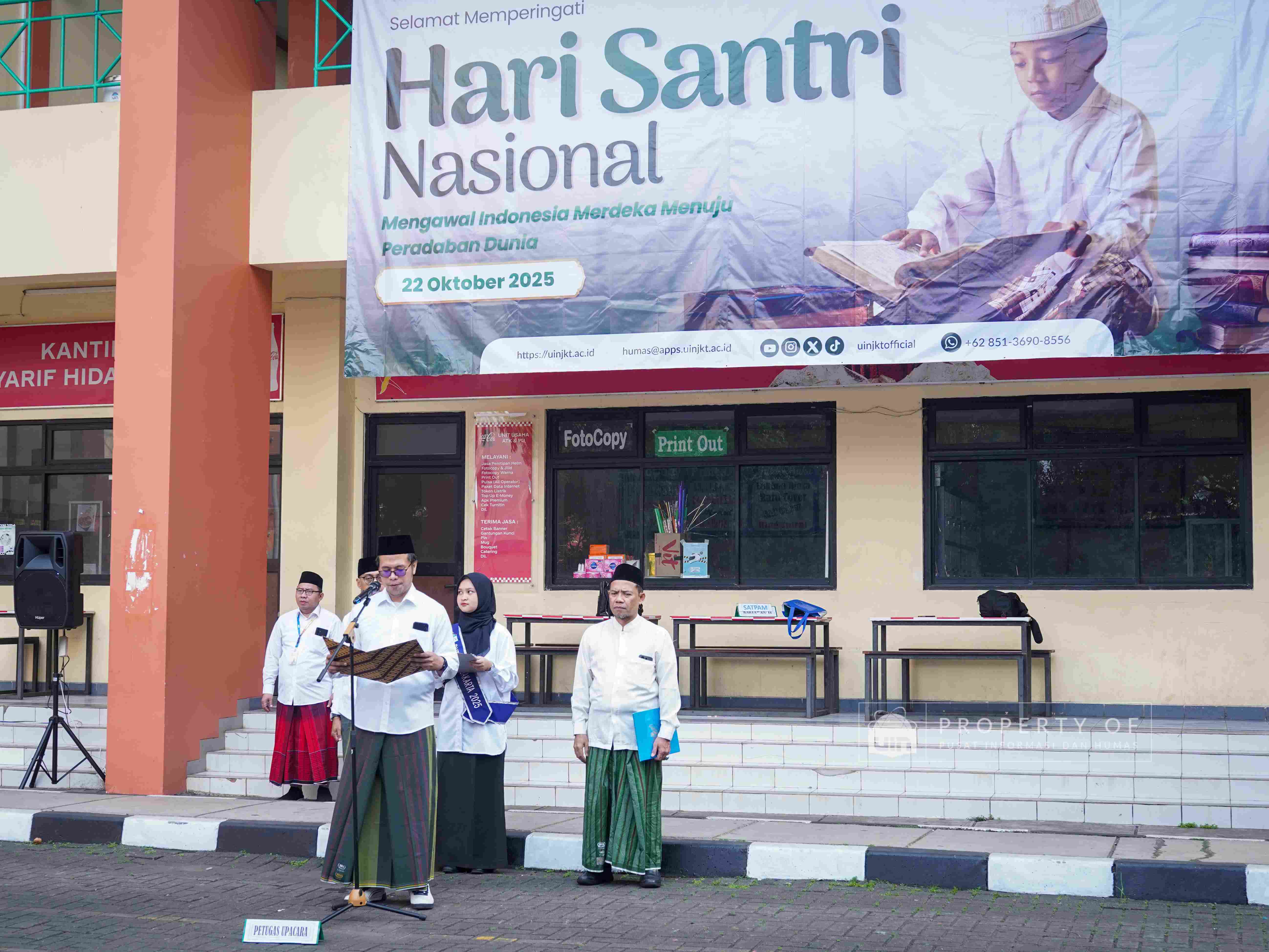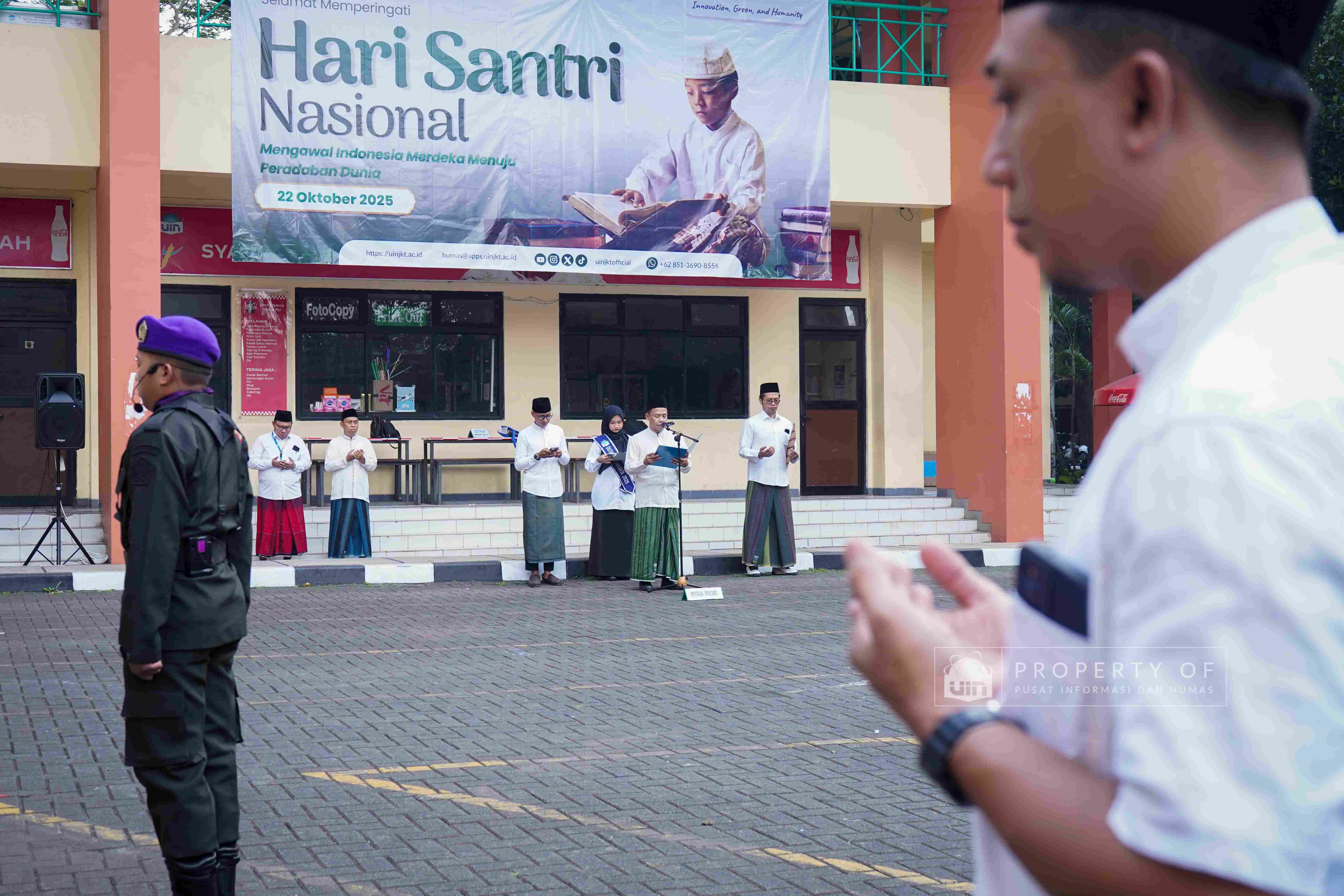 Dalam rangka memperingati hari bersejarah tersebut, UIN Syarif Hidayatullah Jakarta menggelar upacara Hari Santri Nasional (HSN), Rabu, (22/10/2025). Upacara berlangsung di lapangan Student Center dan dipimpin langsung oleh Rektor UIN Jakarta Prof. Asep Saepudin Jahar, M.A. P.h.D. dan segenap sivitas akademika dengan mengusung tema “Mengawal Indonesia Merdeka Menuju Peradaban Dunia”. (Fotografer: Aqilah Qurratulaini/Teks: Muhamad Arifin Ilham/Pusat Informasi dan Humas UIN Jakarta)