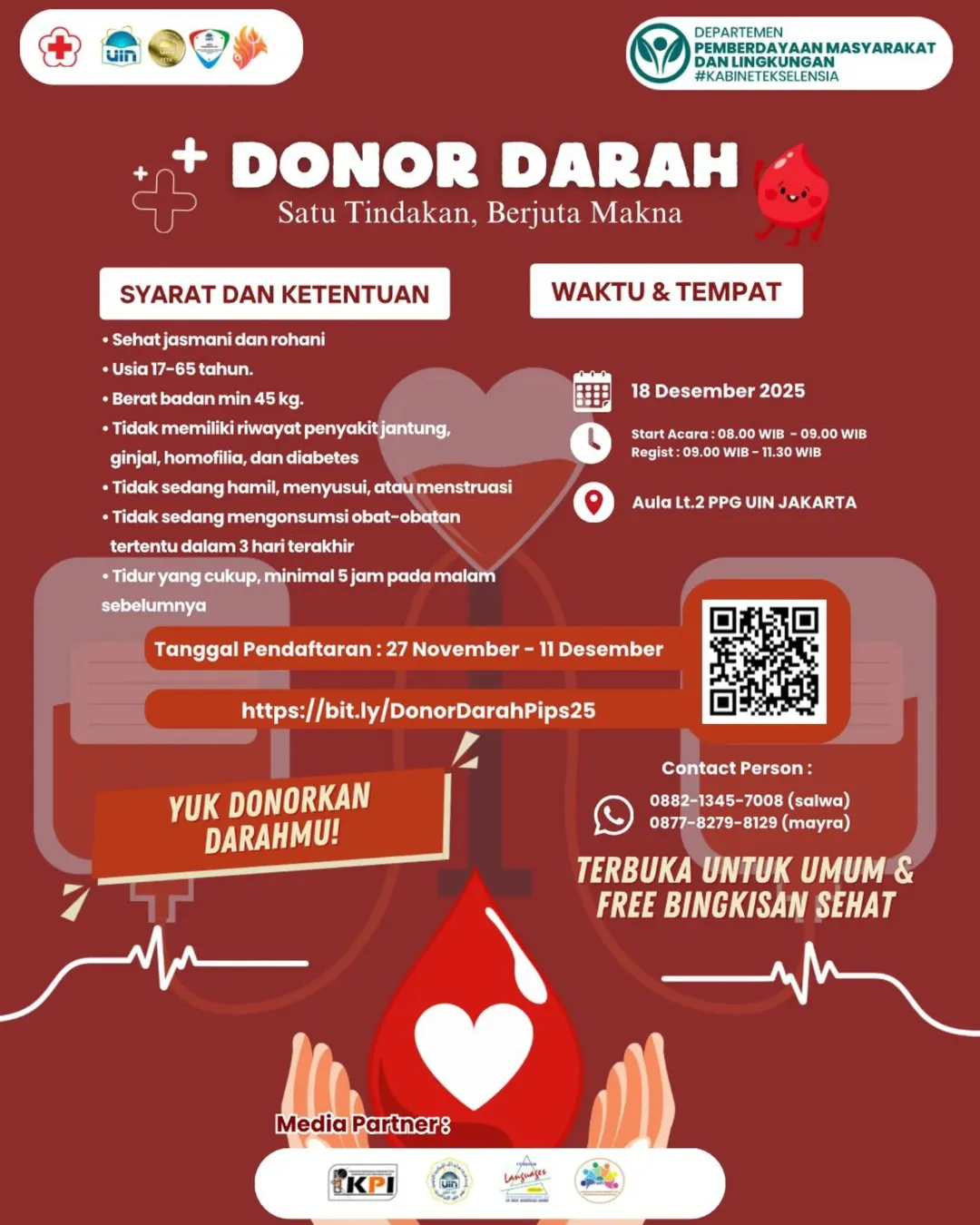 Kamu bisa jadi bagian dari penyelamat bagi mereka yang membutuhkan. Yuk ikut berkontribusi dalam kegiatan donor darah yang diadakan oleh HMPS Pendidikan Ilmu Pengetahuan Sosial (PIPS) UIN Syarif Hidayatullah Jakarta!