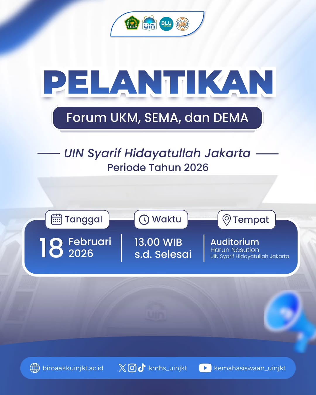 Pelantikan Forum UKM, SEMA, dan DEMA UIN Syarif Hidayatullah Jakarta Periode 2026 akan segera dilaksanakan sebagai momentum awal kepengurusan baru dalam mengemban amanah dan tanggung jawab organisasi.