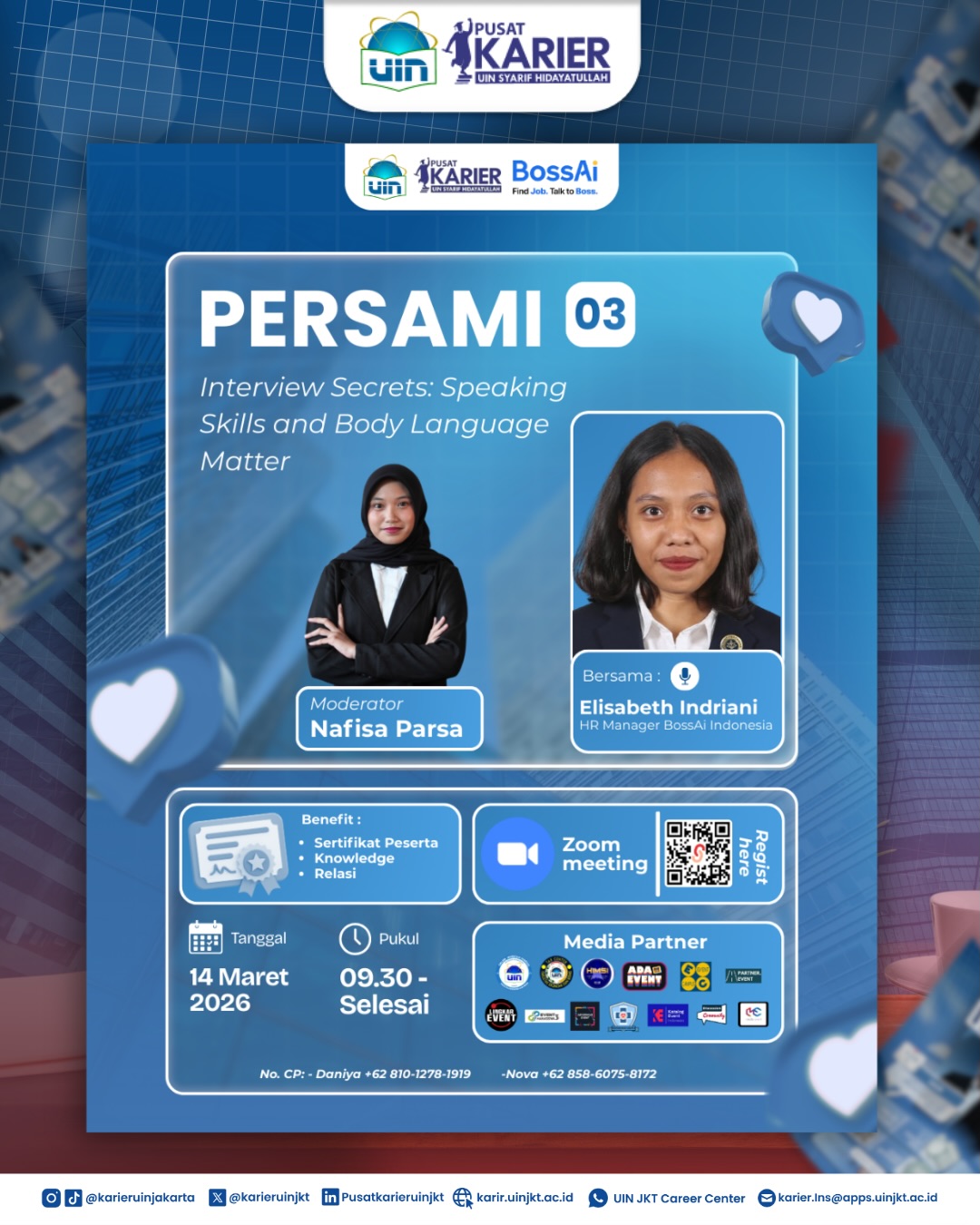 Pusat Karier UIN Syarif Hidayatullah Jakarta kembali menghadirkan ๐ฃ๐๐ฅ๐ฆ๐๐ ๐ [๐ฃ๐ฒ๐ฟ๐๐ถ๐ฎ๐ฝ๐ฎ๐ป ๐๐ฎ๐ฟ๐ถ๐ฒ๐ฟ, ๐๐ธ๐๐ฝ๐น๐ผ๐ฟ๐ฎ๐๐ถ, ๐ฑ๐ฎ๐ป ๐ ๐ฎ๐ด๐ฎ๐ป๐ด ๐ ๐ฎ๐ต๐ฎ๐๐ถ๐๐๐ฎ ๐๐ป๐๐ฝ๐ถ๐ฟ๐ฎ๐๐ถ๐ณ] dengan menghadirkan speaker inspiratif bersama ๐๐ผ๐๐๐๐ถ ๐๐ป๐ฑ๐ผ๐ป๐ฒ๐๐ถ๐ฎ.