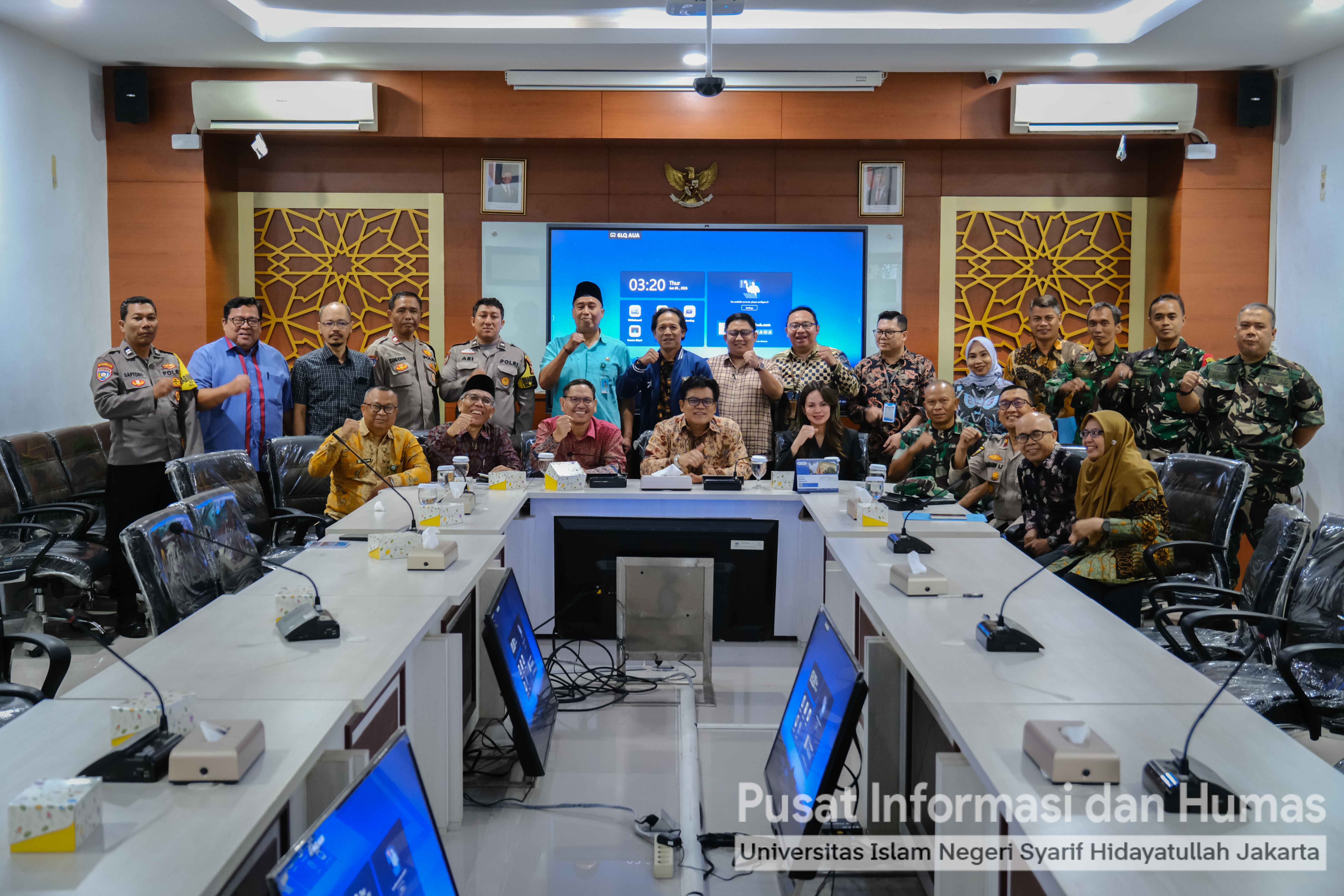 UIN Syarif Hidayatullah Jakarta menggelar rapat koordinasi bersama sejumlah stakeholder di Ruang Sidang Utama, Gedung Rektorat, Kamis (5/6/2025). Kegiatan ini bertujuan untuk memperkuat sinergi lintas sektor dalam pengamanan dan penertiban aset negara, khususnya aset milik Kementerian Agama RI yang digunakan oleh UIN Jakarta, guna memastikan tata kelola aset berjalan secara tertib, aman, dan sesuai regulasi. Rapat dipimpin langsung oleh Rektor Prof. Asep Saepudin Jahar, M.A., Ph.D., dan dihadiri oleh jajaran pimpinan universitas serta stakeholder eksternal, seperti Badan Pertanahan Nasional (BPN) Kota Tangerang Selatan, Polsek Ciputat Timur, Koramil, dan para lurah dari wilayah sekitar kampus yang memiliki keterkaitan langsung dengan pengelolaan aset di lingkungan UIN Jakarta. (Fotografer: Muhammad Yahya/Teks: Widhi Damar A./Pusat Informasi Humas UIN Jakarta)