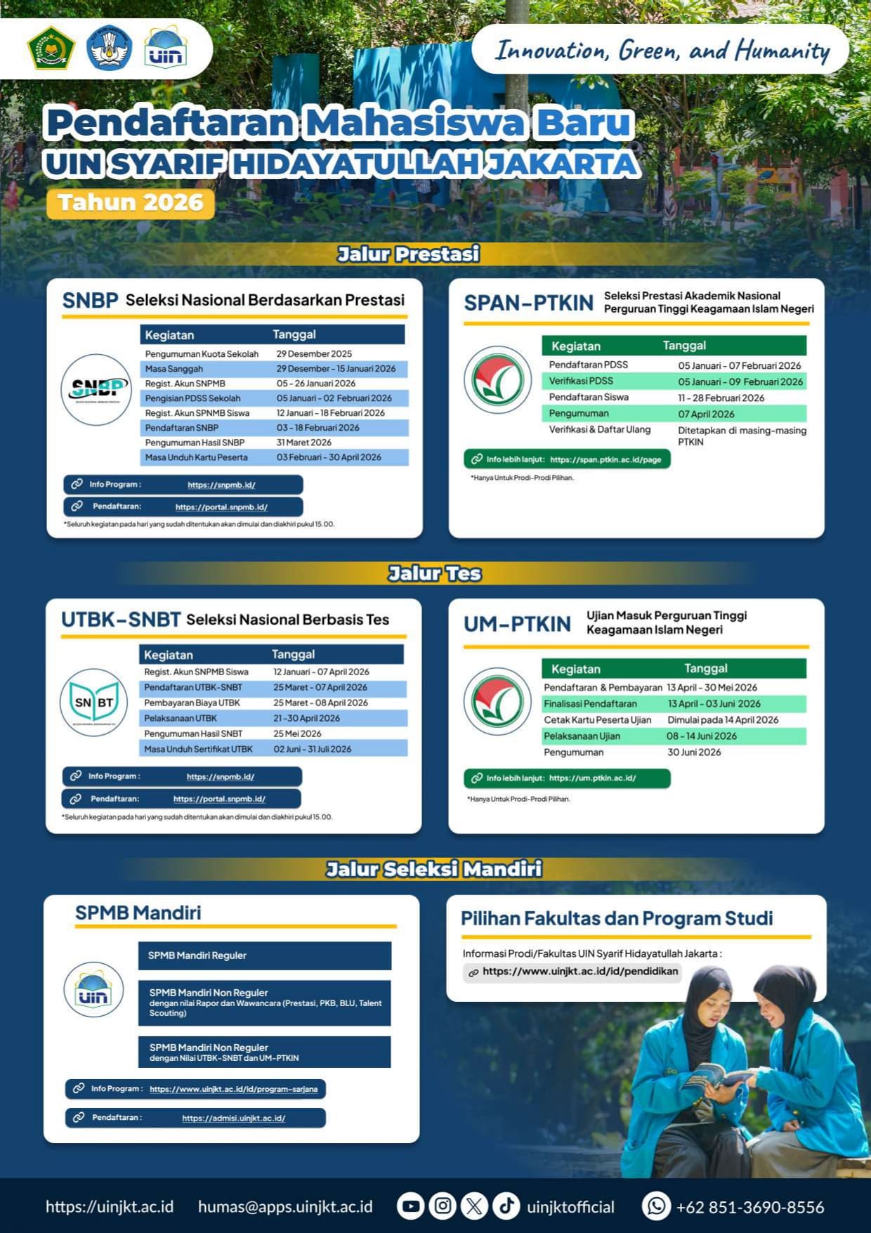 Seluruh informasi terbaru mengenai proses seleksi juga dapat diakses secara berkala melalui laman resmi spmb.uinjkt.ac.id atau uinjkt.ac.id