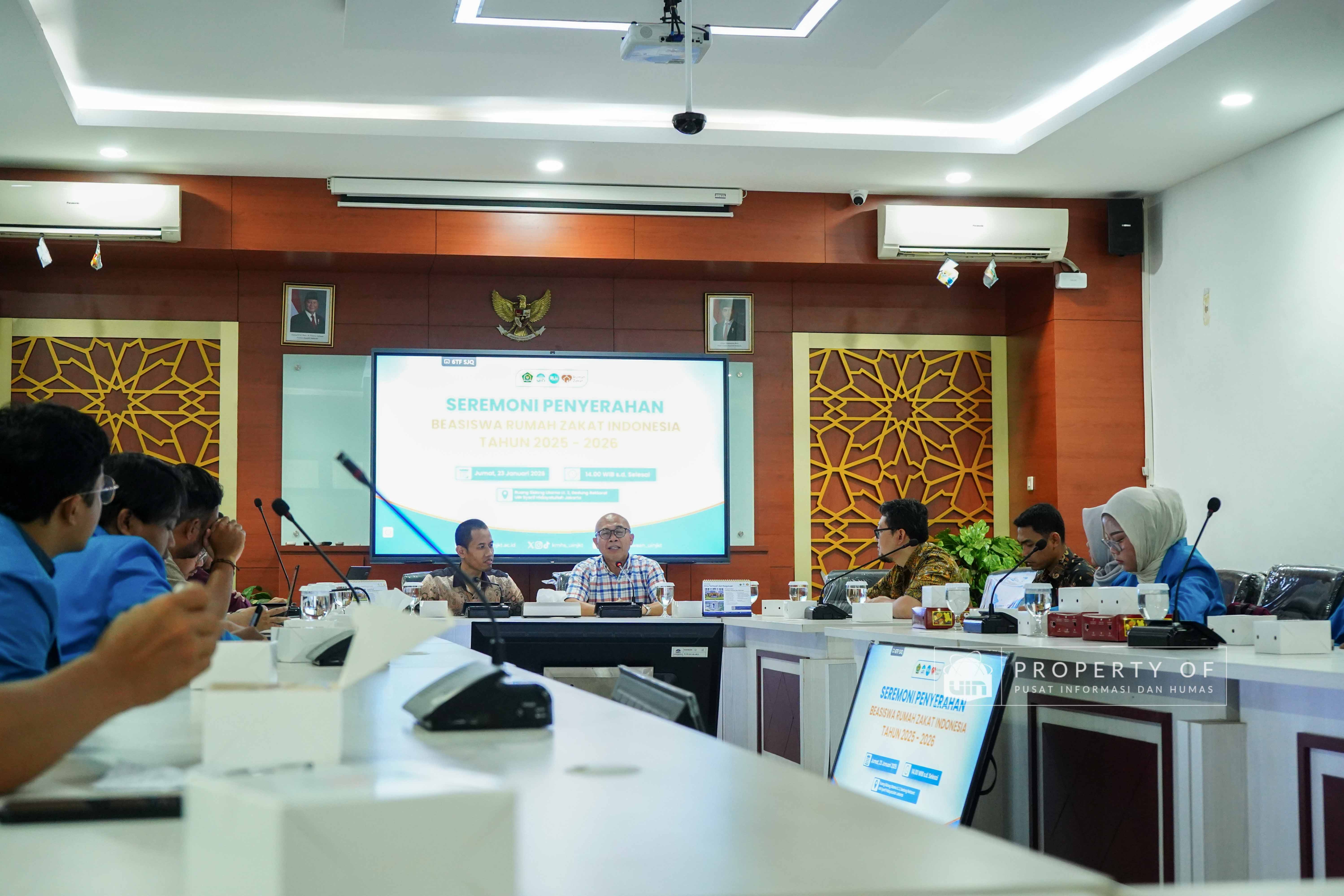 Ruang Sidang Utama, Berita UIN Online — UIN Syarif Hidayatullah Jakarta menggelar seremoni penyerahan Beasiswa Rumah Zakat Indonesia kepada delapan mahasiswa penerima manfaat beasiswa, Jum’at (23/01/2026). Melalui program ini, Rumah Zakat Indonesia kembali menegaskan komitmennya dalam mendukung pendidikan tinggi, tidak hanya melalui bantuan finansial, tetapi juga dengan mendorong mahasiswa untuk aktif berkontribusi dalam kegiatan sosial, penelitian, dan pengabdian kepada masyarakat.