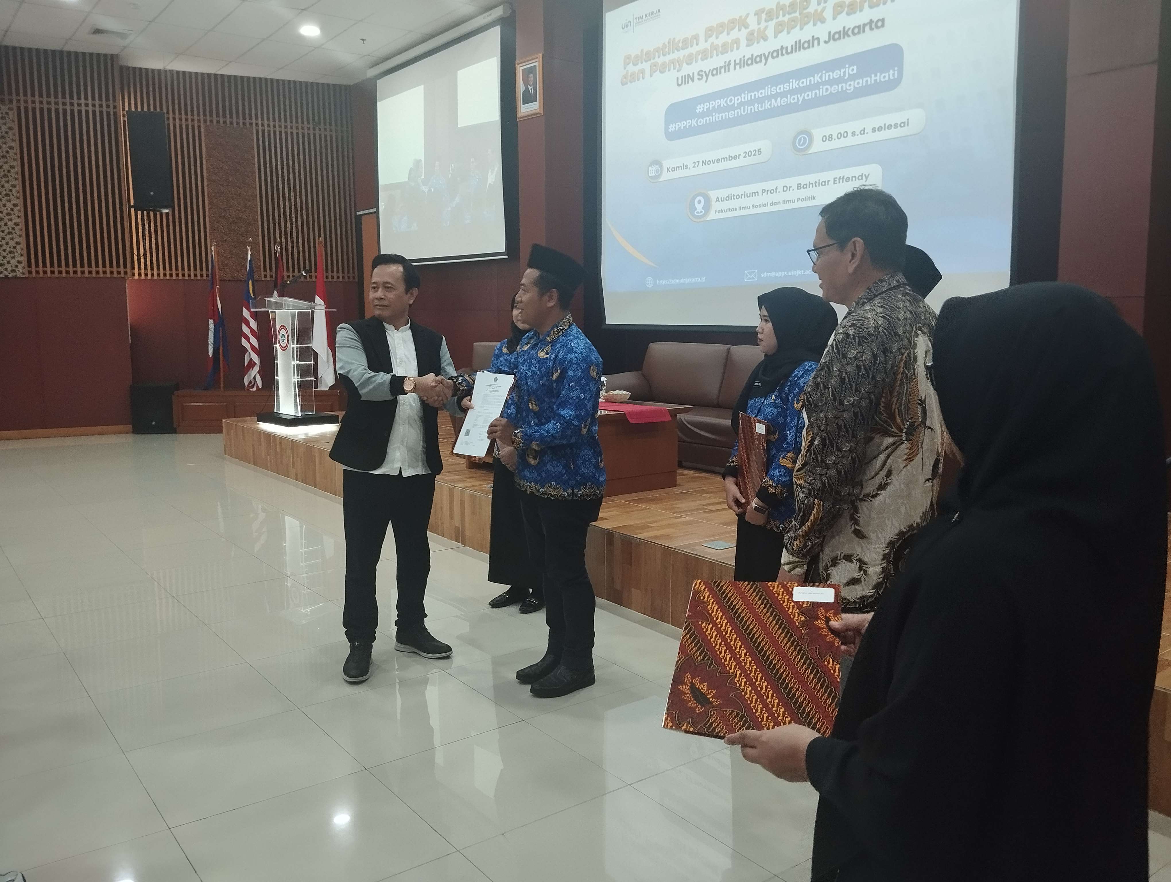 Fakultas Ilmu Sosial Politik, Berita UIN Online - UIN Syarif Hidayatullah Jakarta laksanakan pelantikan PPPK tahap dua optimalisasi dan penyerahan SK PPPK paruh waktu yang dilaksanakan di Auditorium Prof. Dr. Bachtiar Effendy, Kamis (27/11/2025). Pelantikan diikuti dengan total peserta 188 dengan 85 Pegawai PPPK paruh waktu dan 103 pegawai optimalisasi beserta tenaga pendidik.