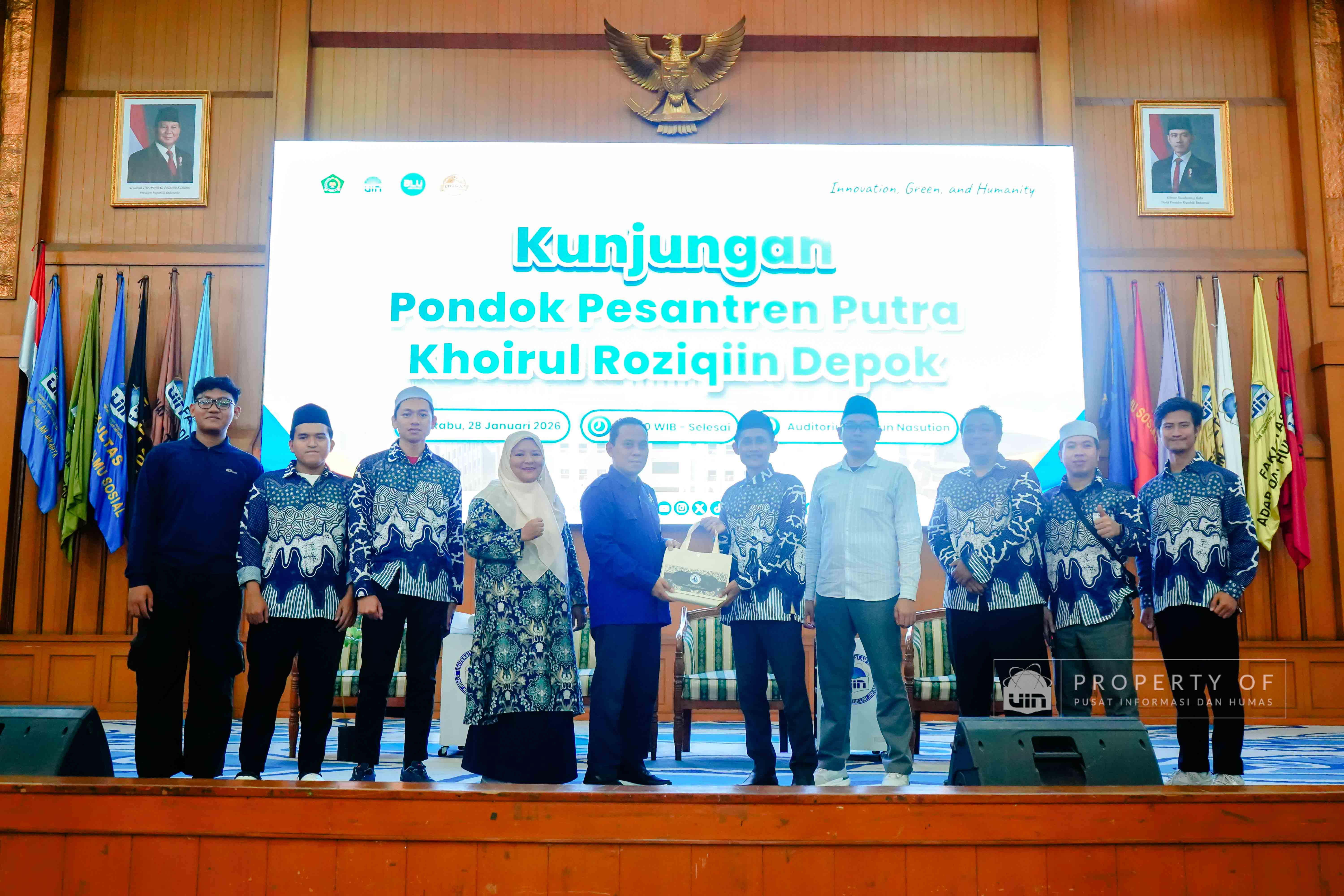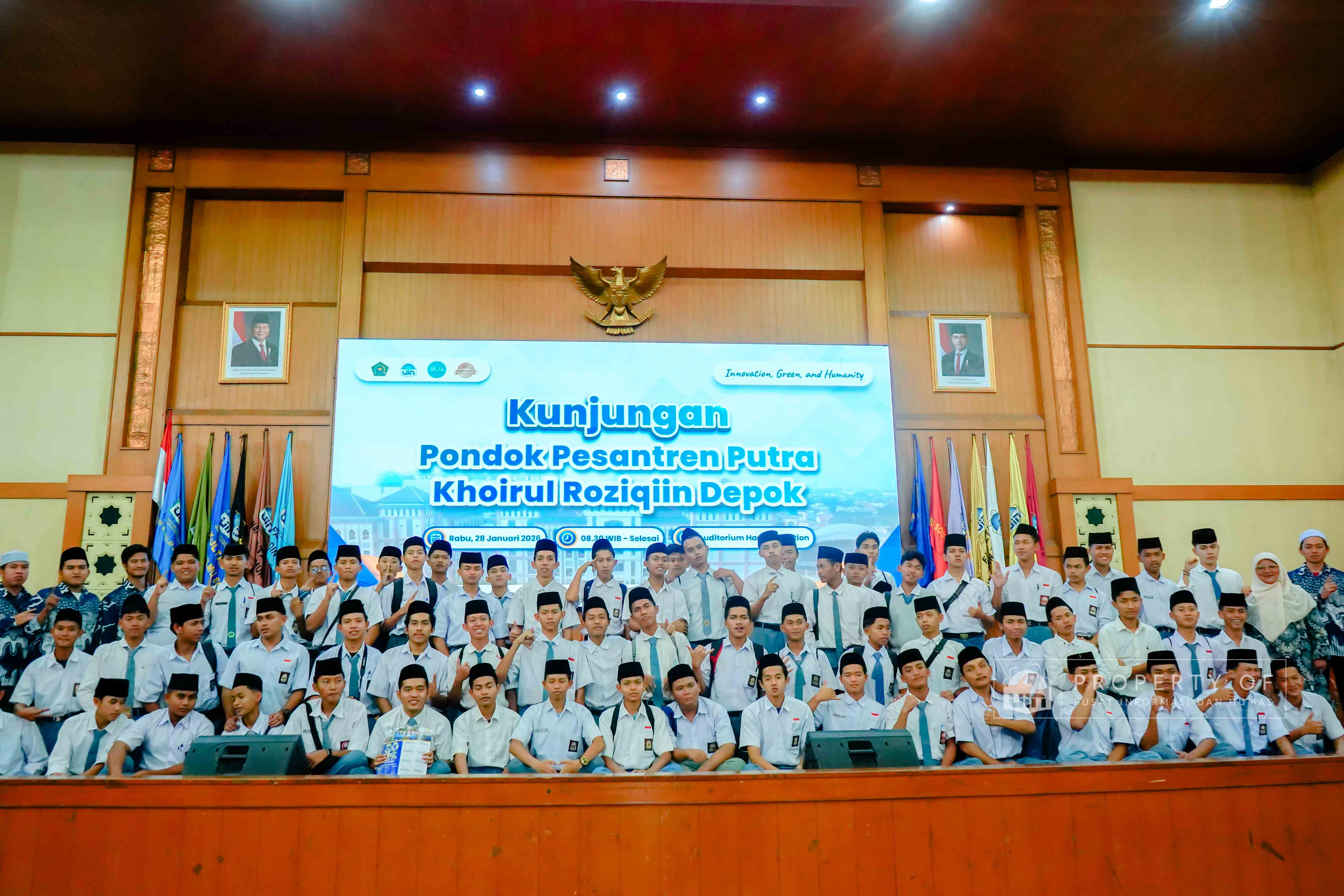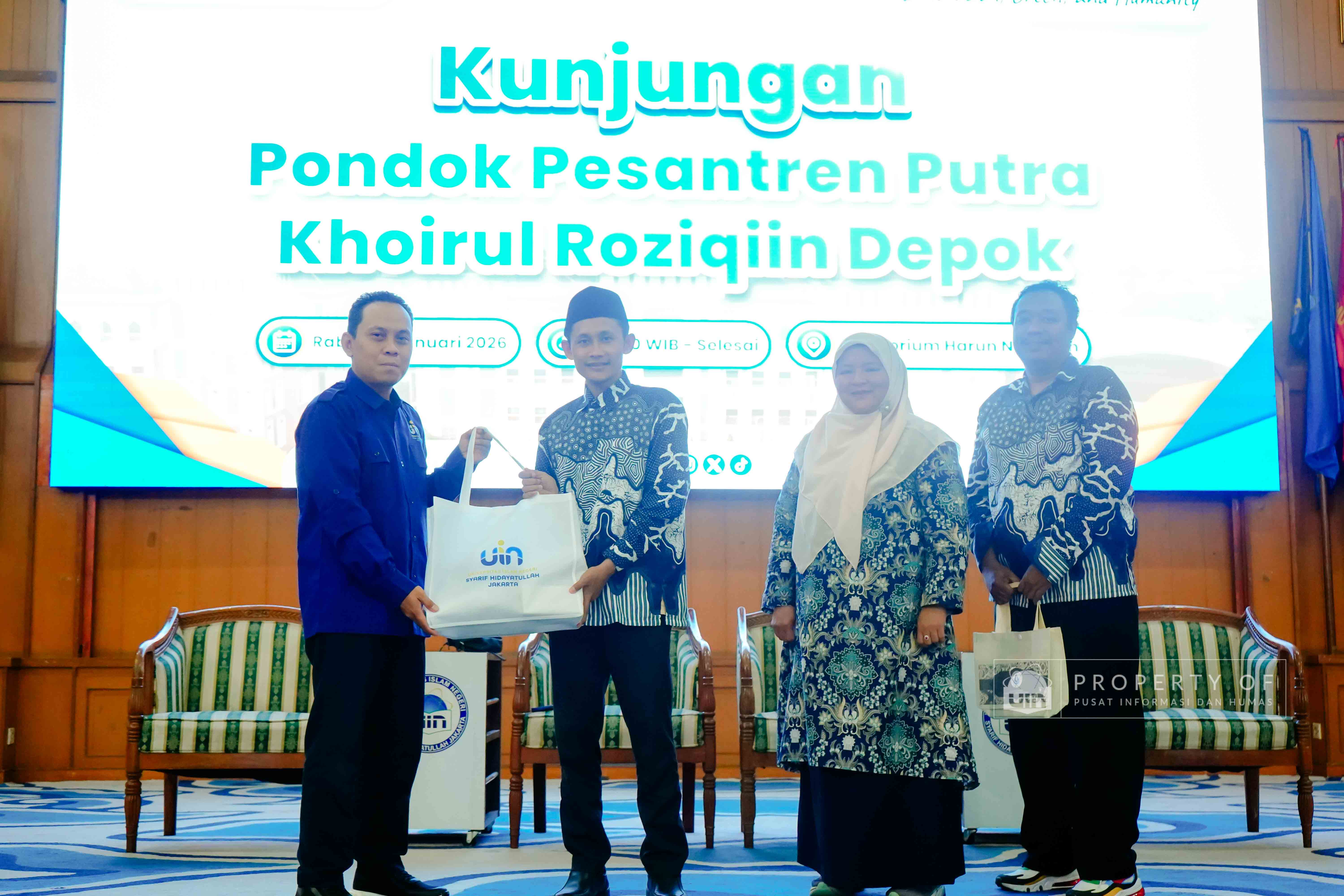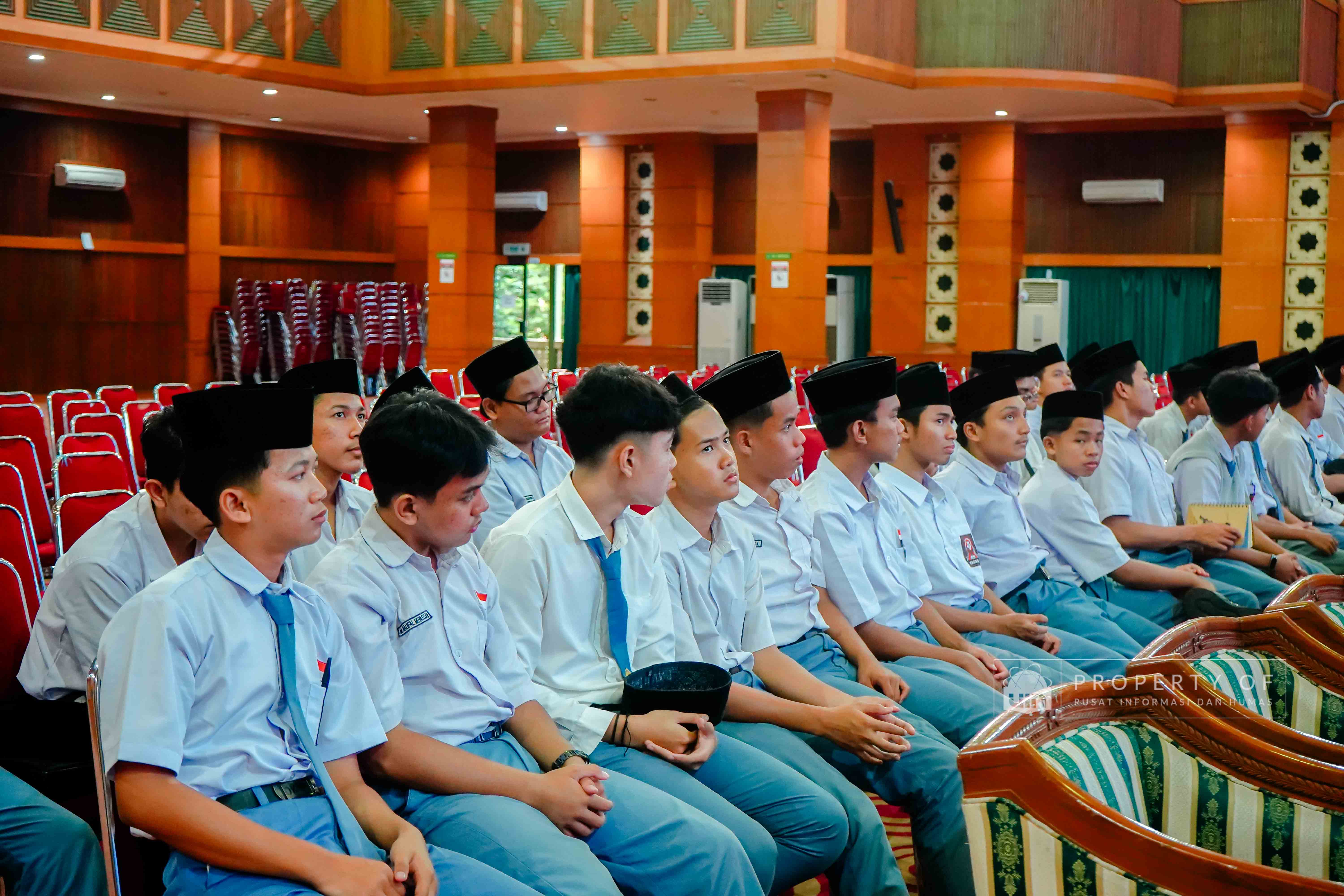 UIN Syarif Hidayatullah Jakarta menerima kunjungan rihlah ilmiah dari Pondok Pesantren Putra Khoirul Roziqin, Beji, Depok, yang berlangsung di Auditorium Harun Nasution pada Rabu (28/01/2026). Kunjungan ini bertujuan mengenalkan lingkungan akademik, ragam keilmuan, serta budaya Green Campus kepada para santri dan pendidik, sekaligus memberikan gambaran tentang kehidupan perkuliahan dan peluang pengembangan diri di lingkungan perguruan tinggi. (Fotografer: Talitha Zhafirah Qutratu'ain/Teks: Tiara Septiana Dewi/Pusat Informasi dan Humas UIN Jakarta)