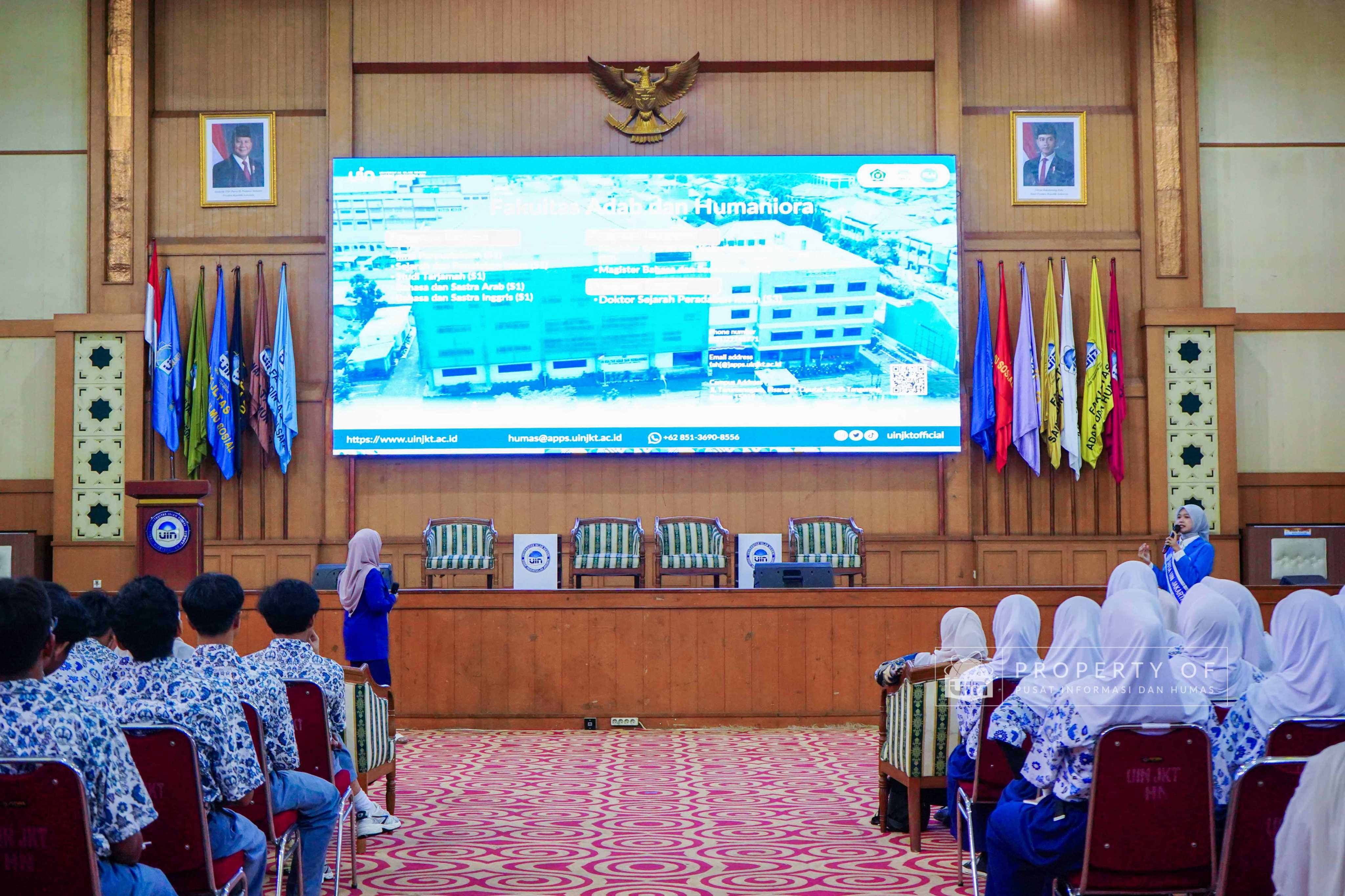 Presentasi profil UIN Jakarta disampaikan oleh Dian Nurbani Adestiani S.Pd., selaku perwakilan dari PIH UIN Jakarta dan didampingi oleh Duta UIN Jakarta, Egidia Indah Lestari. Keduanya memberikan pemaparan seputar fakultas, program studi, dan jalur seleksi yang terdapat di UIN Jakarta.