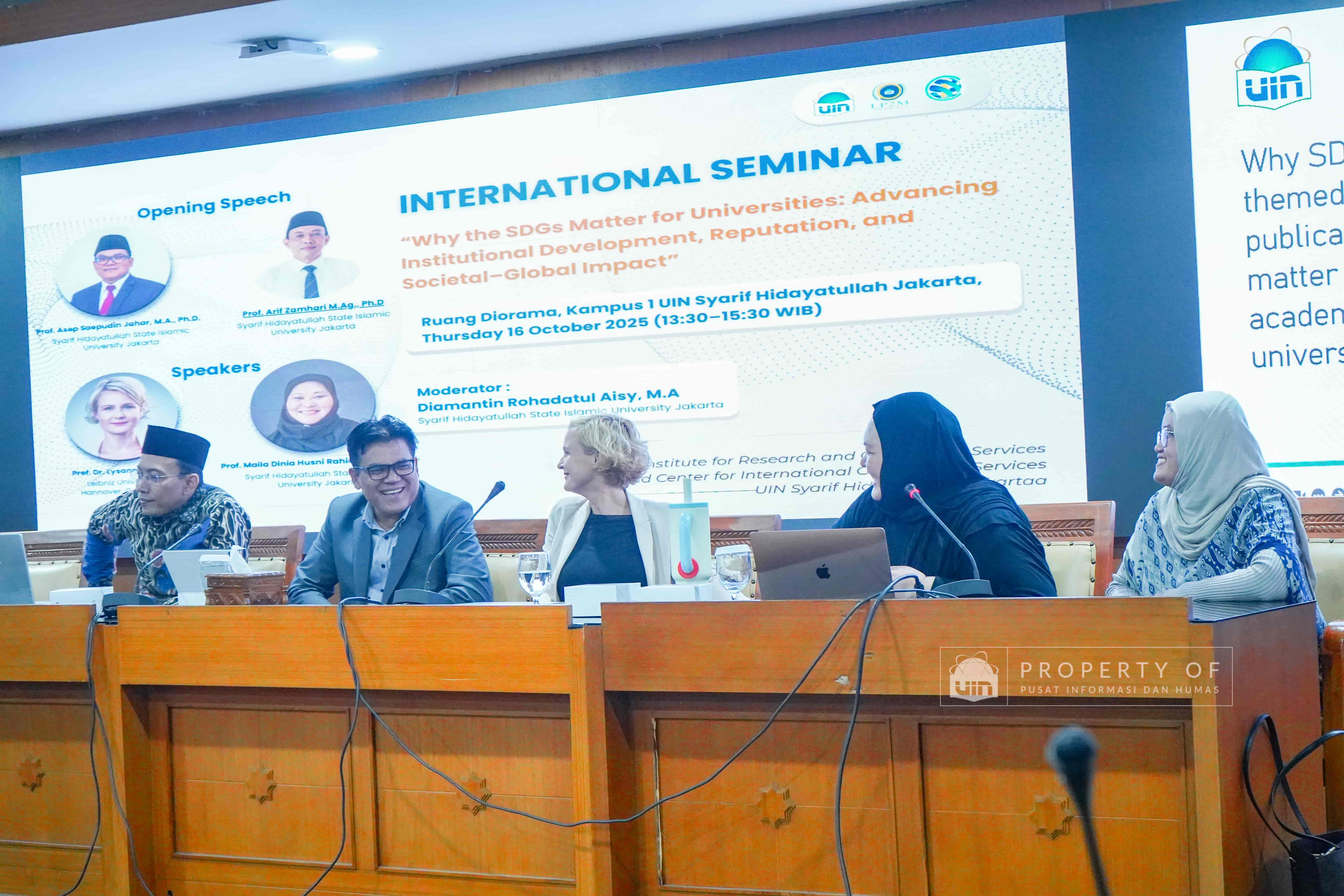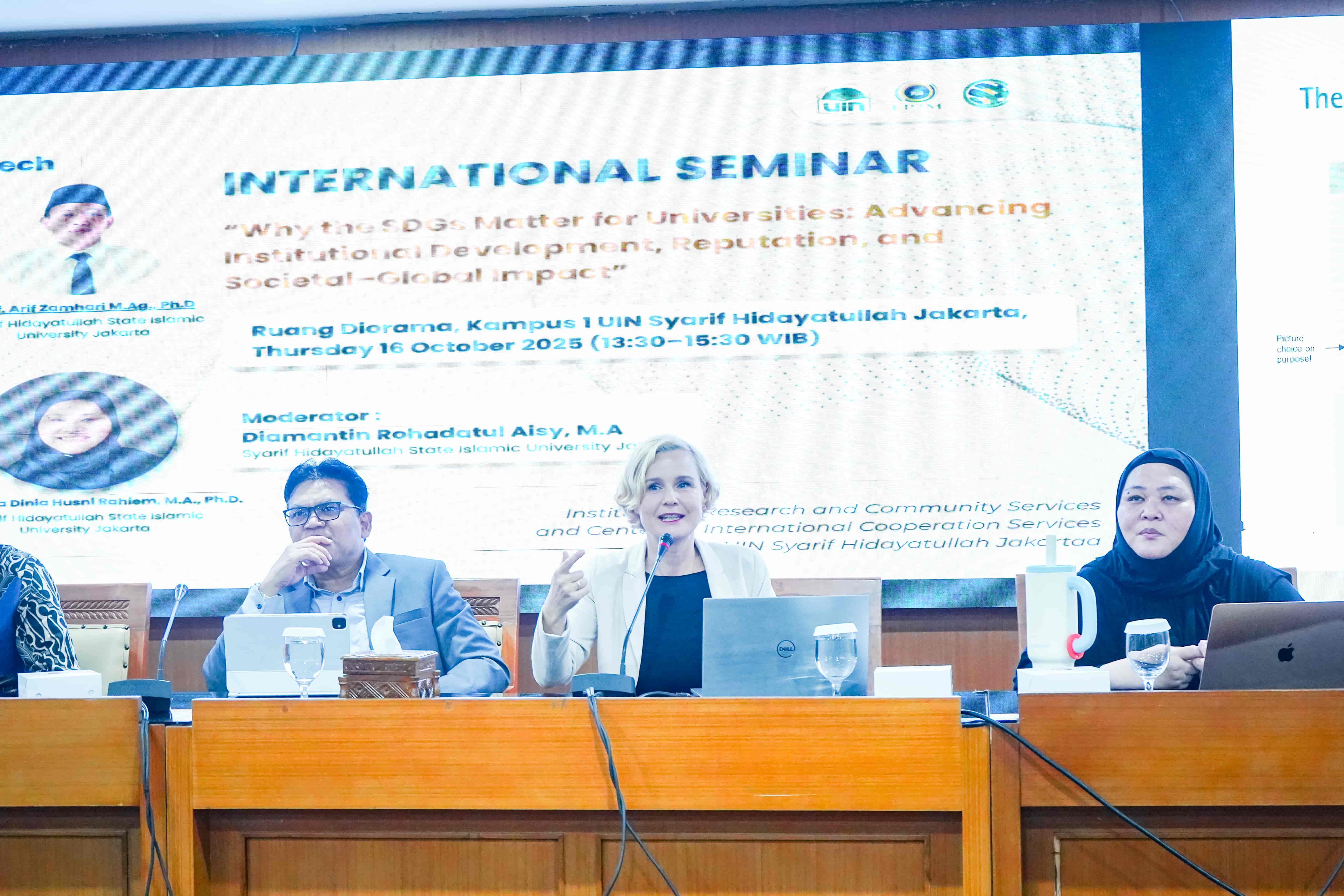 Ruang Diorama, Berita UIN Online - Lembaga Penelitian dan Pengabdian kepada Masyarakat (LP2M) UIN Syarif Hidayatullah Jakarta selenggarakan International Seminar dengan tema “Why the SDGs Matter for Universities: Advancing Institutional Development, Reputation, and Societal-Global Impact” pada Kamis (16/10/2025). Diselenggarakan di Ruang Diorama, Lantai Dasar Auditorium Harun Nasution dengan speaker spesialis dalam penelitian pendidikan empiris Leibniz University, Hannover, Germany, Prof. Dr. Lysann Zander.